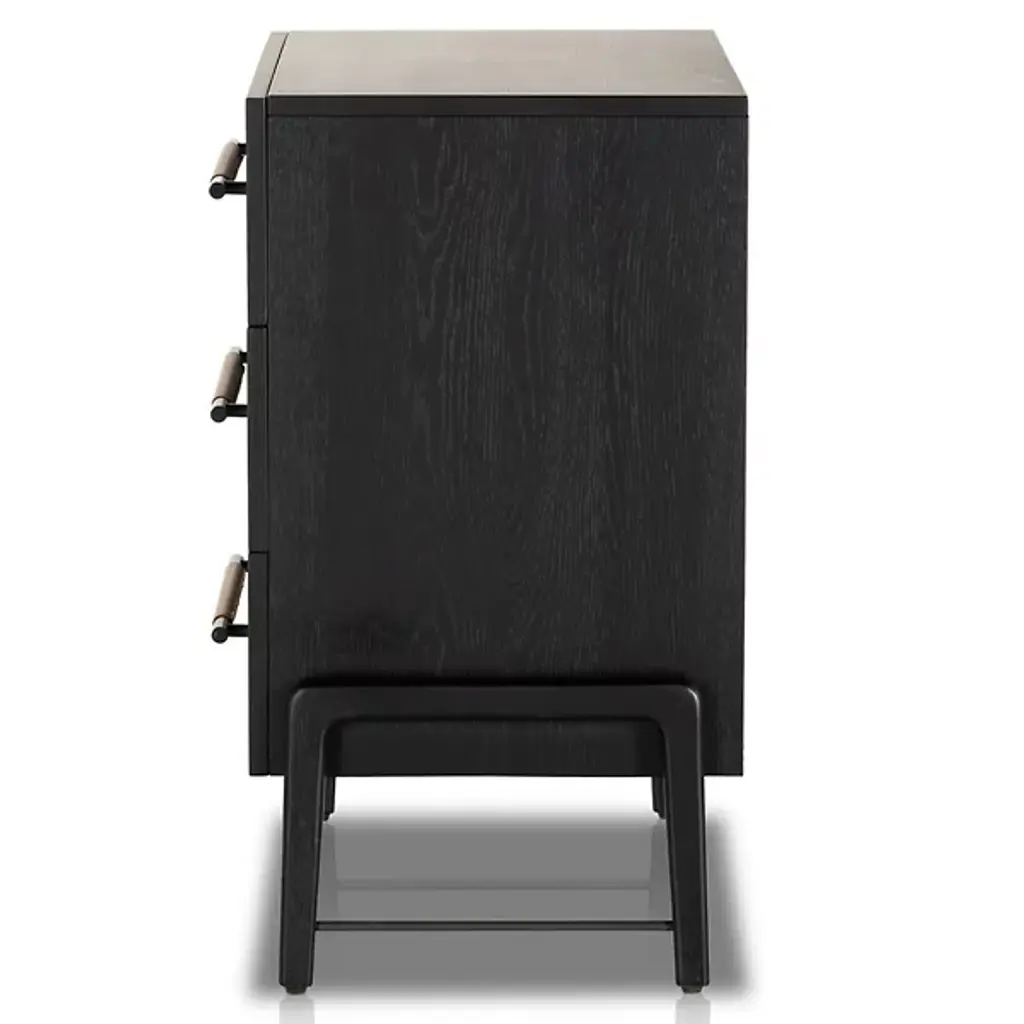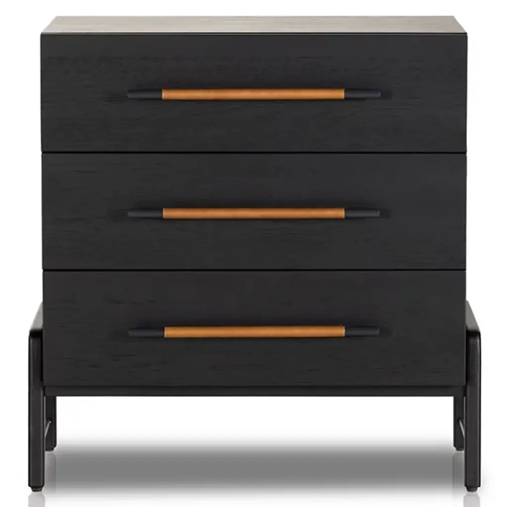The Rosedale 3 Drawer Dresser from Four Hands is a delightful, refined design featuring a strong oak construction. It is elegant and includes three spacious drawers with iron bracket-style pulls, each wrapped in tan top-grain leather for a touch of natural sophistication. Made in Vietnam, this dresser shows off quality craftsmanship with refined contemporary design, making it a great addition to any modern bedroom. The dresser is compliant with the STURDY Act, ensuring safety while offering plenty of storage.