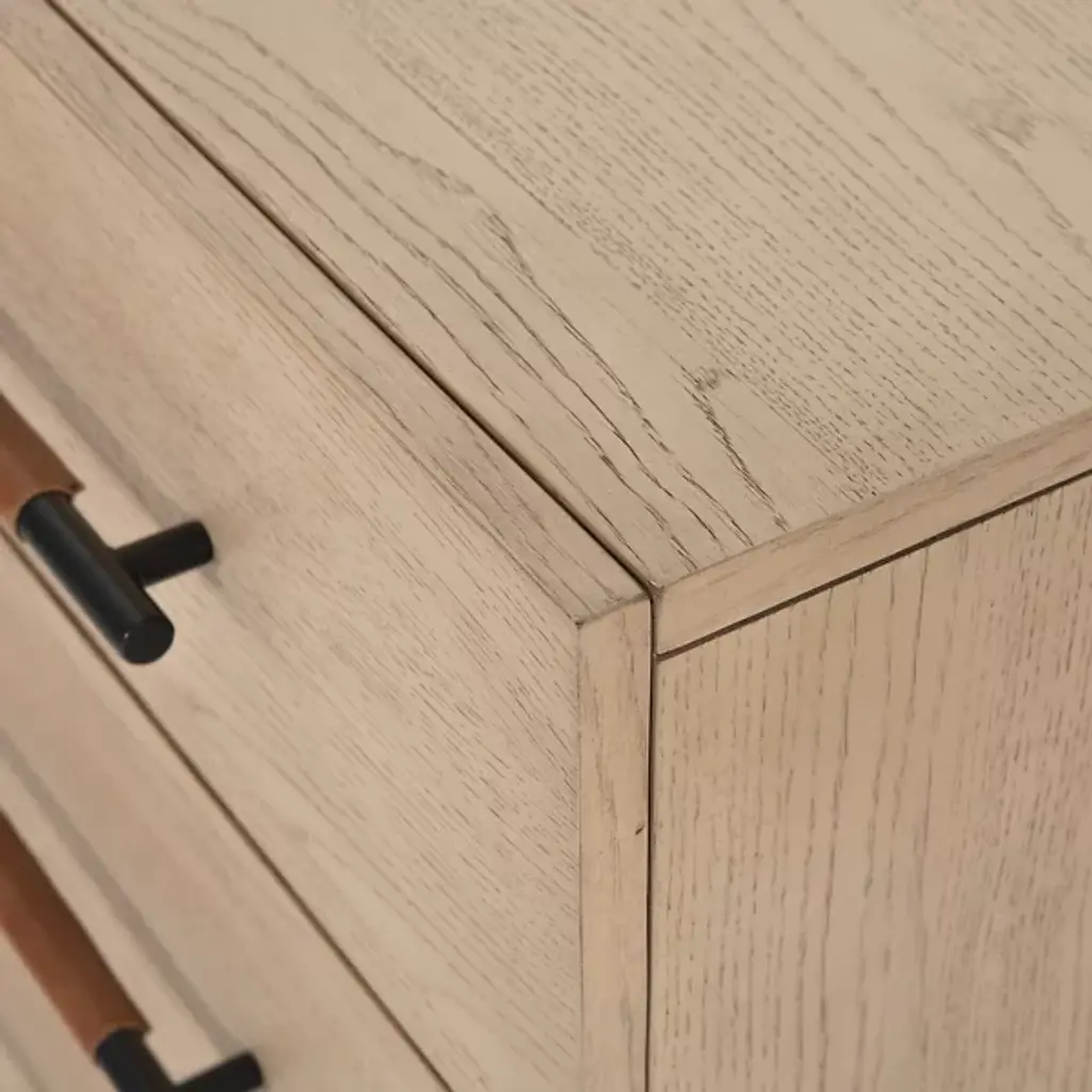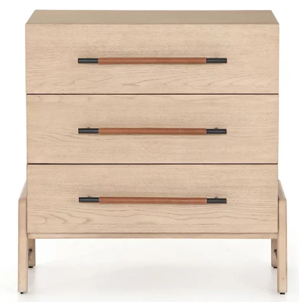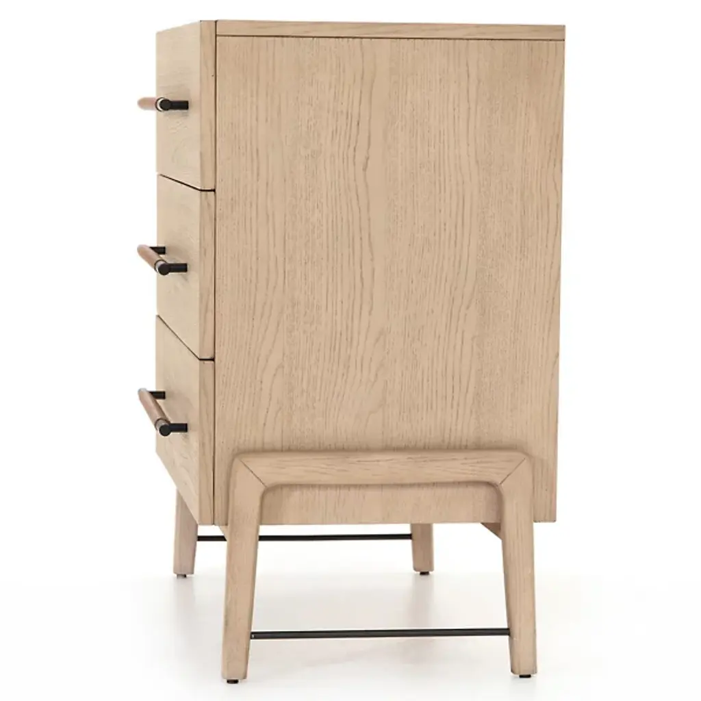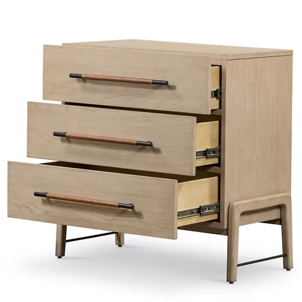 The Rosedale 3 Drawer Dresser from Four Hands is a delightful, refined design featuring a strong oak construction. It is elegant and includes three spacious drawers with iron bracket-style pulls, each wrapped in tan top-grain leather for a touch of natural sophistication. Made in Vietnam, this dresser shows off quality craftsmanship with refined contemporary design, making it a great addition to any modern bedroom. The dresser is compliant with the STURDY Act, ensuring safety while offering plenty of storage.