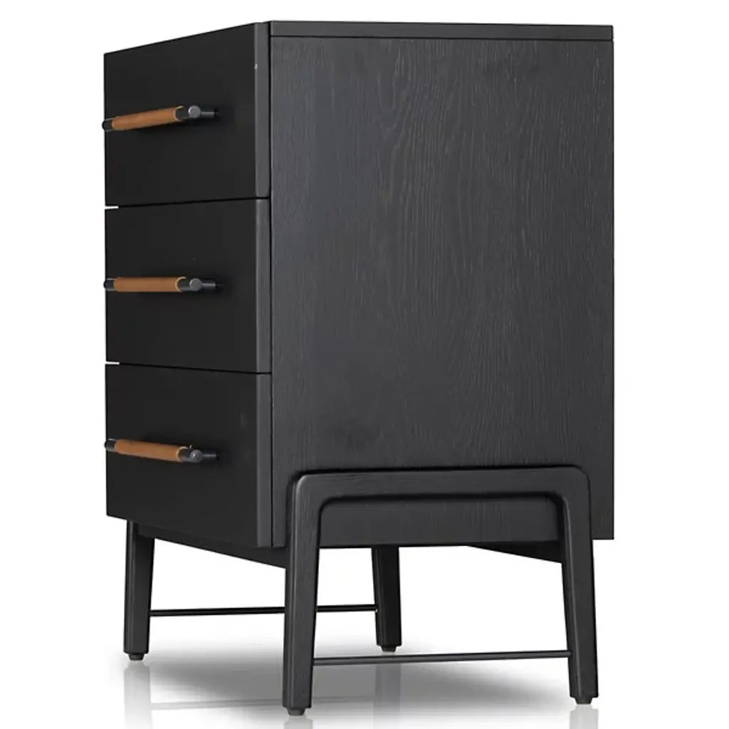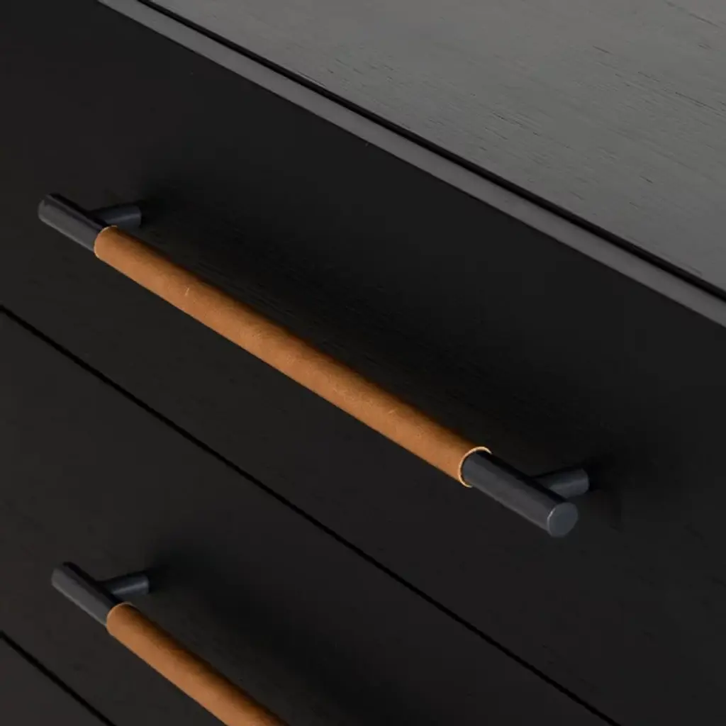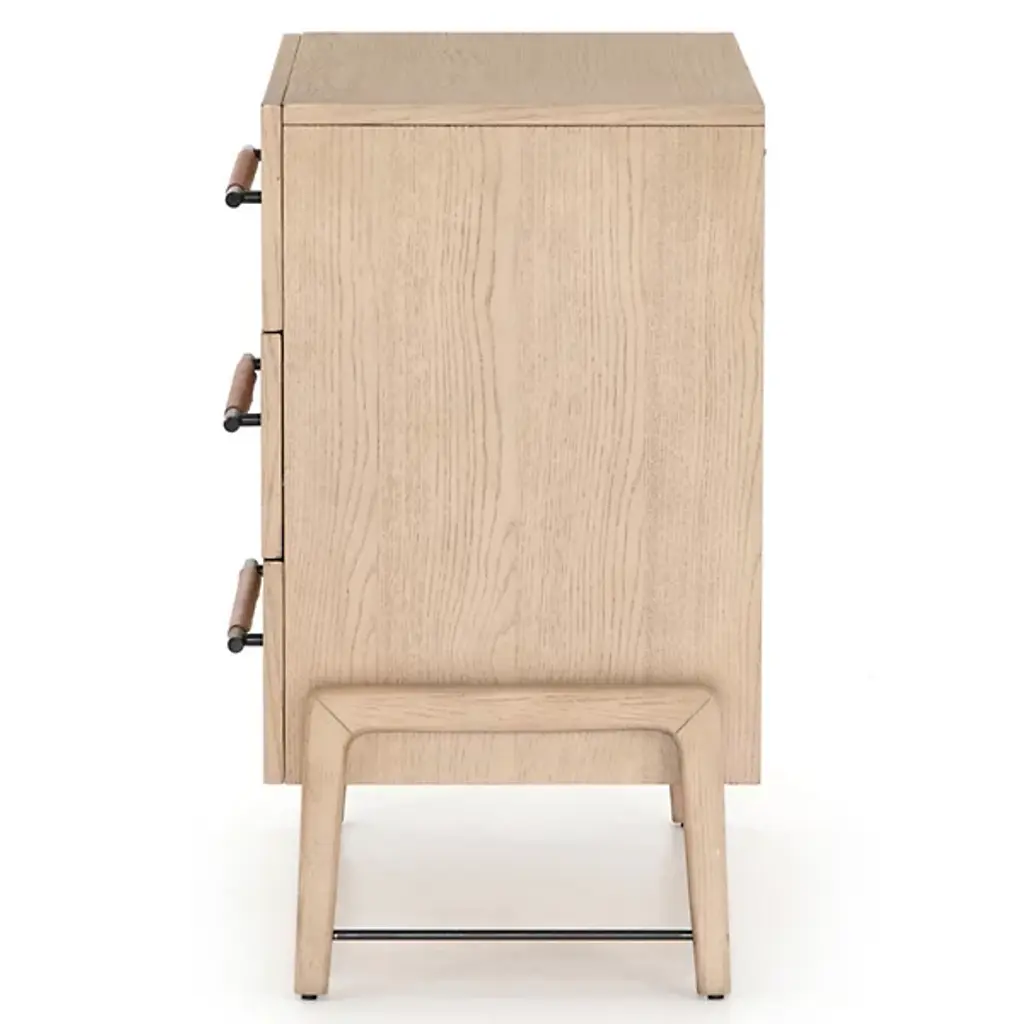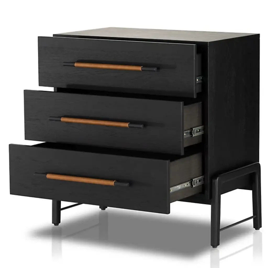 The Rosedale 3 Drawer Dresser from Four Hands is a delightful, refined design featuring a strong oak construction. It is elegant and includes three spacious drawers with iron bracket-style pulls, each wrapped in tan top-grain leather for a touch of natural sophistication. Made in Vietnam, this dresser shows off quality craftsmanship with refined contemporary design, making it a great addition to any modern bedroom. The dresser is compliant with the STURDY Act, ensuring safety while offering plenty of storage.