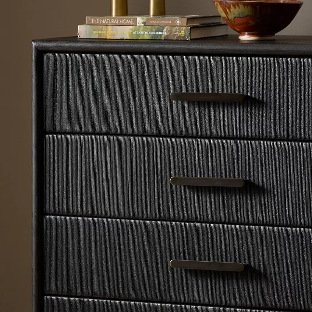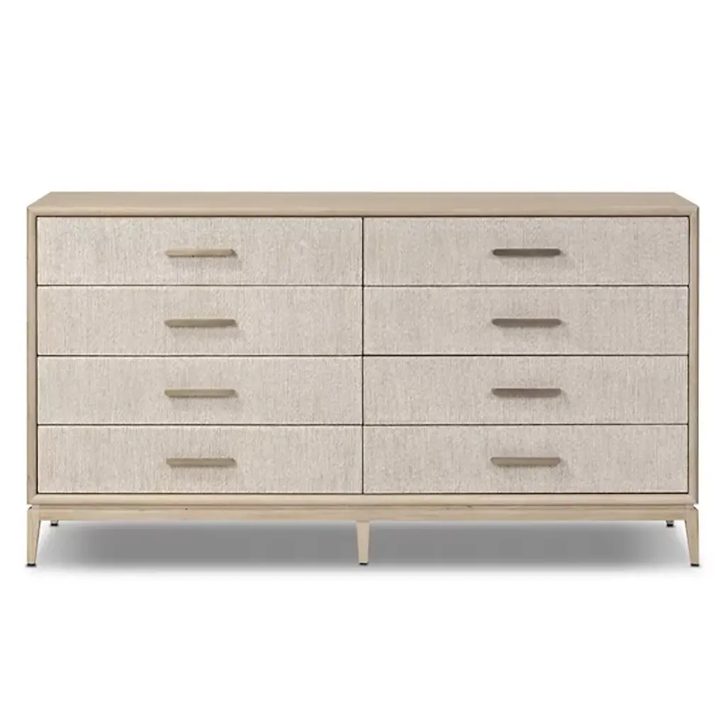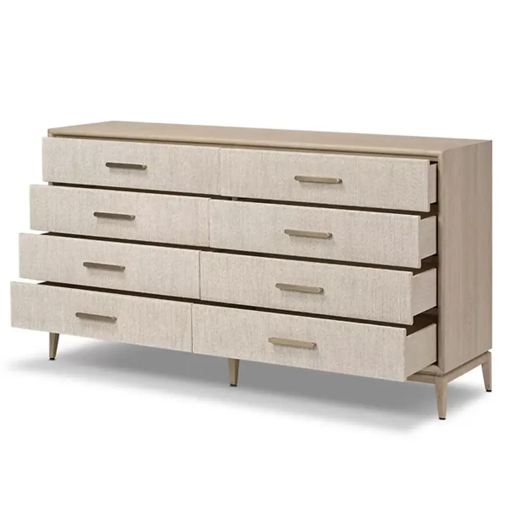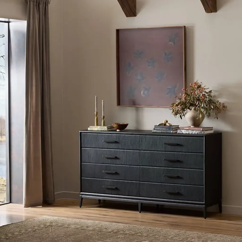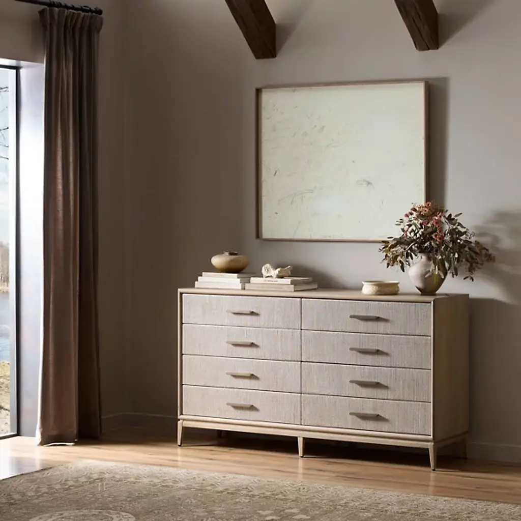 The Rosenell 8 Drawer Dresser from Four Hands maximizes storage potential with its expanded drawer configuration. This 100-pound capacity piece employs woven paper cords across eight drawer fronts, creating a rhythmic pattern that draws from Scandinavian design traditions. The additional drawers offer enhanced organization options while maintaining a sensible proportion. Oak construction ensures durability, while the cord elements add organic texture to the design. The dresser's linear form stands on refined legs that provide stability without heaviness, making it a practical storage solution with artistic merit.