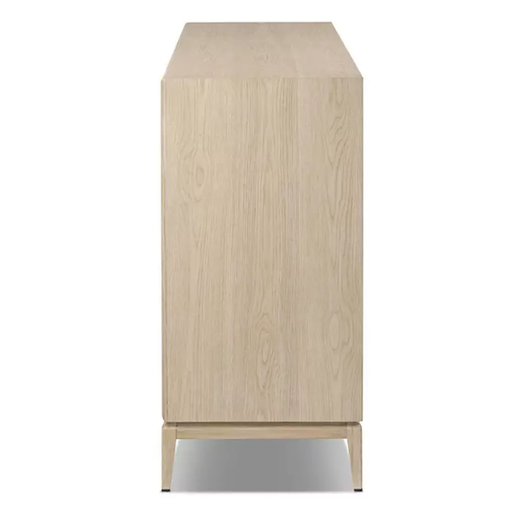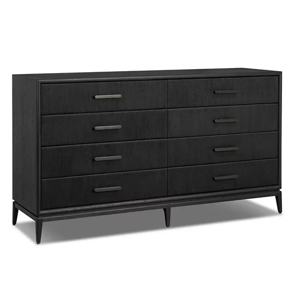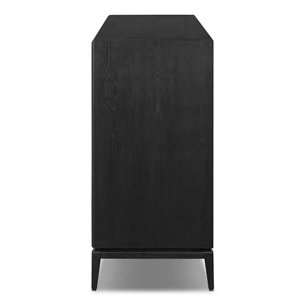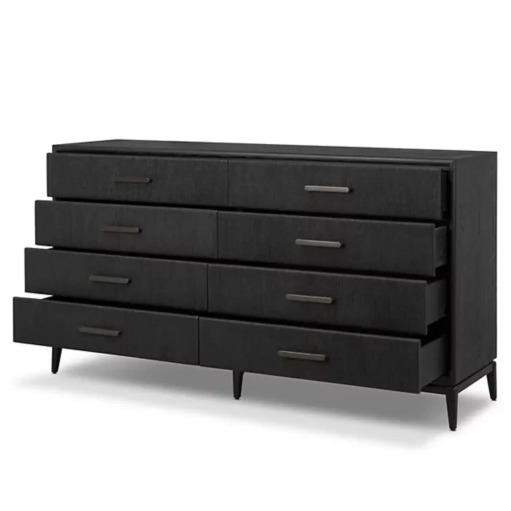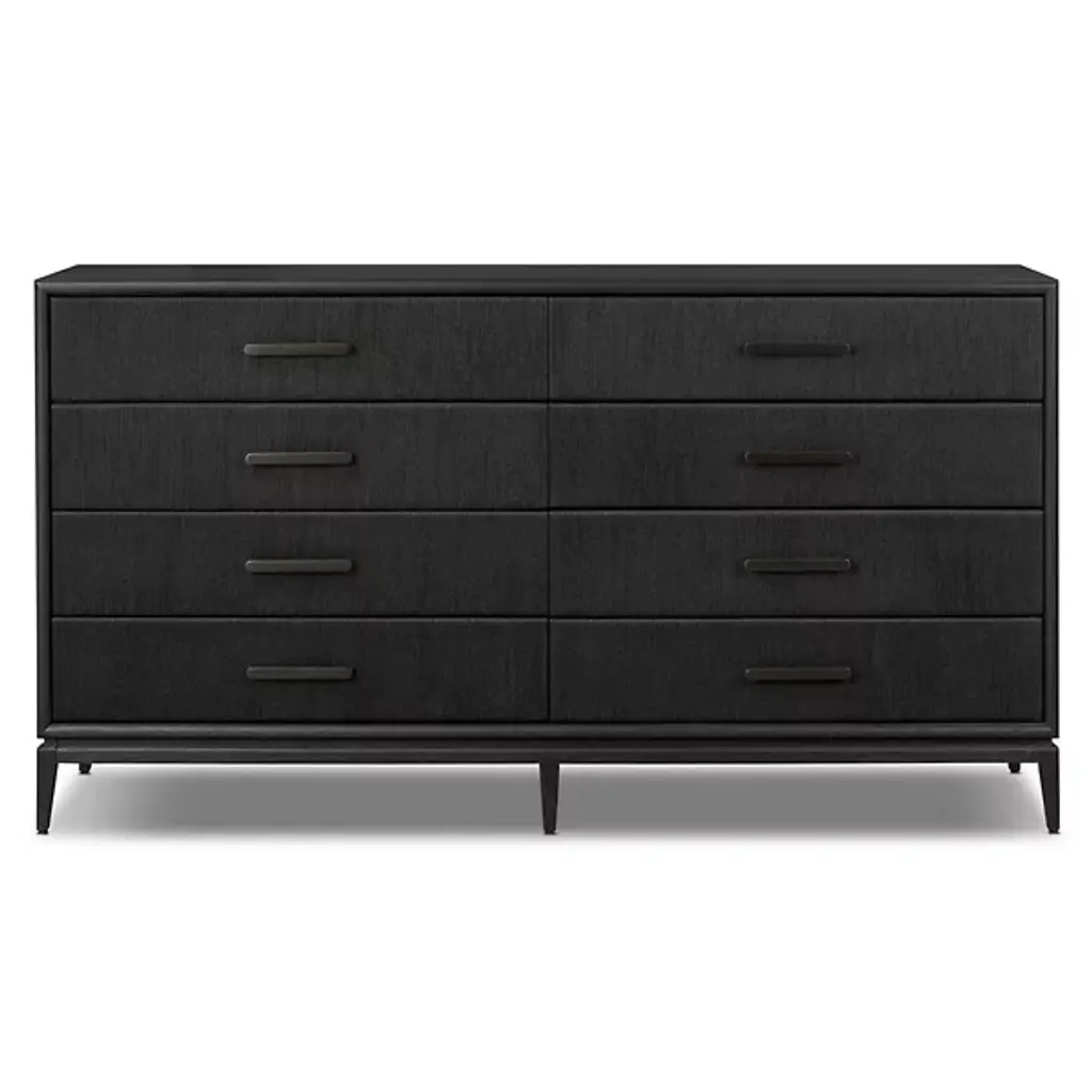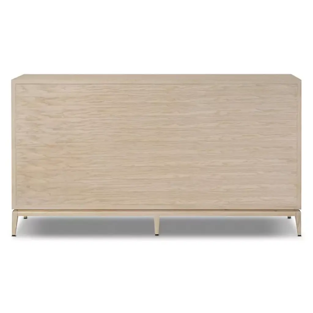 The Rosenell 8 Drawer Dresser from Four Hands maximizes storage potential with its expanded drawer configuration. This 100-pound capacity piece employs woven paper cords across eight drawer fronts, creating a rhythmic pattern that draws from Scandinavian design traditions. The additional drawers offer enhanced organization options while maintaining a sensible proportion. Oak construction ensures durability, while the cord elements add organic texture to the design. The dresser's linear form stands on refined legs that provide stability without heaviness, making it a practical storage solution with artistic merit.