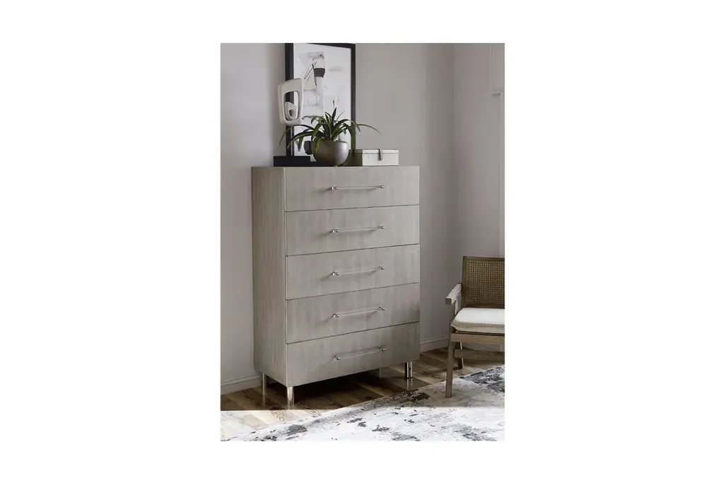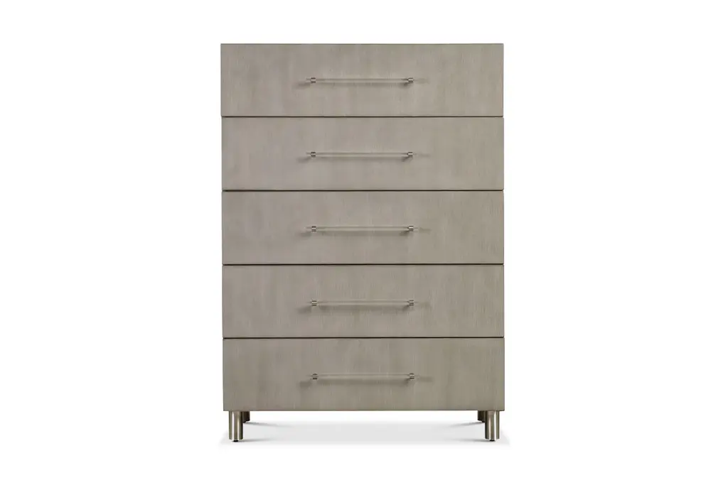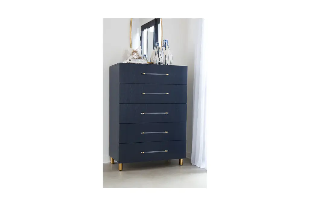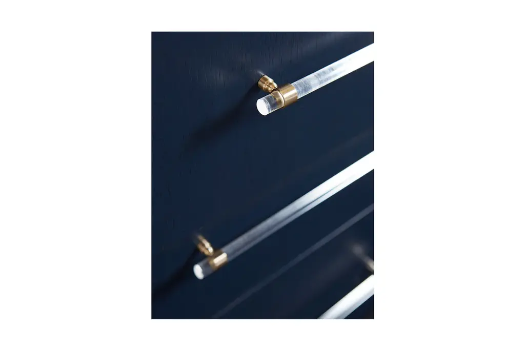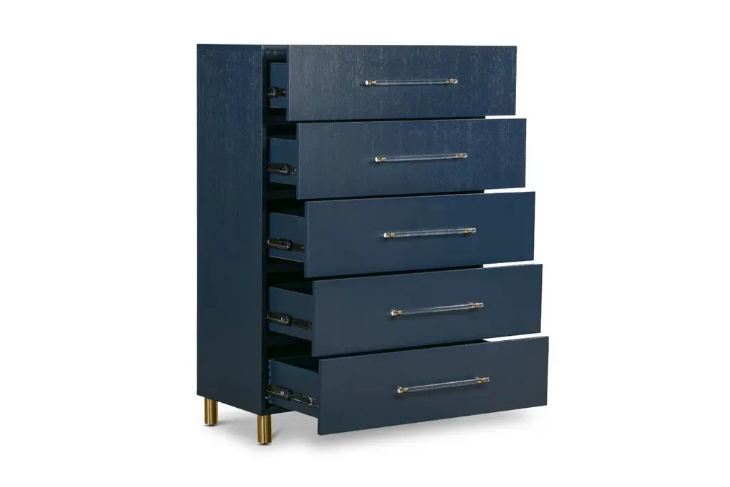 Minimalist edges and organic textures come together in the Roxbury Chest, a showcase of master craftsmanship. Straight-grained oak veneer provides natural texture beneath a bold navy blue or light grey finish. This chest features five spacious drawers, with a removable felt liner in the top drawer, all equipped with smooth ball-bearing glides and acrylic handles. The navy blue version is accented with brass legs and hardware, while the light grey version features stainless steel legs and hardware, giving each color a distinctive, luxurious touch.