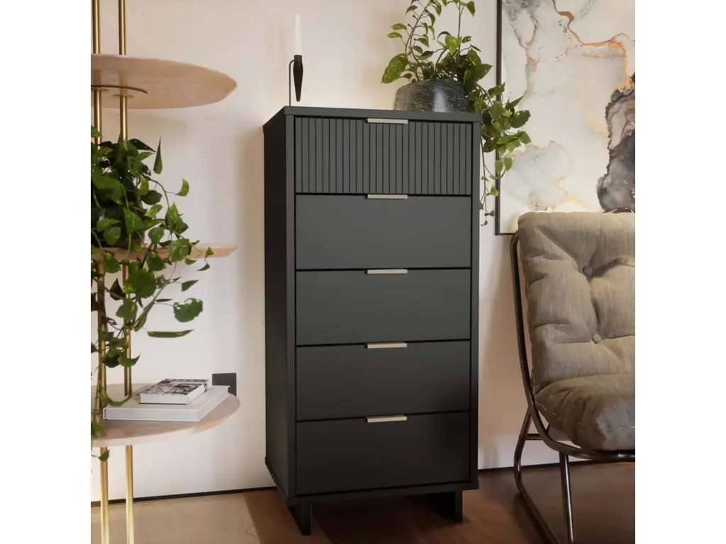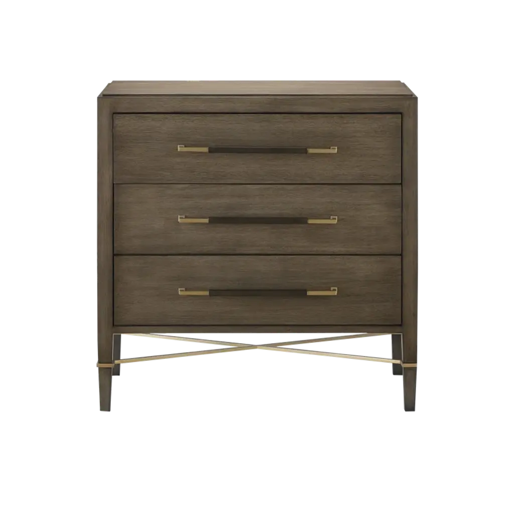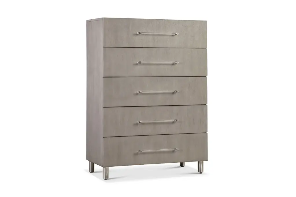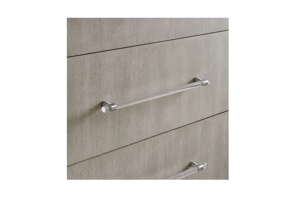 Minimalist edges and organic textures come together in the Roxbury Chest, a showcase of master craftsmanship. Straight-grained oak veneer provides natural texture beneath a bold navy blue or light grey finish. This chest features five spacious drawers, with a removable felt liner in the top drawer, all equipped with smooth ball-bearing glides and acrylic handles. The navy blue version is accented with brass legs and hardware, while the light grey version features stainless steel legs and hardware, giving each color a distinctive, luxurious touch.