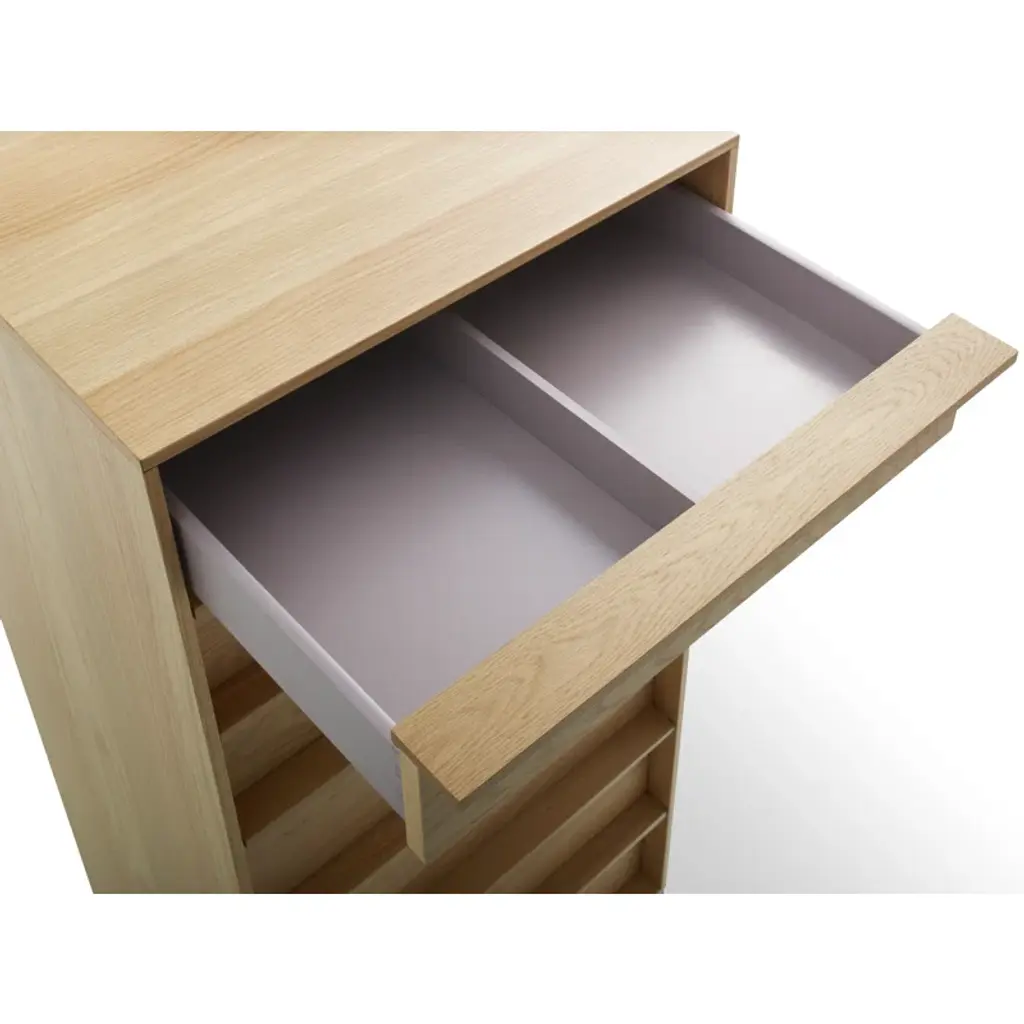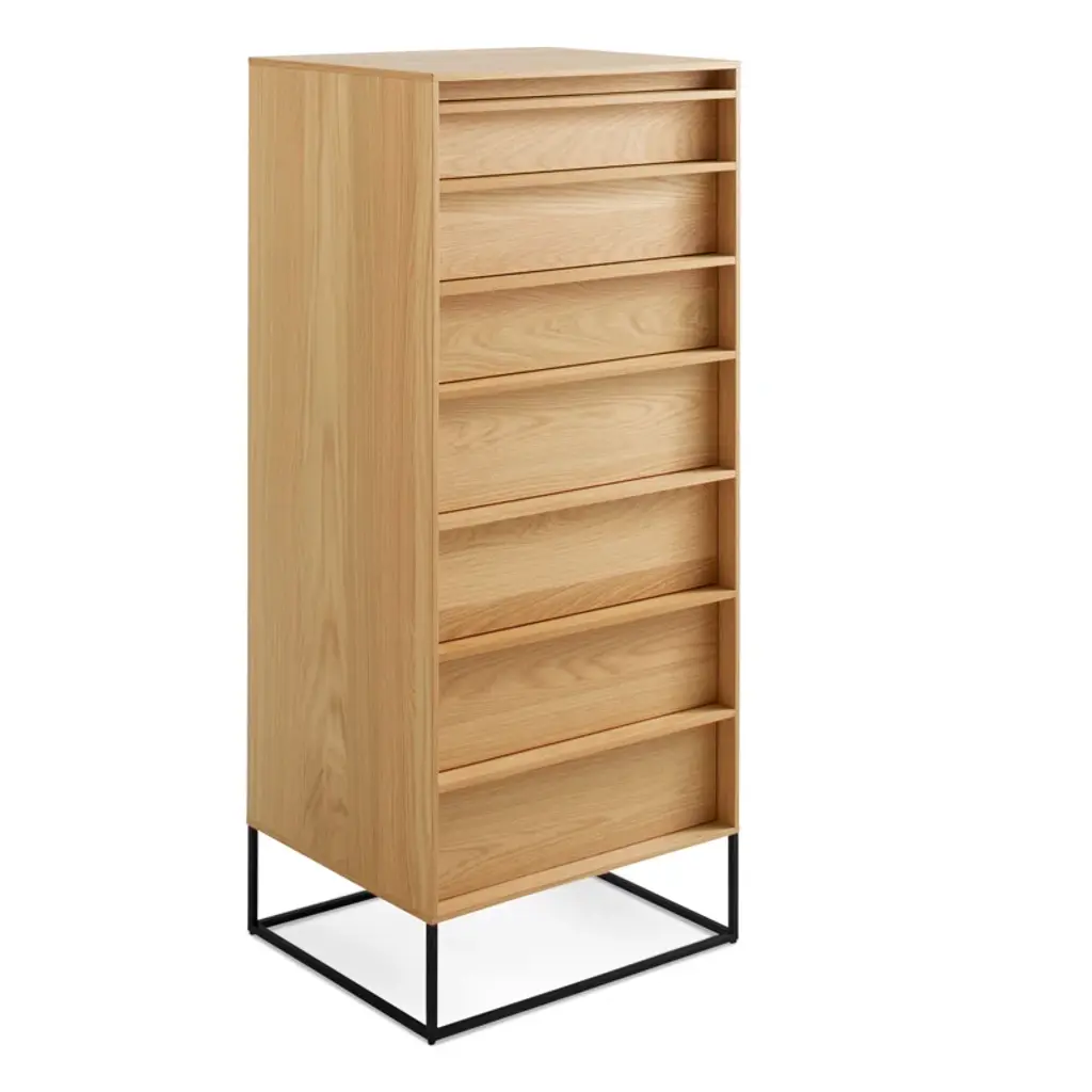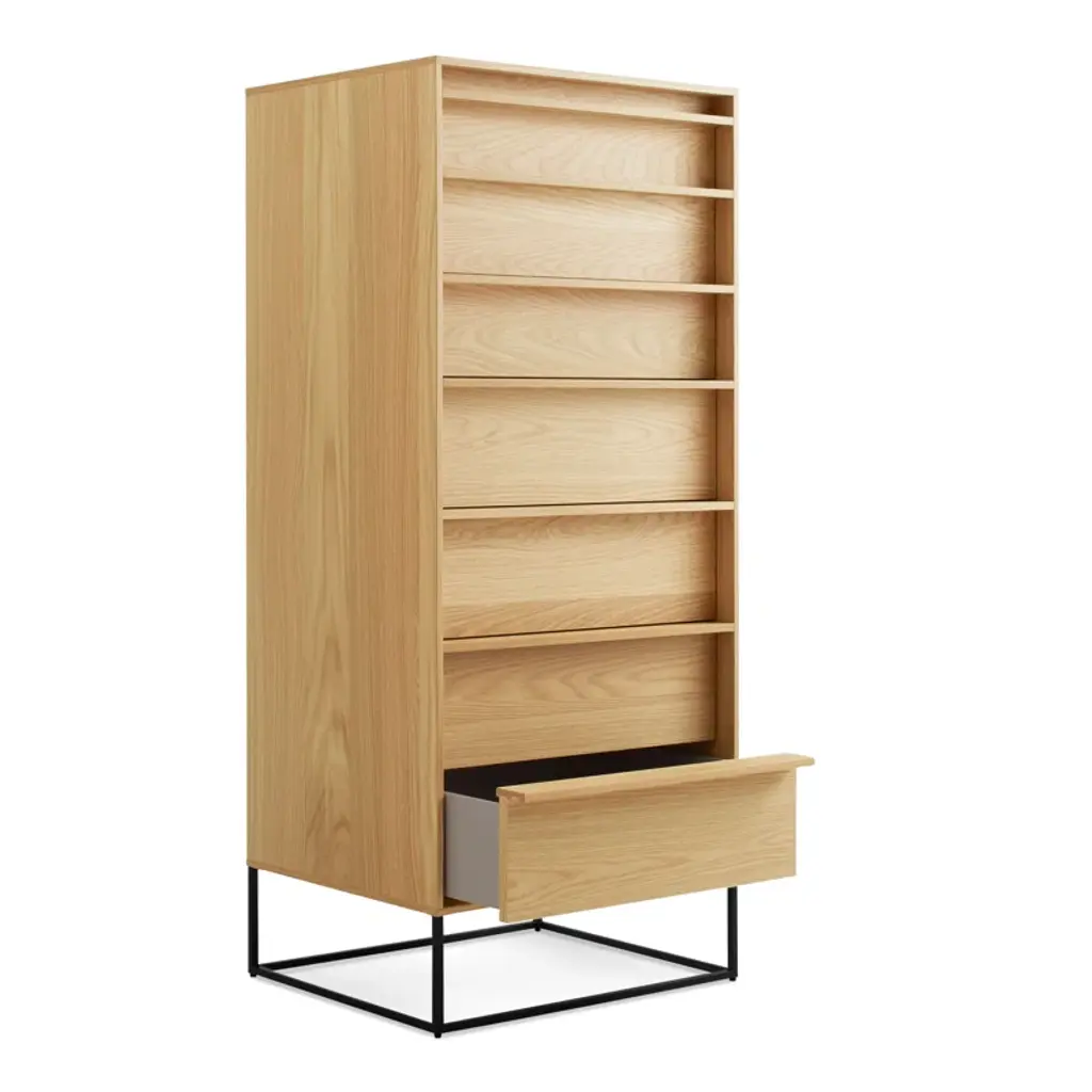 The Rule collection serves up well-considered planes and angles that are ready to slay clutter in any room. Deep-set drawer fronts, detailed by a wood pull, reinforce the linear design and create a seductive shadow line. Dusk-colored drawer and door interiors provide a surprise dose of color while a square steel base ties it all together to form an elegantly, uncomplicated form. All with soft-close drawers and doors.