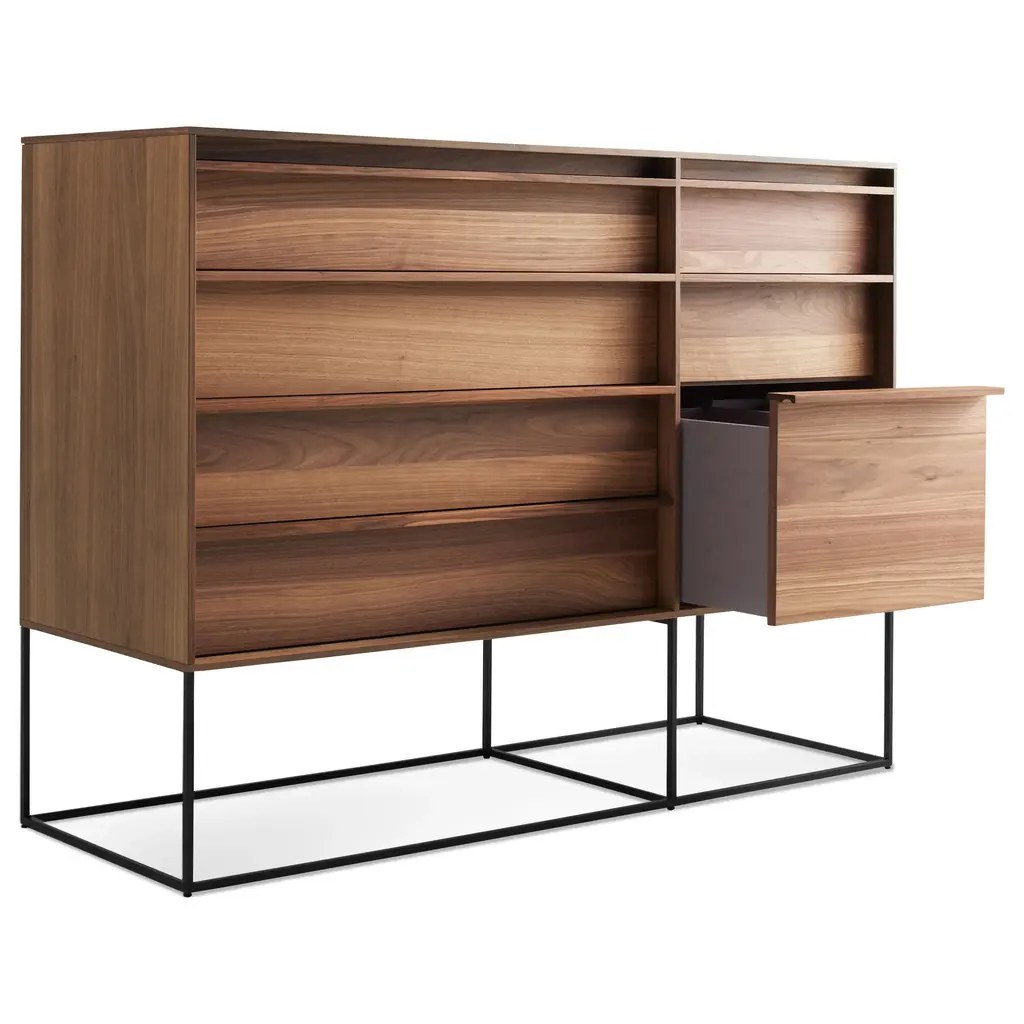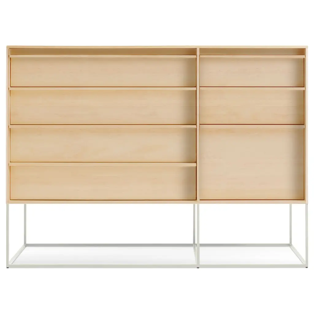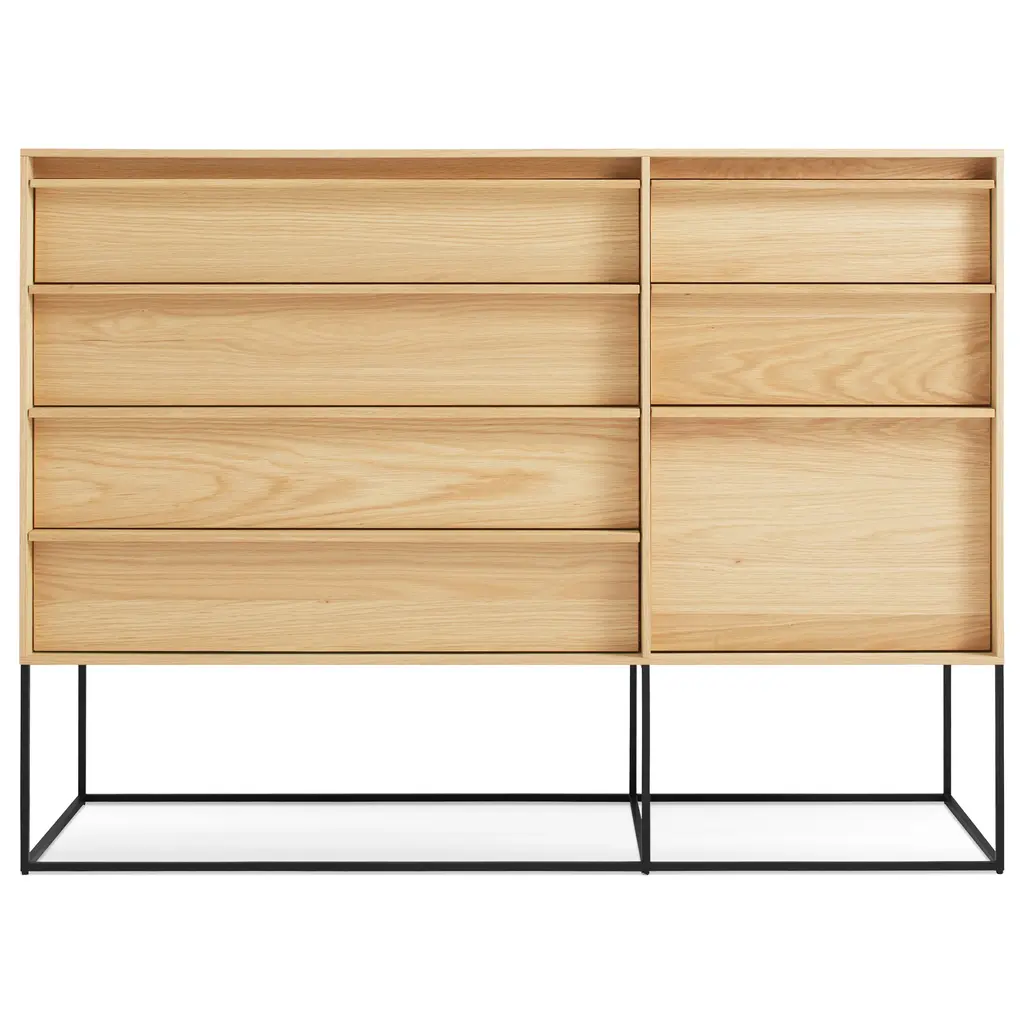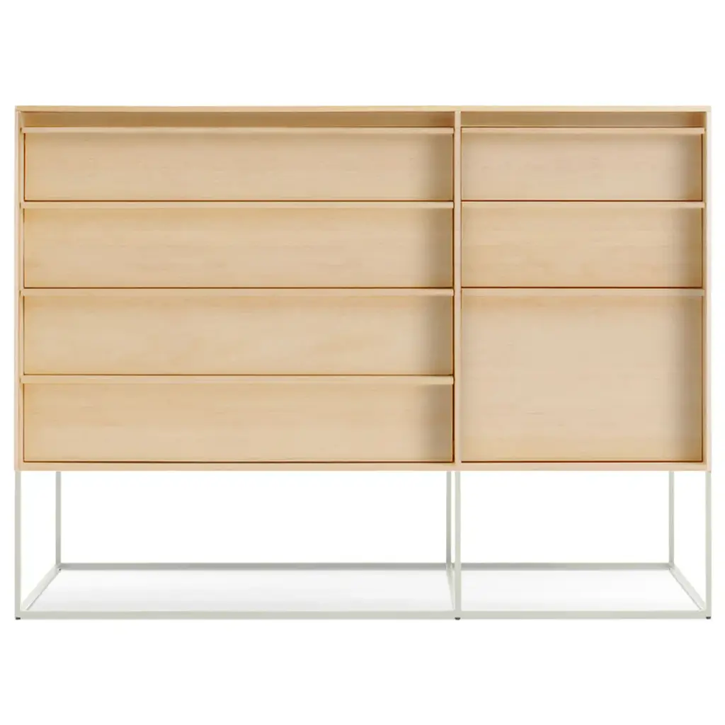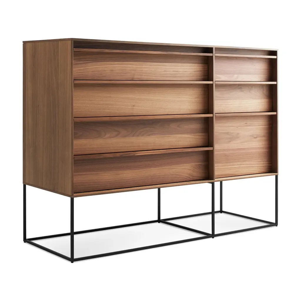 The Blu Dot Rule Large Dresser is gorgeous modern storage piece, ready to elevate any bedroom scheme. This inspired Blu Dot dresser features four large soft-close drawers and three compact drawers, all making for ample storage space in a narrow footprint. Dusk-colored interiors provide a surprising dose of color to complement the 3 available wood finish options, while a linear steel base completes an elegant Blu Dot storage offering. Features