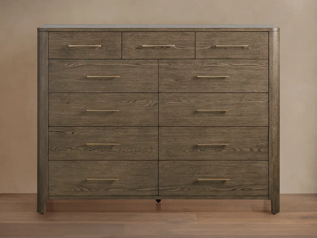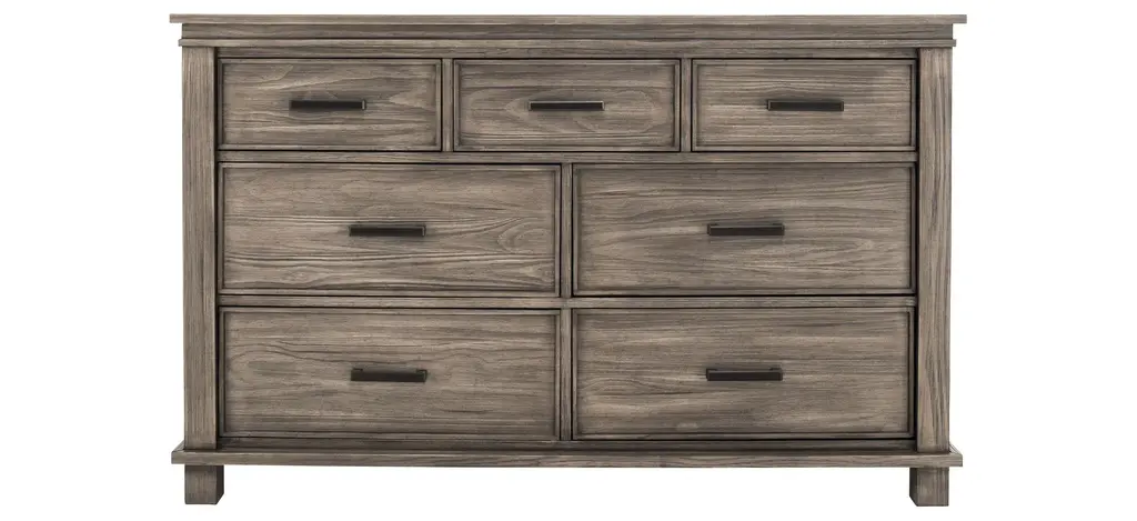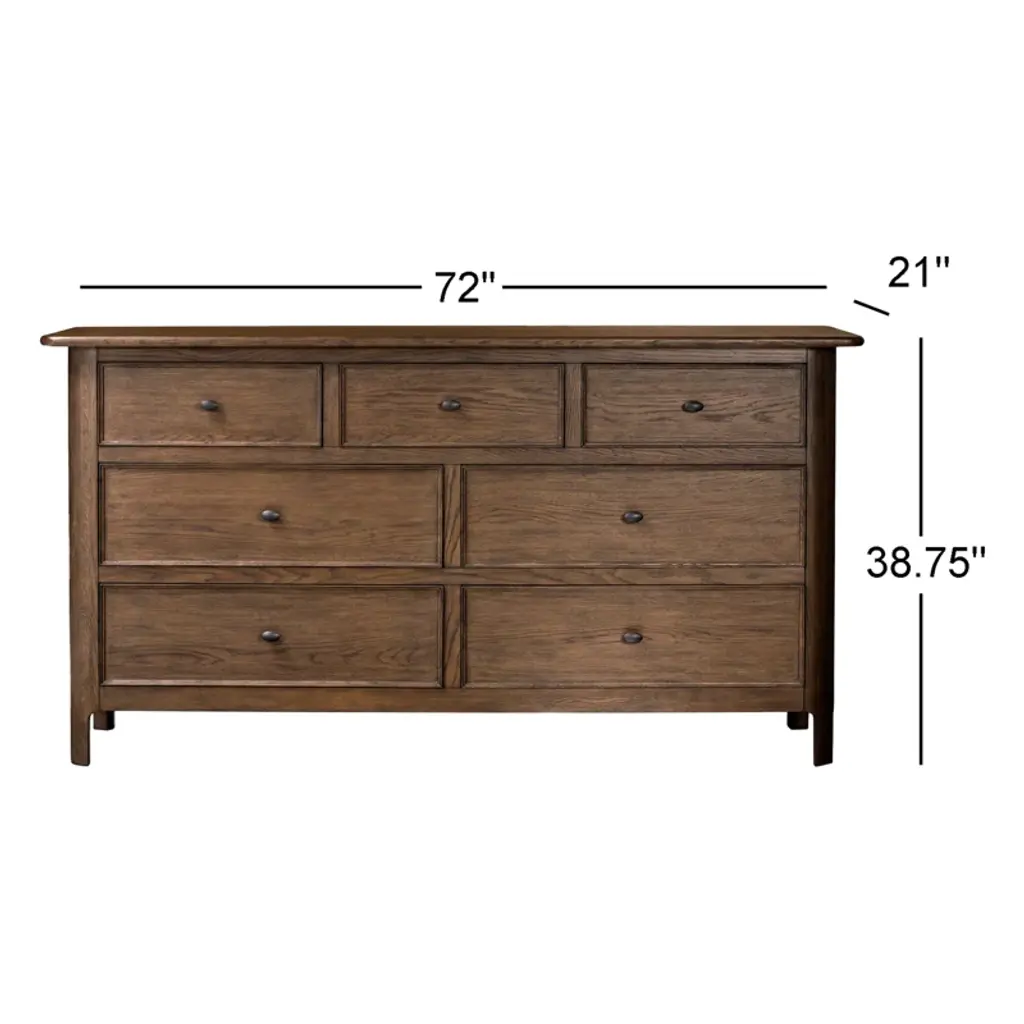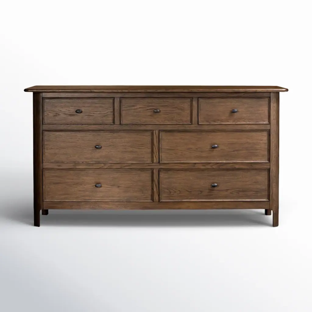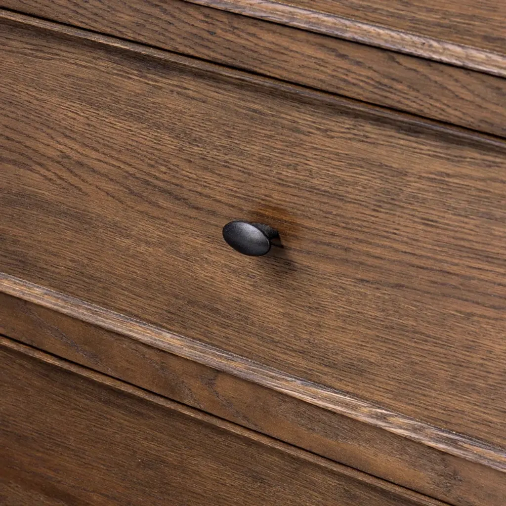 Like an heirloom dresser with three smaller drawers up top, this aged oak design has room for it all. Detailed with an overhang surface, carved edges top to bottom, angled legs and oval drawer pulls finished in dark gunmetal.