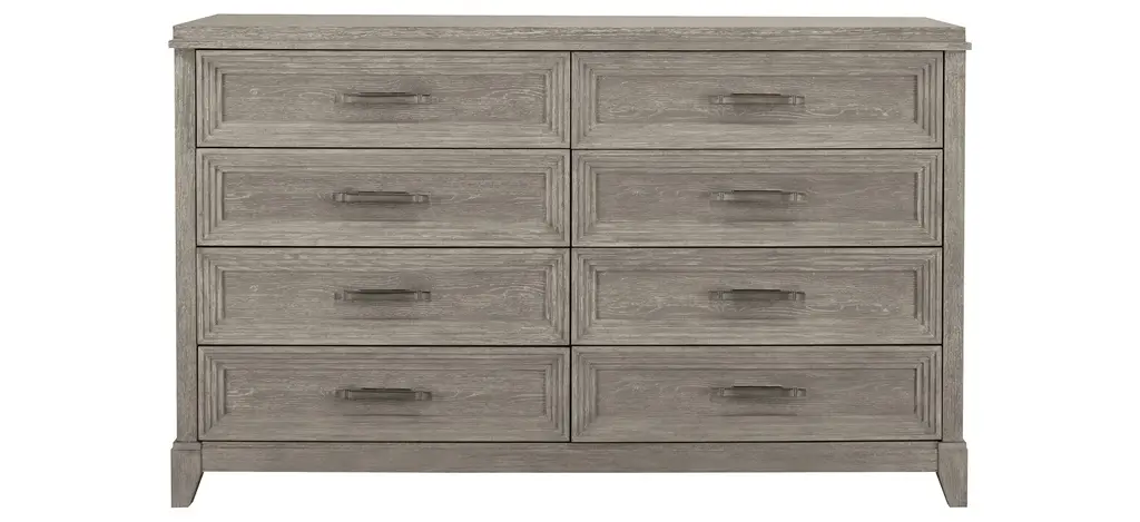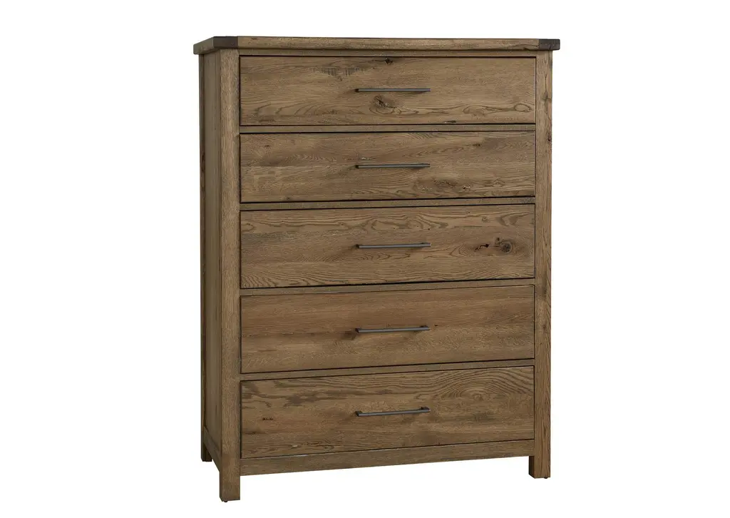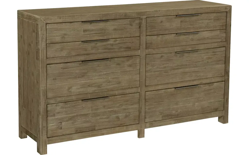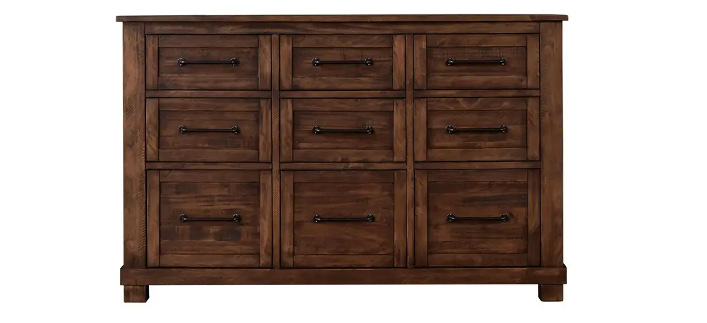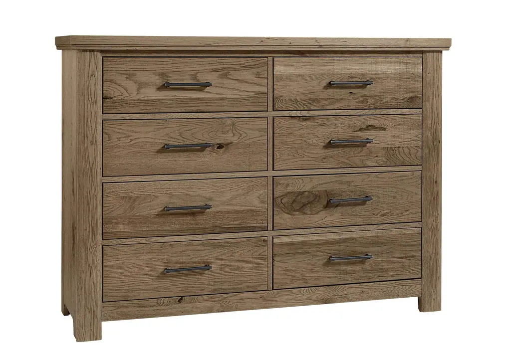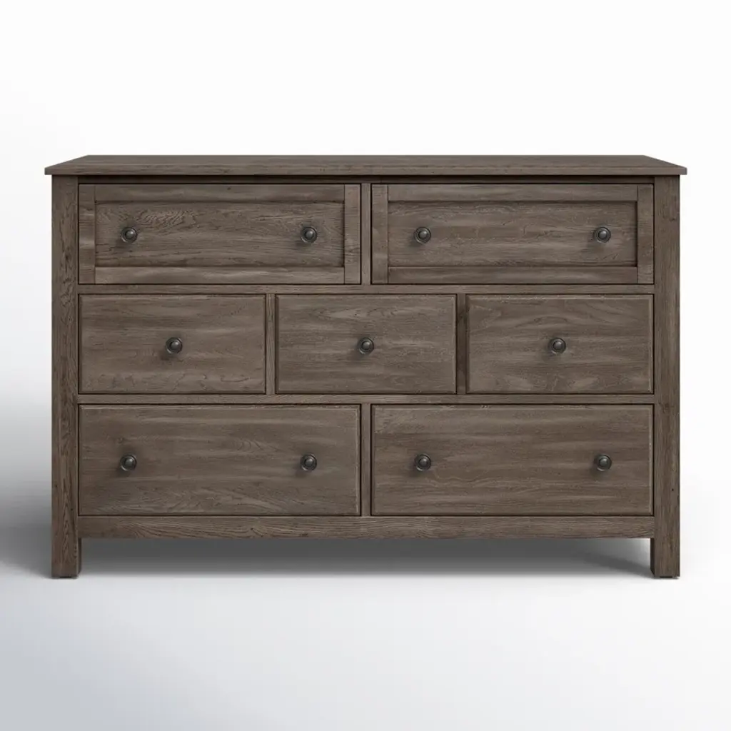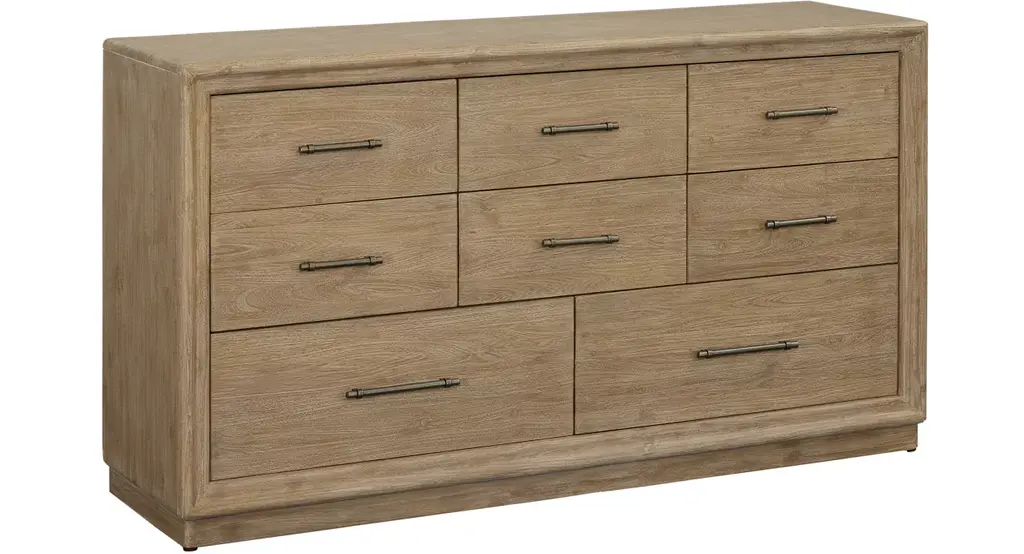 Like an heirloom dresser with three smaller drawers up top, this aged oak design has room for it all. Detailed with an overhang surface, carved edges top to bottom, angled legs and oval drawer pulls finished in dark gunmetal.