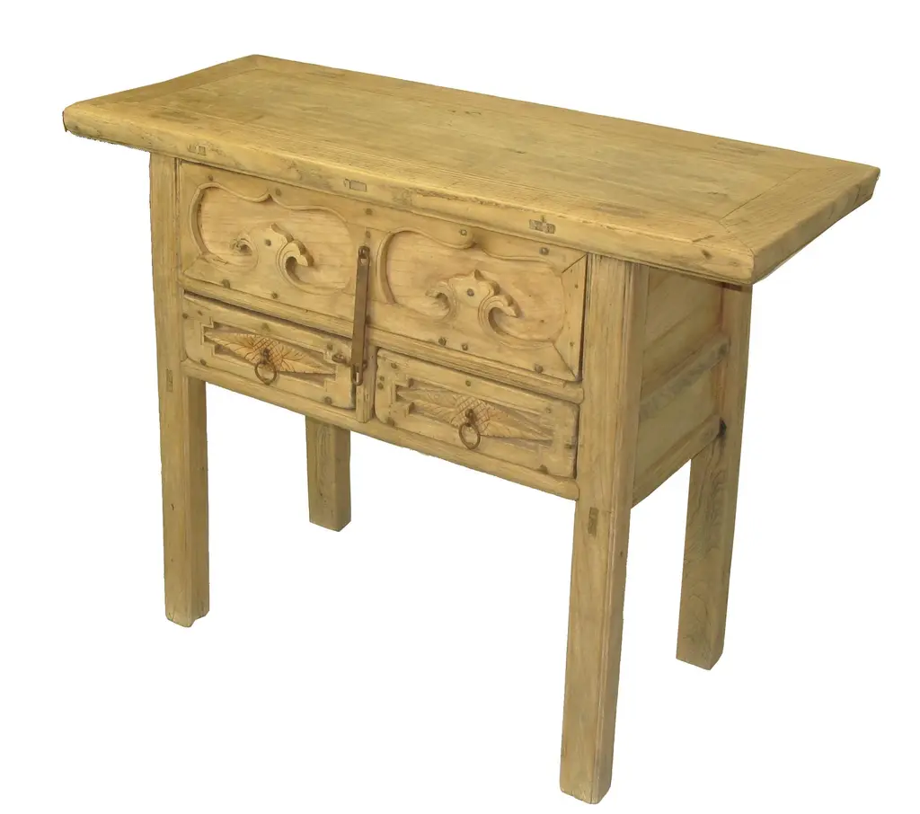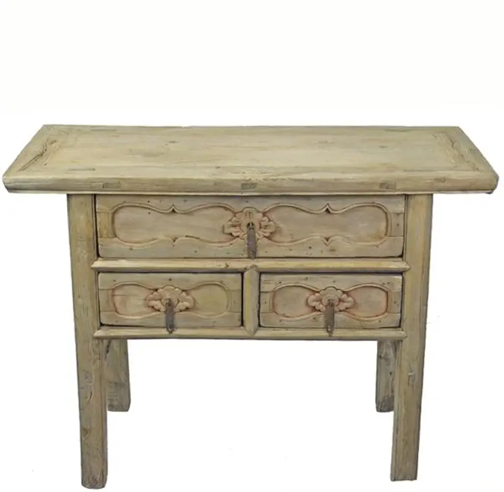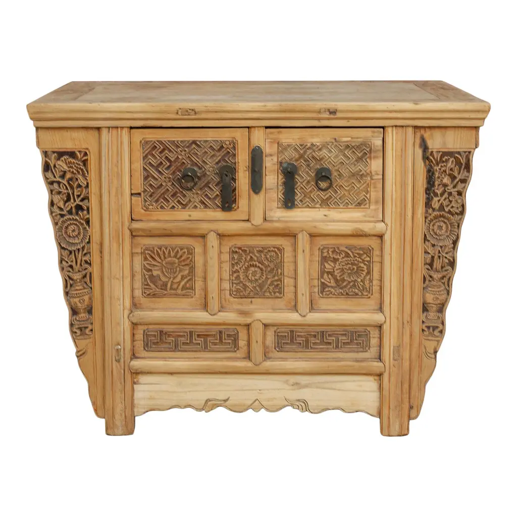 Light wood color, grains, knots, lines and natural wood imperfection bring characters to this antique Asian reproduction dressers. The carving on each drawer front is different. One larger drawer on the top and 2 smaller drawers below. It will be an outstanding dresser, altar table, console table in any room. 2 available with some variances. See photos. Item No.: Dimension: 43.3"W, 17.4"D, 33.5"H Dimension: 42.2"W, 17.3"D, 32.5"H Circa: Antique Reproduction Material: Solid Pine Feature: Handmade, hand-rubbed finish & hand-forged hardware. Distressed wear & imperfection