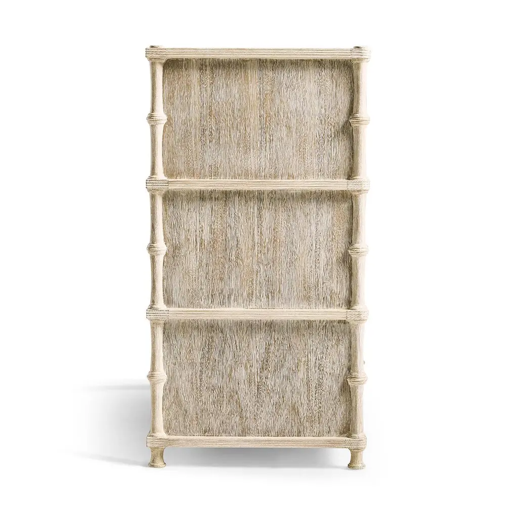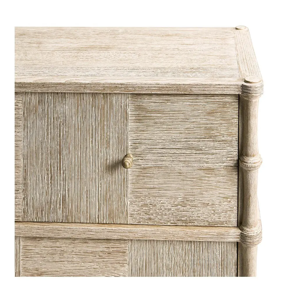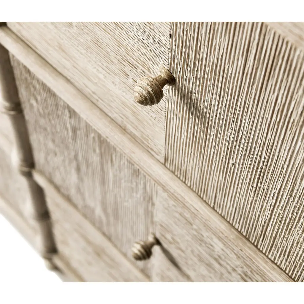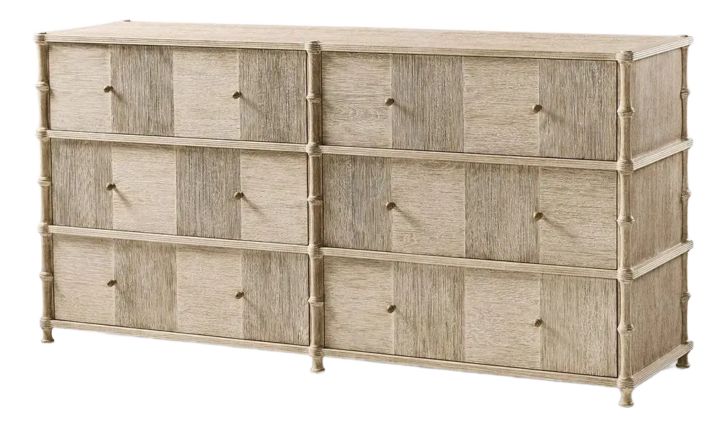 Crafted from acacia and oak wood with a washed finish for a relaxed, sophisticated feel. The reeded parquet drawer fronts add texture, while bamboo-inspired molding enhances its artisanal charm.With six spacious drawers, this dresser offers ample storage in a sleek design. Brass-finished knobs add vintage appeal, blending rustic warmth with modern functionality. Perfect for contemporary or transitional spaces, it refines and organizes your bedroom effortlessly.Dimensions: 72" W x 19" D x 36" H