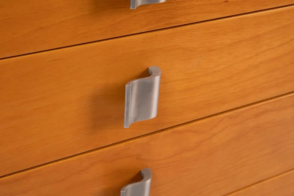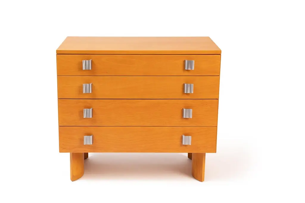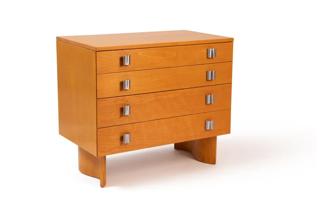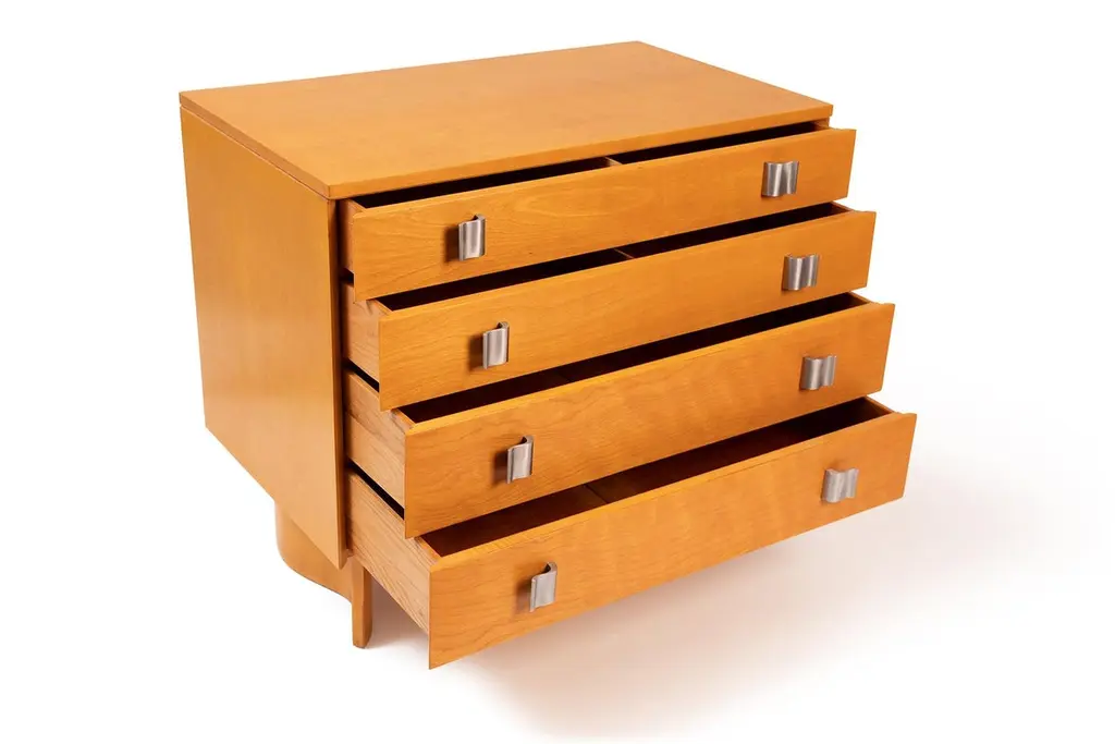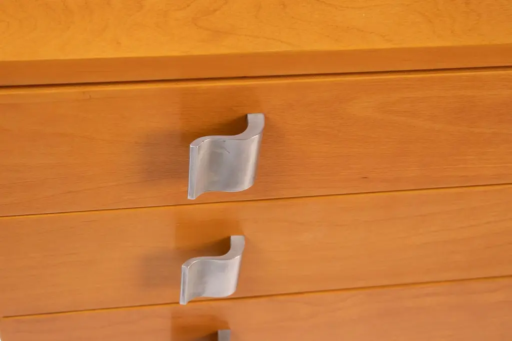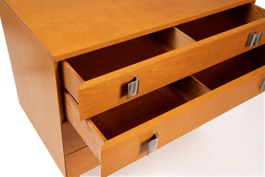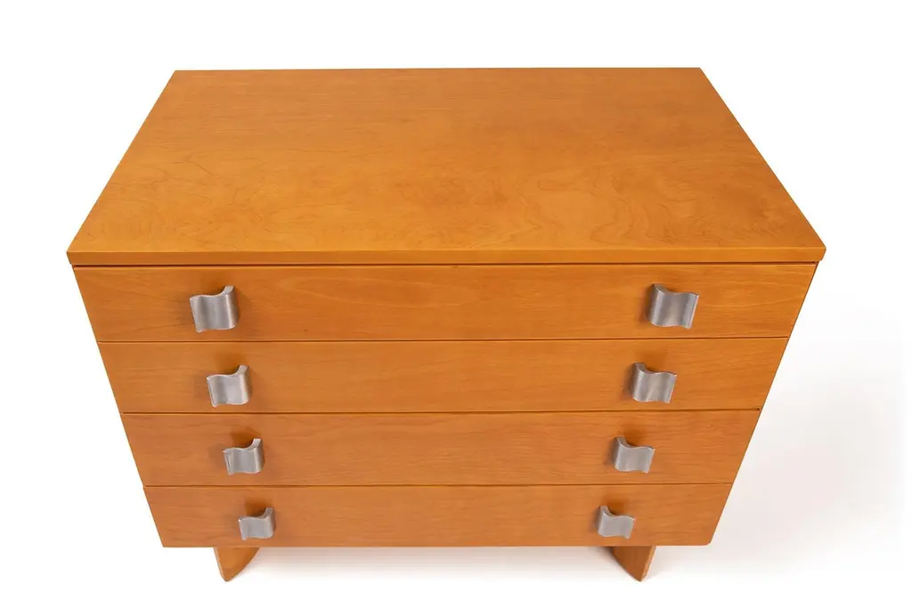 Eliel Saarinen for Johnson Furniture Company chests of drawers circa 1948. These seldom seen examples have sculptural S-shaped legs, formed aluminum handles and beautifully grained birch cases and drawer fronts. There are three of these available. Each has been masterfully refinished. Price listed is for one chest.