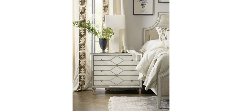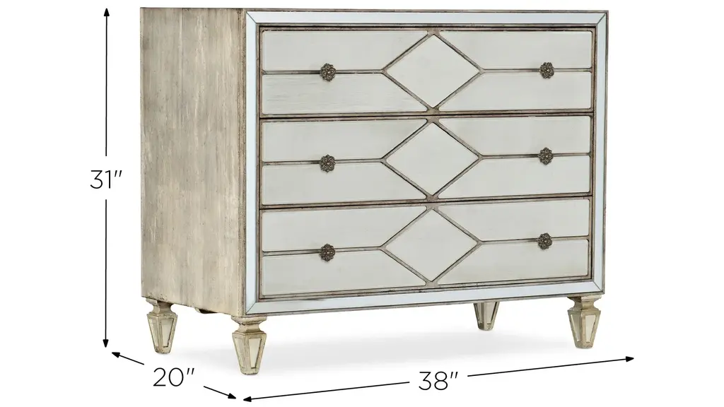 Simply magical, this shimmering Sanctuary Chest has beauty adorned with reverse painted glass drawer fronts in a creamy white finish looks like it belongs in a fairytale with a happy ending. The dreamy drawer fronts are paired with a silver finish on the case with rich undertones of gold and champagne. Jewelry-like hardware is in an antique silver color. Included is a power bar with 3 electrical outlets and one live USB port and an underneath light with 3-intensity touch switch. The top drawer has a cream-colored removable felt liner and the bottom drawer is cedar-lined.