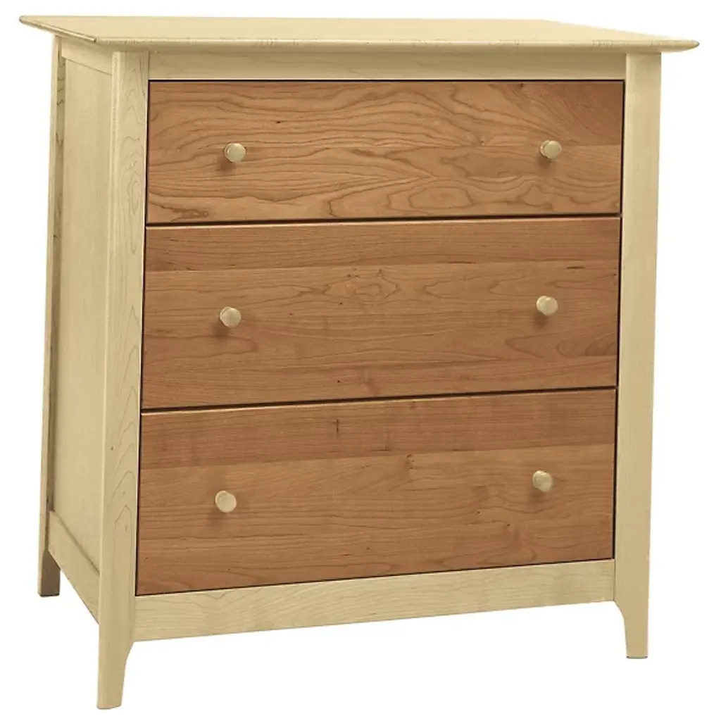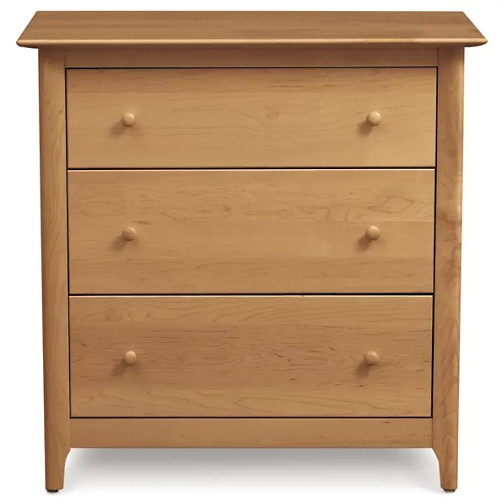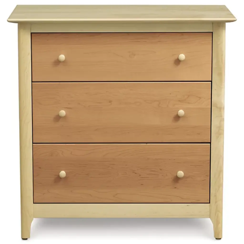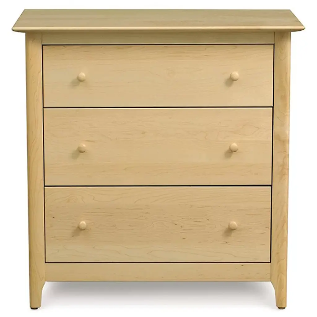 A classic piece with modern appeal. The Copeland Furniture Sarah 3 Drawer Dresser features smooth dimensions along a minimalist structure, making the most of its simple design. Solid Hardwood provides an elegant aesthetic, full of natural swirls and knots throughout the otherwise reserved frame. The Hardwood also delivers exceptional strength and durability, supporting the frame as you pack the drawers. Behind the exterior walls, innovative drawer glides allow for easy and consistent motion. Each compartment offers ample room, ensuring this modest piece still has plenty of storage space. Beautifully crafted in Vermont, this dresser helps organize your space while delivering a casual, fashionable touch.