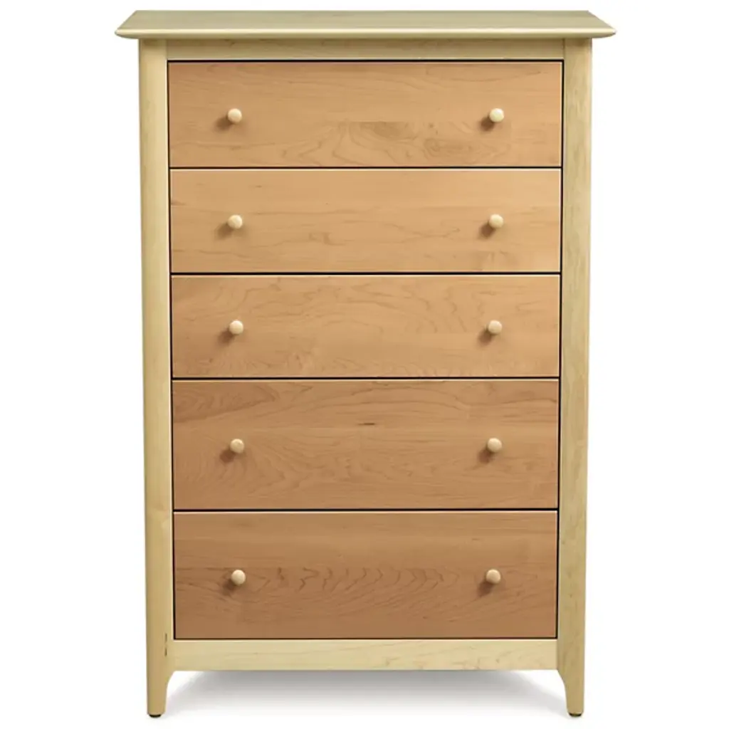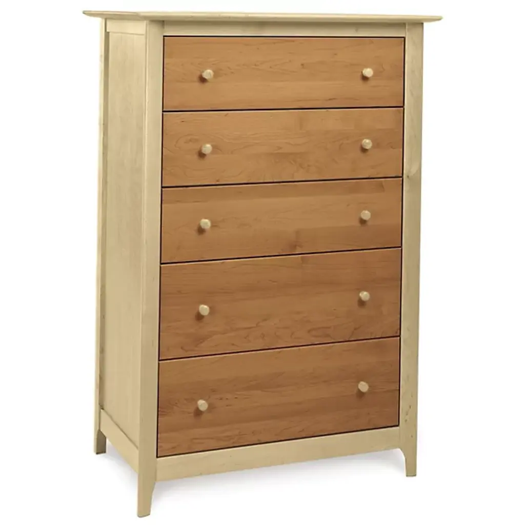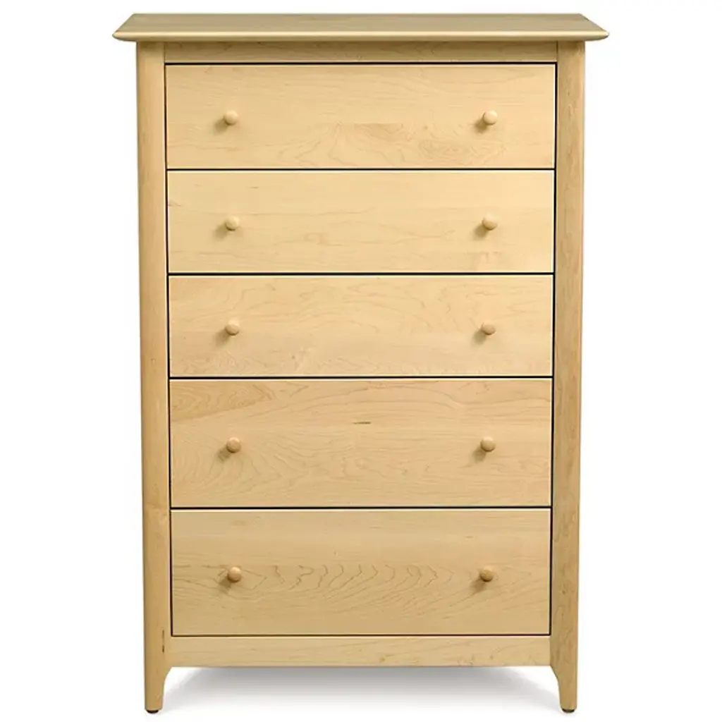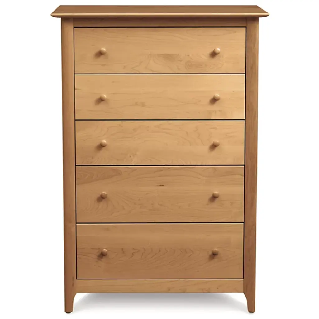 A middle ground for simplicity and complexity. The style of the Copeland Furniture Sarah 5 Drawer Dresser is expressly understated, while the design has more to it than meets the eye. Expertly built using both traditional craftsmanship and modern innovations, the Solid Hardwood frame offers exceptional utility beyond just its spacious frame. Adjustable drawer glides keep the moving parts in good condition and a balanced design allows this tall dresser to stay grounded as its drawers fill up. The clean, natural aesthetic from the Hardwood gets the smallest of accents by way of the mushroom handles, adding to the piece’s overall symmetry without detracting from the beautiful design and classic exterior.
