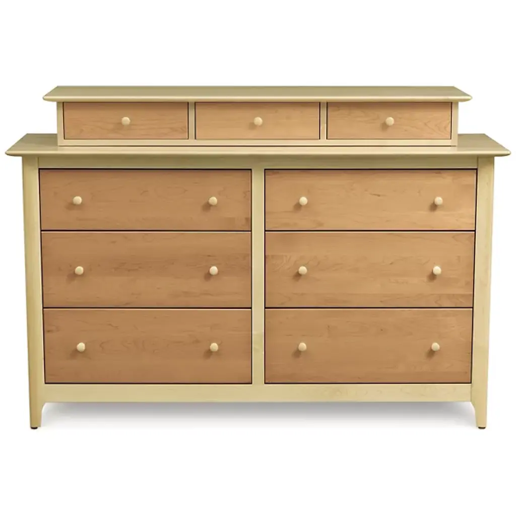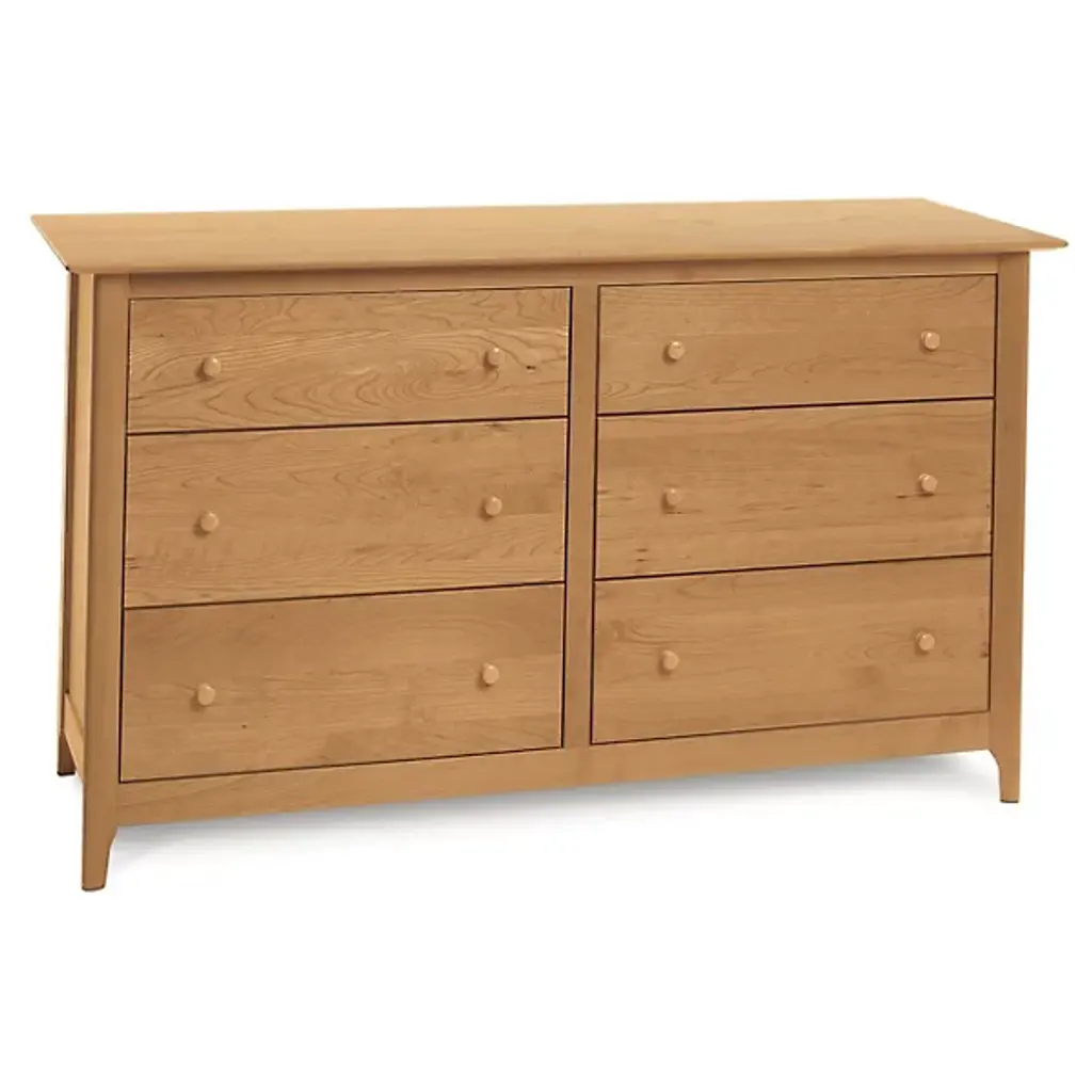 Understated style on a spacious frame. A hefty piece with vintage appeal, the Copeland Furniture Sarah 6 Drawer Dresser presents a quiet presence in its notable dimensions. A Solid Hardwood body creates an interesting combination of subtlety and strength, delivering a natural elegance in a weighted, durable frame. With no design elements beyond the beautiful markings within the Wood, the dresser’s aesthetic stays relatively reserved. Inside the wide frame, the piece tells a busier story. Six deep drawers store and organize any number of items. Adjustable drawer glides keep the compartments on track as they open and close repeatedly. The dresser is constructed using both traditional techniques and modern tools, ensuring you get an excellent structure with hints of vintage, rustic style.
