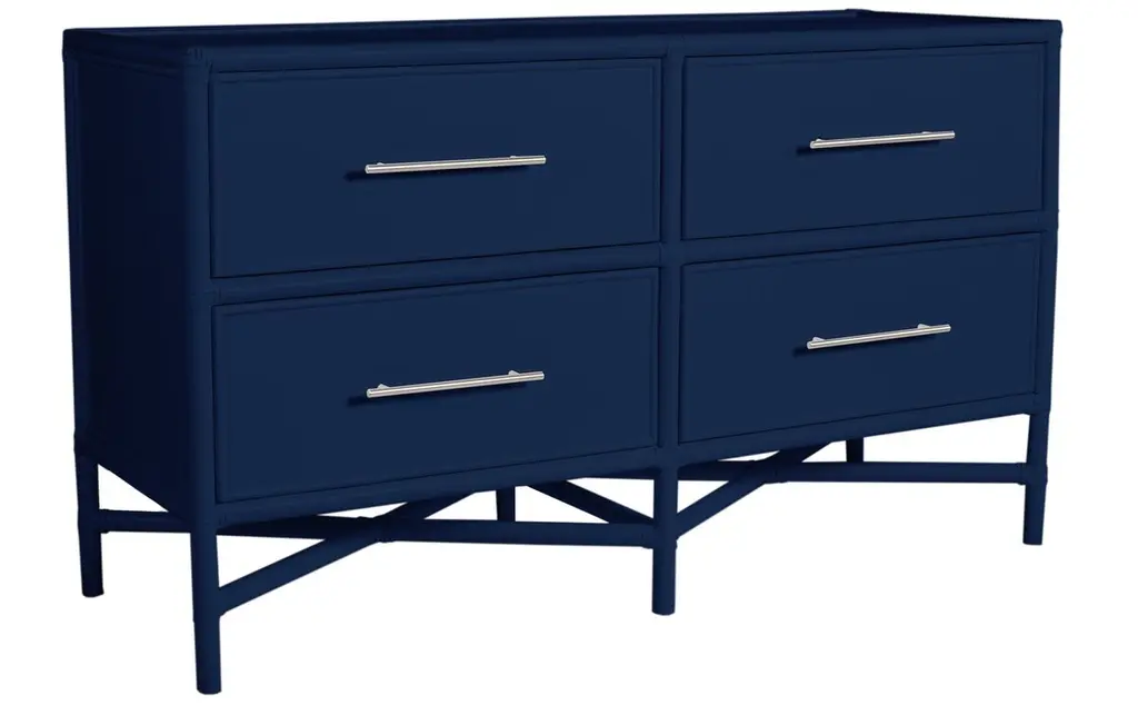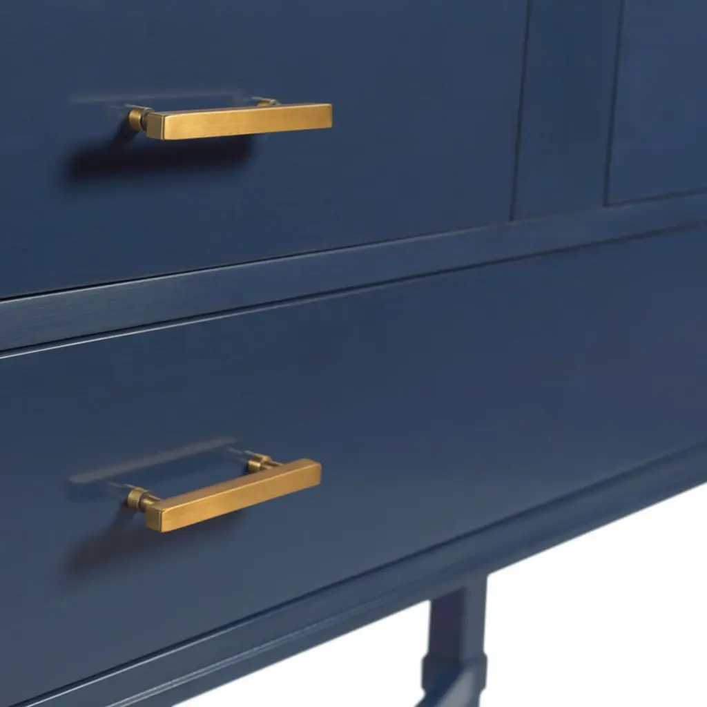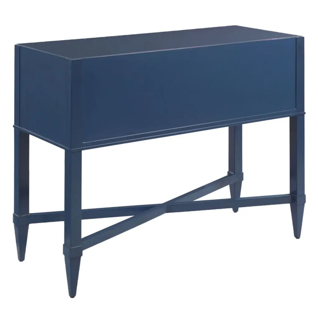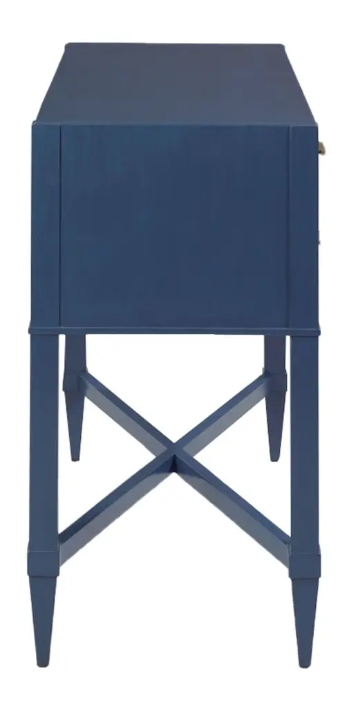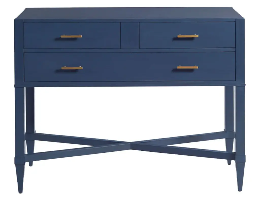 Designed by us and available only at One Kings Lane: Crafted of hardwood solids topped with our exclusive paint, this beautifully carved console boasts tapered legs and an X-shaped stretcher. Three drawers with brass hardware provide plenty of concealed storage space.