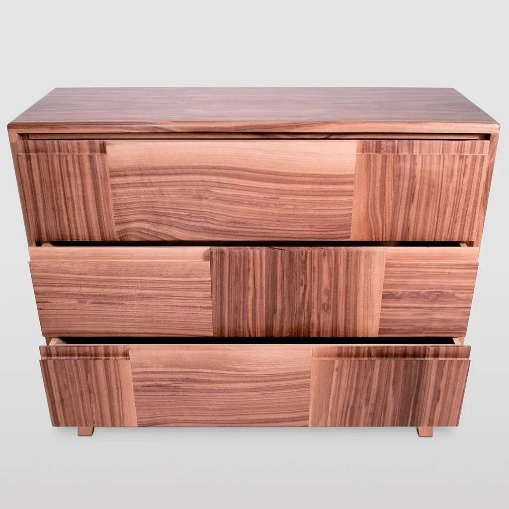 Streamlined lines and bold volumes define this exquisite example of Italian cabinetry. Handcrafted of solid Canaletto walnut, it features three drawers with a Blumotion soft-close system, whose front panels juxtapose alternating vertical and horizontal panels, creating superb contrasting effects resulting from opposite grain orientations. Concealed cut-out handles complete this minimalist piece raised on slanted, compact feet. Please check customization options with the Concierge.