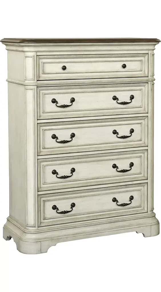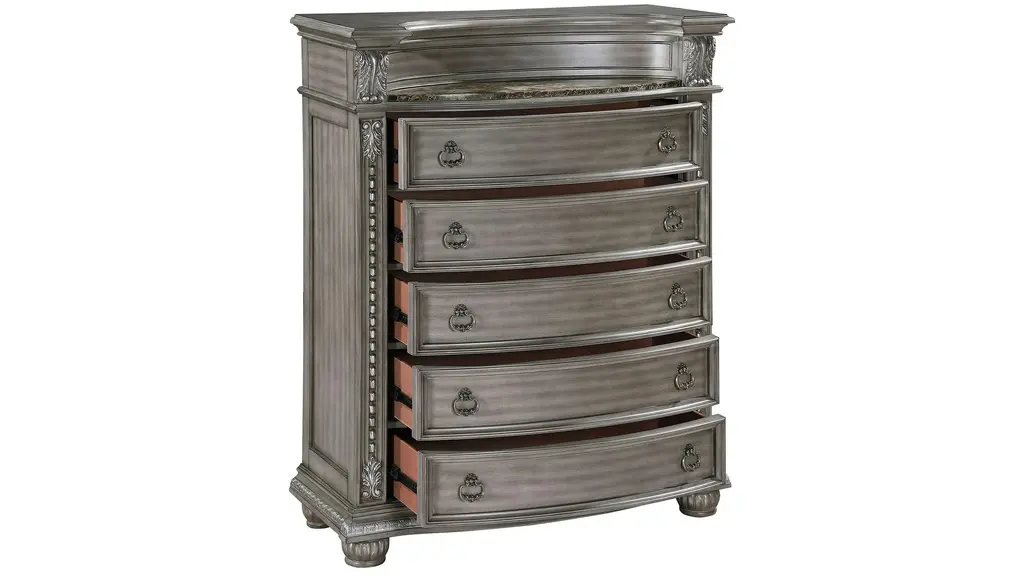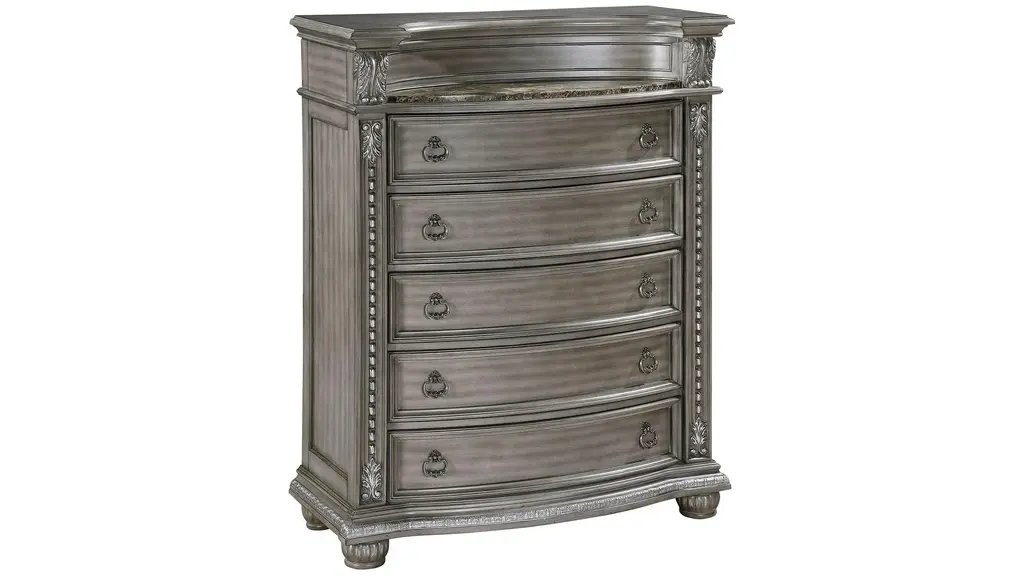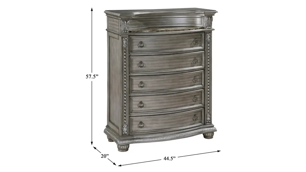 The luxurious grandeur that permeates the design of the Scarlett Chest is an amalgamation of classic accenting and traditional lines. Carved bun feet, acanthus leaf carving, bead molding, and elegant framing account for the beautiful profile that defines the chest's design. Antique pewter-finished knob and ring pull hardware fronts the drawers, and marble tops the piece. The gray finish, over acacia veneer, features subtle silver tipping for final luxurious accent.