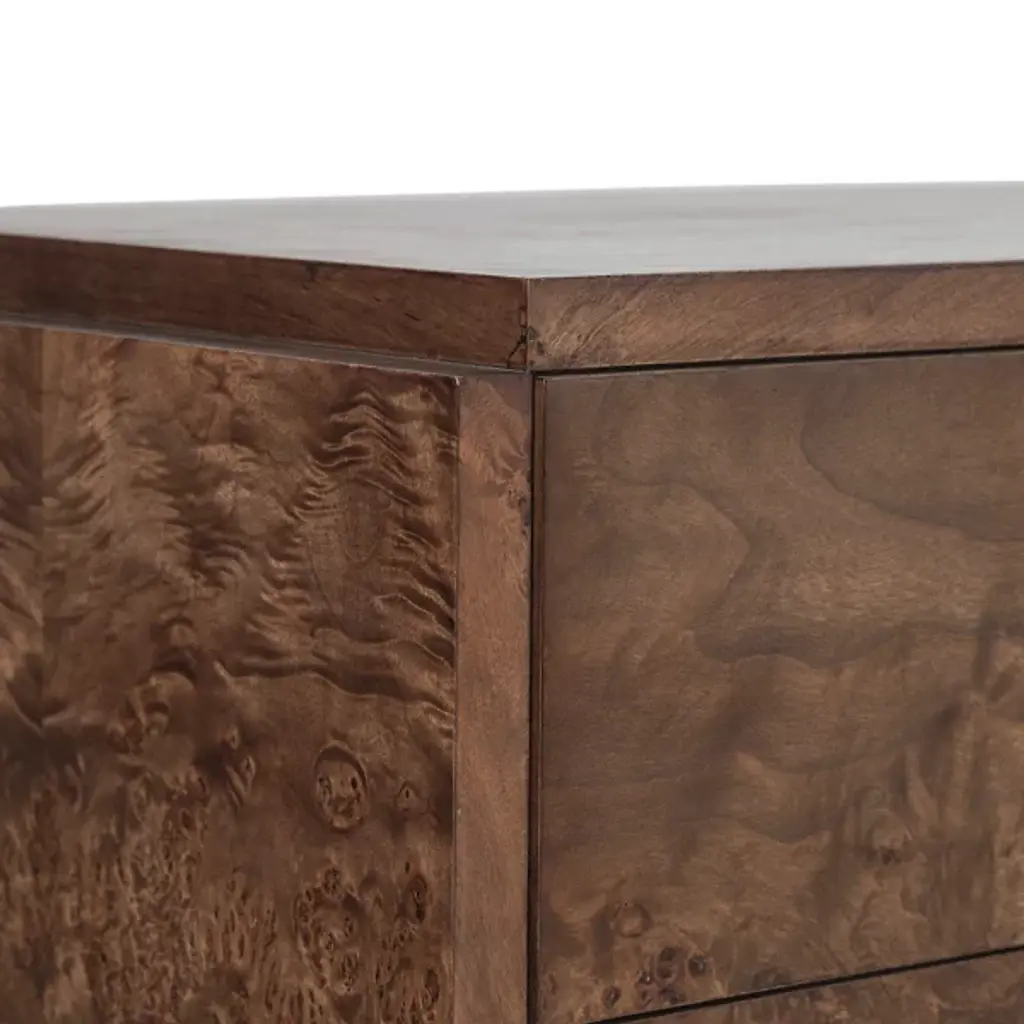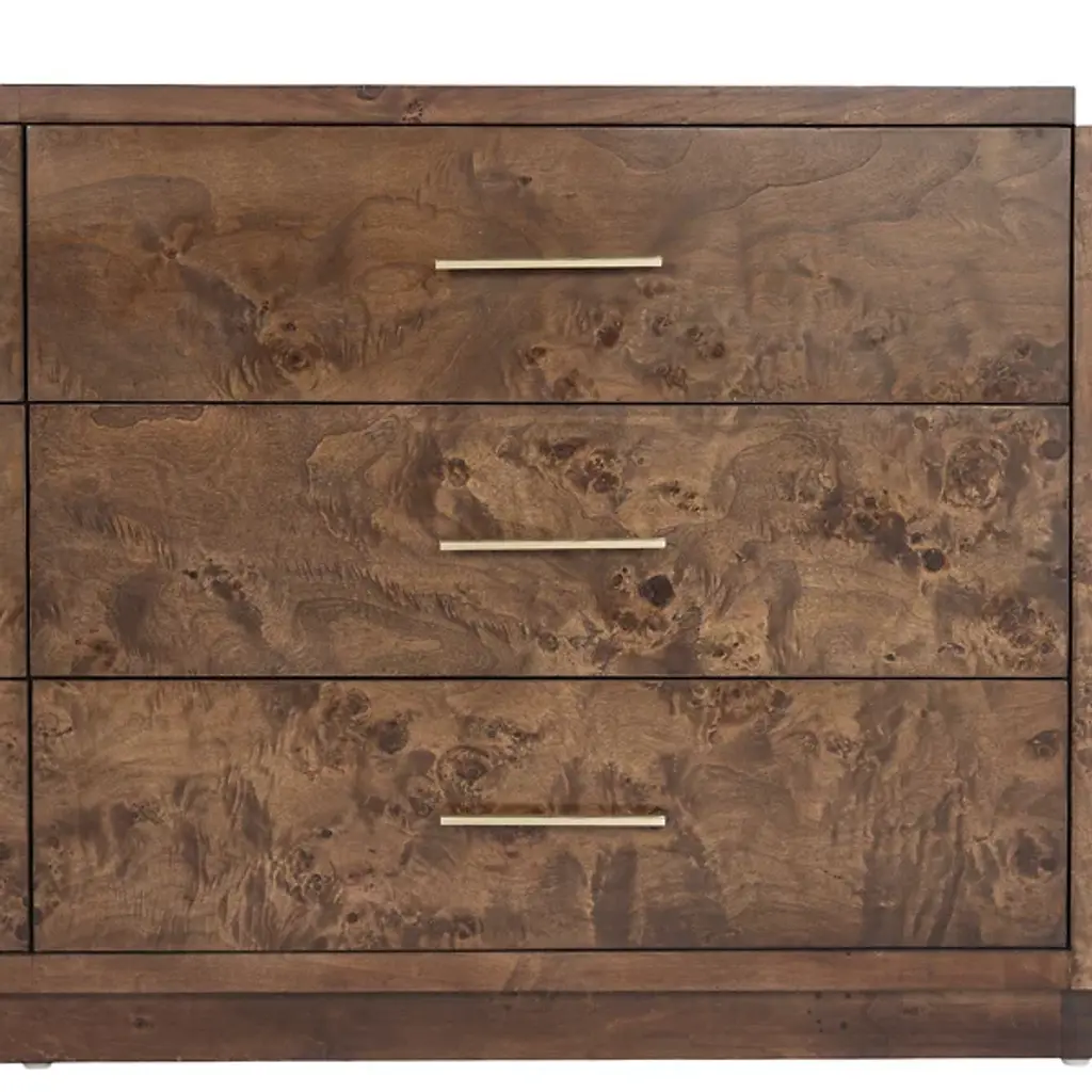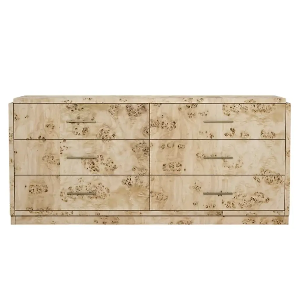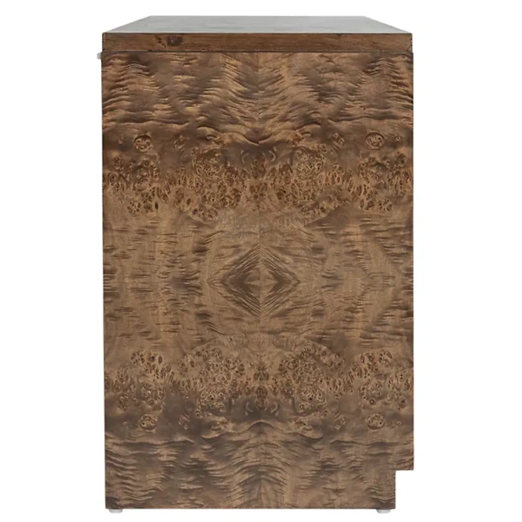 The Scotsbrook Burl 6 Drawer Dresser from Alder & Ore is a portal to nature's hidden artistry. Each drawer front showcases the intricate swirls and eddies of Mappa burl, telling a unique story of growth and resilience. This dresser adapts to your aesthetic while maintaining its inherent drama. Brass hardware punctuates the design like stars in a wooden sky, adding some cosmic elegance. This piece doesn't just store your clothes; it displays them within a natural masterpiece.