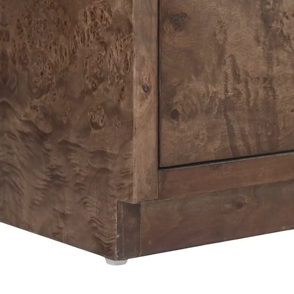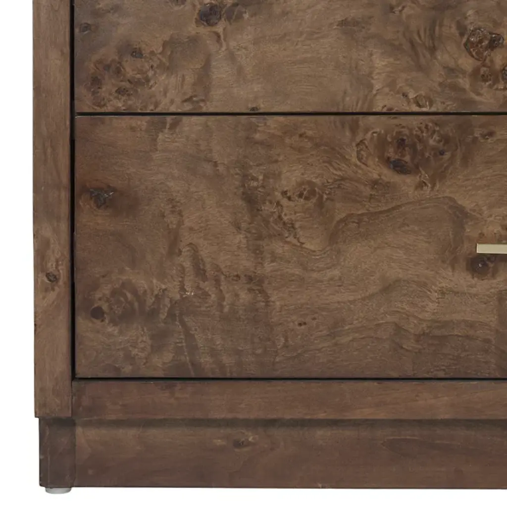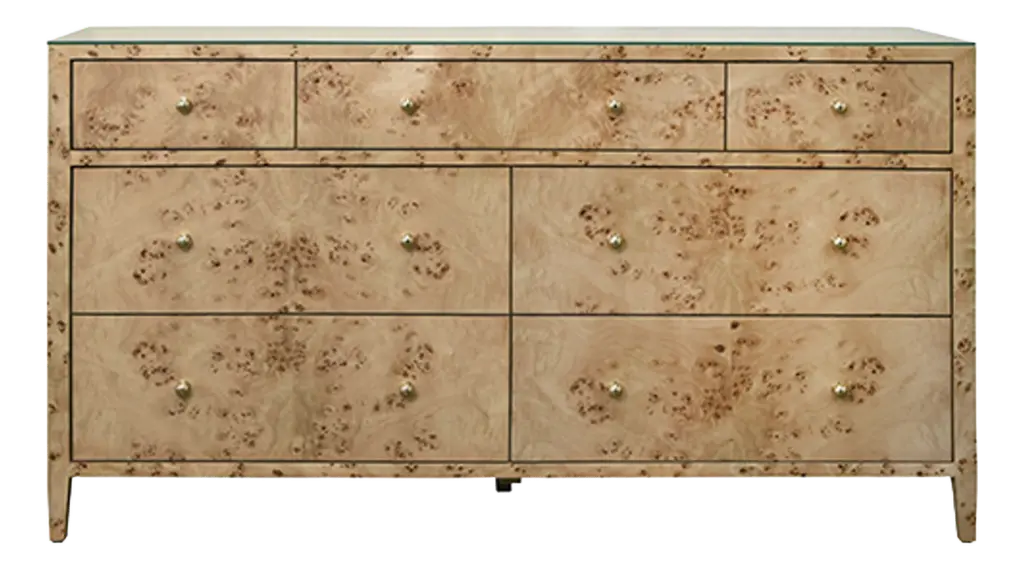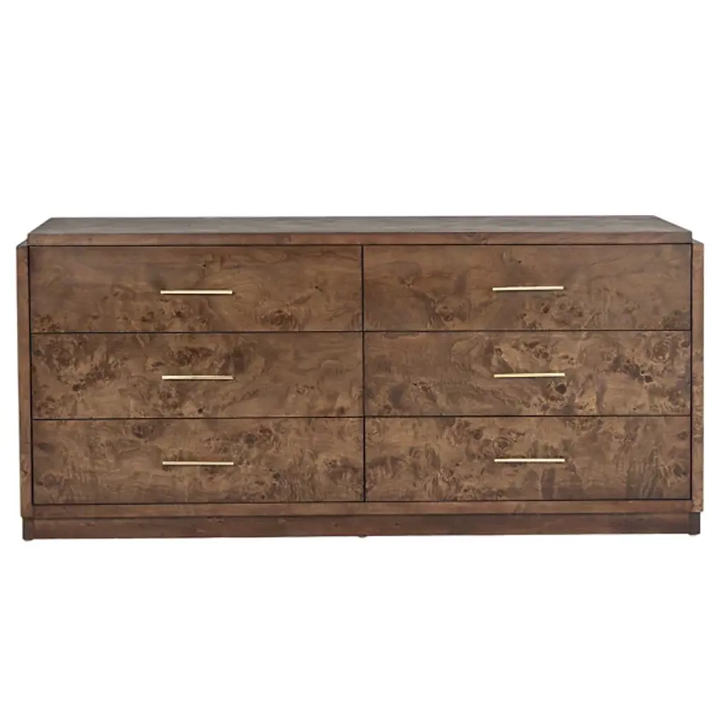 The Scotsbrook Burl 6 Drawer Dresser from Alder & Ore is a portal to nature's hidden artistry. Each drawer front showcases the intricate swirls and eddies of Mappa burl, telling a unique story of growth and resilience. This dresser adapts to your aesthetic while maintaining its inherent drama. Brass hardware punctuates the design like stars in a wooden sky, adding some cosmic elegance. This piece doesn't just store your clothes; it displays them within a natural masterpiece.