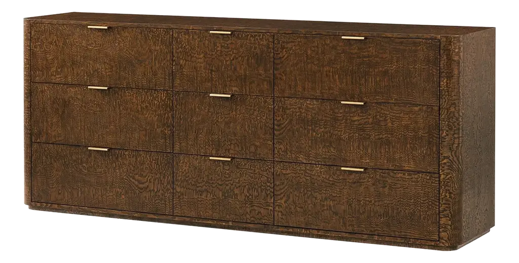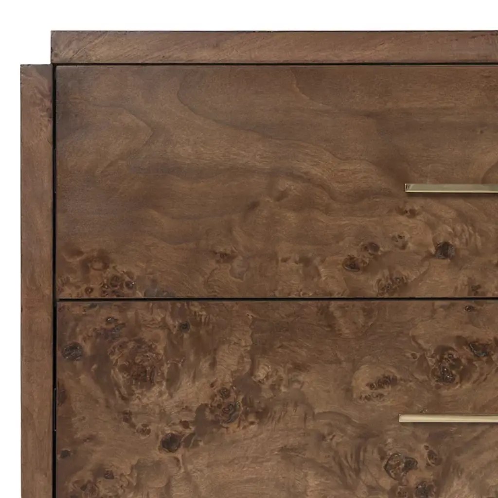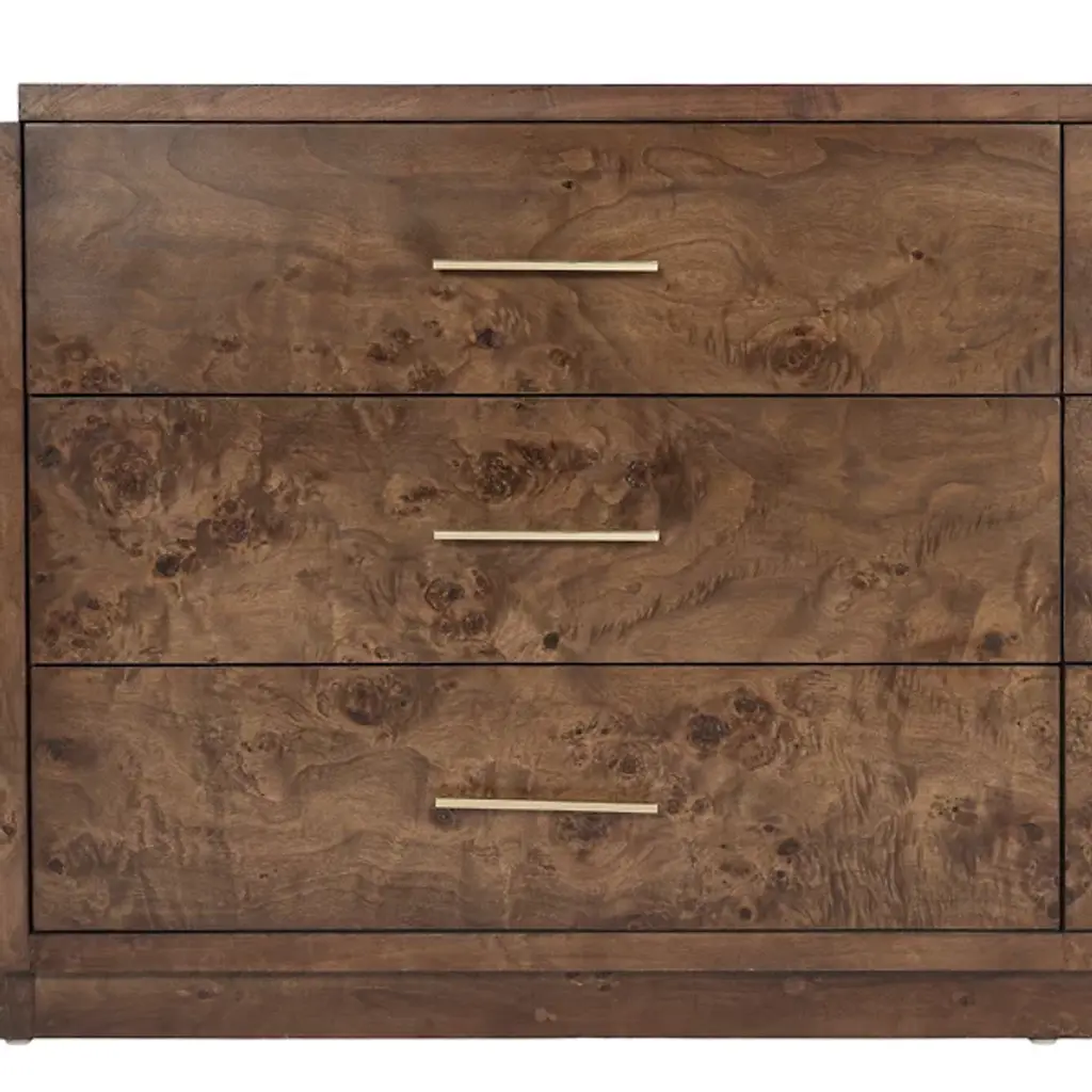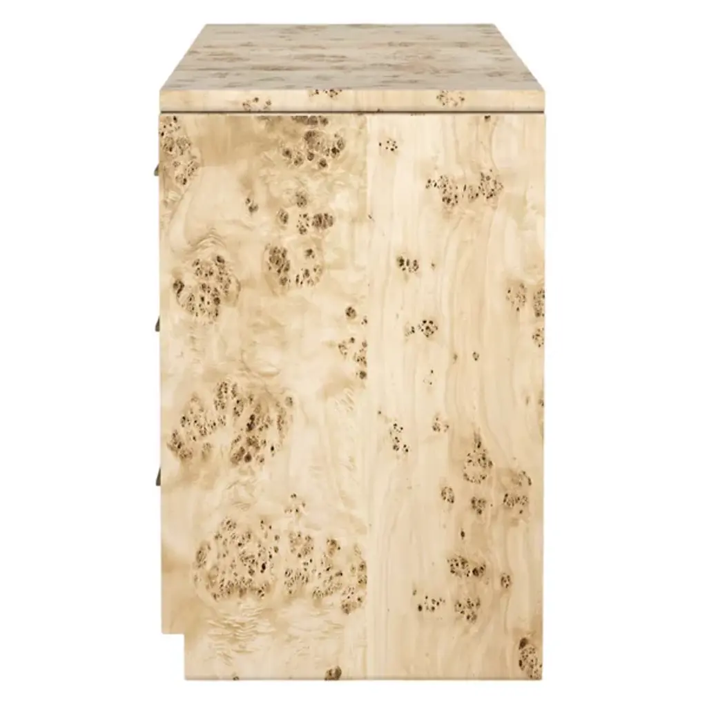 The Scotsbrook Burl 6 Drawer Dresser from Alder & Ore is a portal to nature's hidden artistry. Each drawer front showcases the intricate swirls and eddies of Mappa burl, telling a unique story of growth and resilience. This dresser adapts to your aesthetic while maintaining its inherent drama. Brass hardware punctuates the design like stars in a wooden sky, adding some cosmic elegance. This piece doesn't just store your clothes; it displays them within a natural masterpiece.