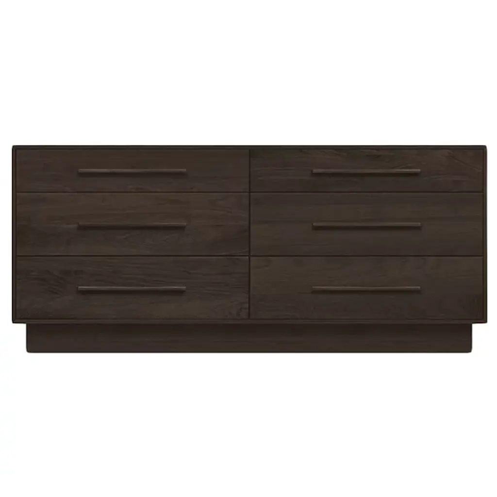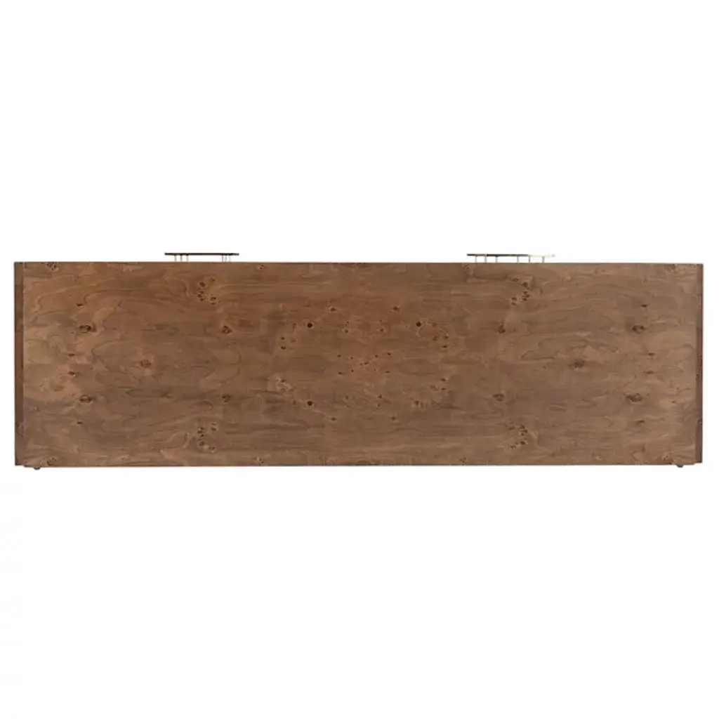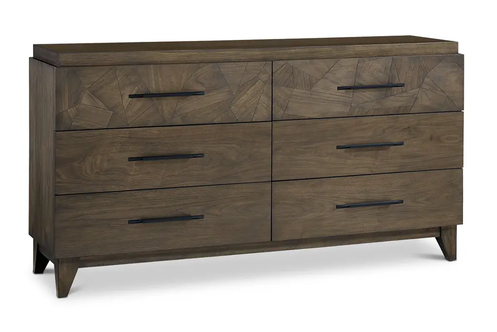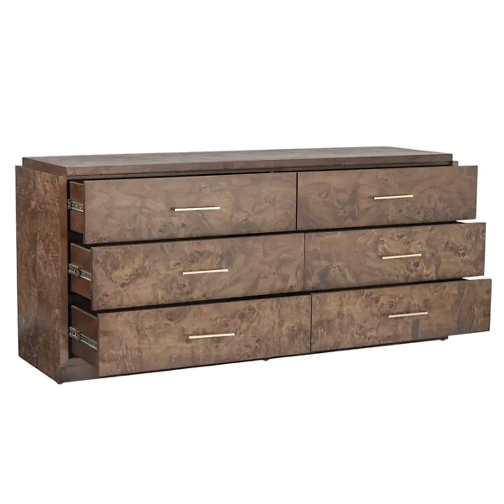 The Scotsbrook Burl 6 Drawer Dresser from Alder & Ore is a portal to nature's hidden artistry. Each drawer front showcases the intricate swirls and eddies of Mappa burl, telling a unique story of growth and resilience. This dresser adapts to your aesthetic while maintaining its inherent drama. Brass hardware punctuates the design like stars in a wooden sky, adding some cosmic elegance. This piece doesn't just store your clothes; it displays them within a natural masterpiece.