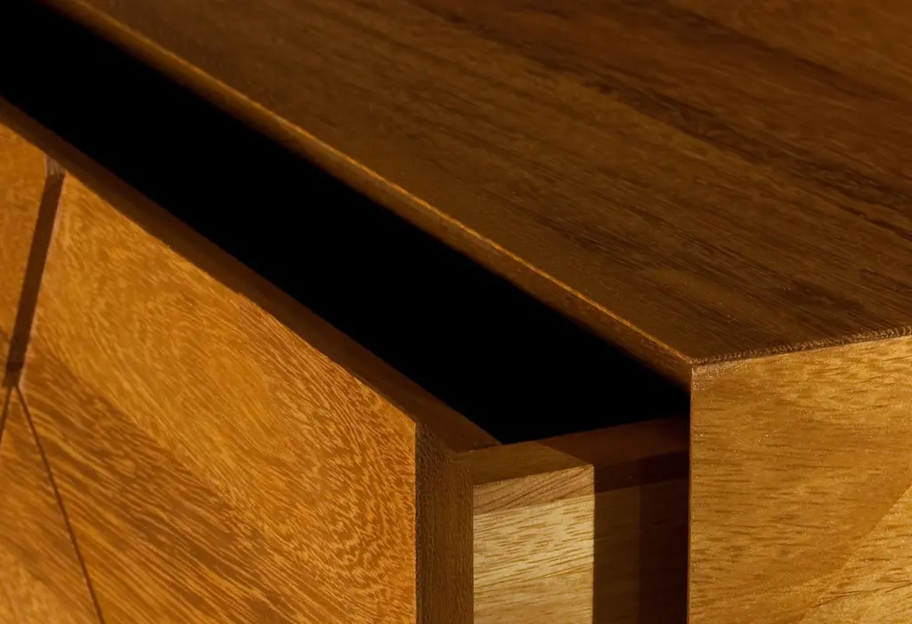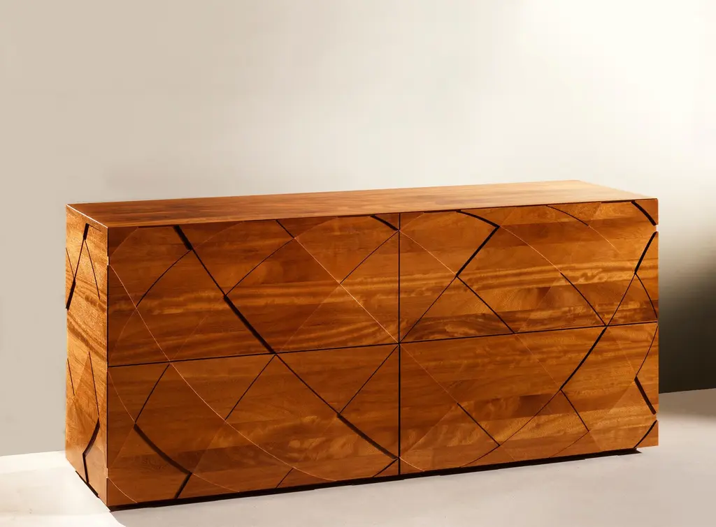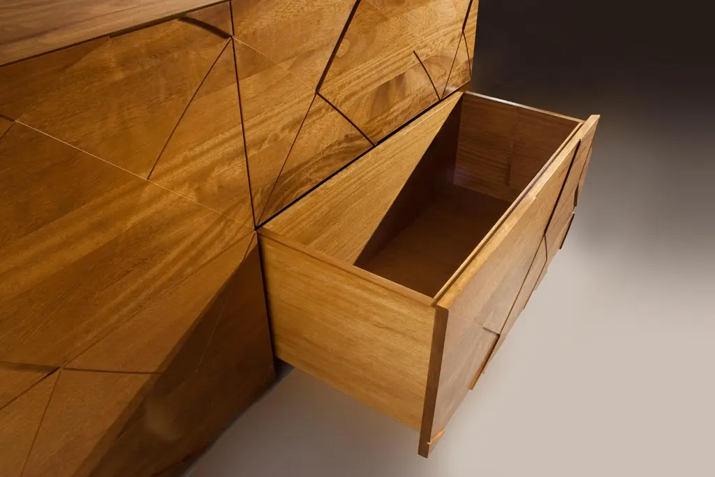 Sedici is a solid wood chest of drawers with an extremely systematical shape. All visible parts are assembled with 45-degree cuts so that the outer edges appear as simple, thin lines. The drawers conceal their thickness with the same logic, and its dynamism is reflected in the texture that surrounds it. Geometric shapes are extruded at different heights and from the front, they run along the sides without interruption. The veins play the same role, passing from one drawer to another without detachments, continuing on the sides of the sideboard. The Sedici has no handles, just press the front at any point and the push-and-pull mechanism will open up the drawer. The sideboard is made to order but the prototype is also available, if interested. Numbered Numbered,Numbered