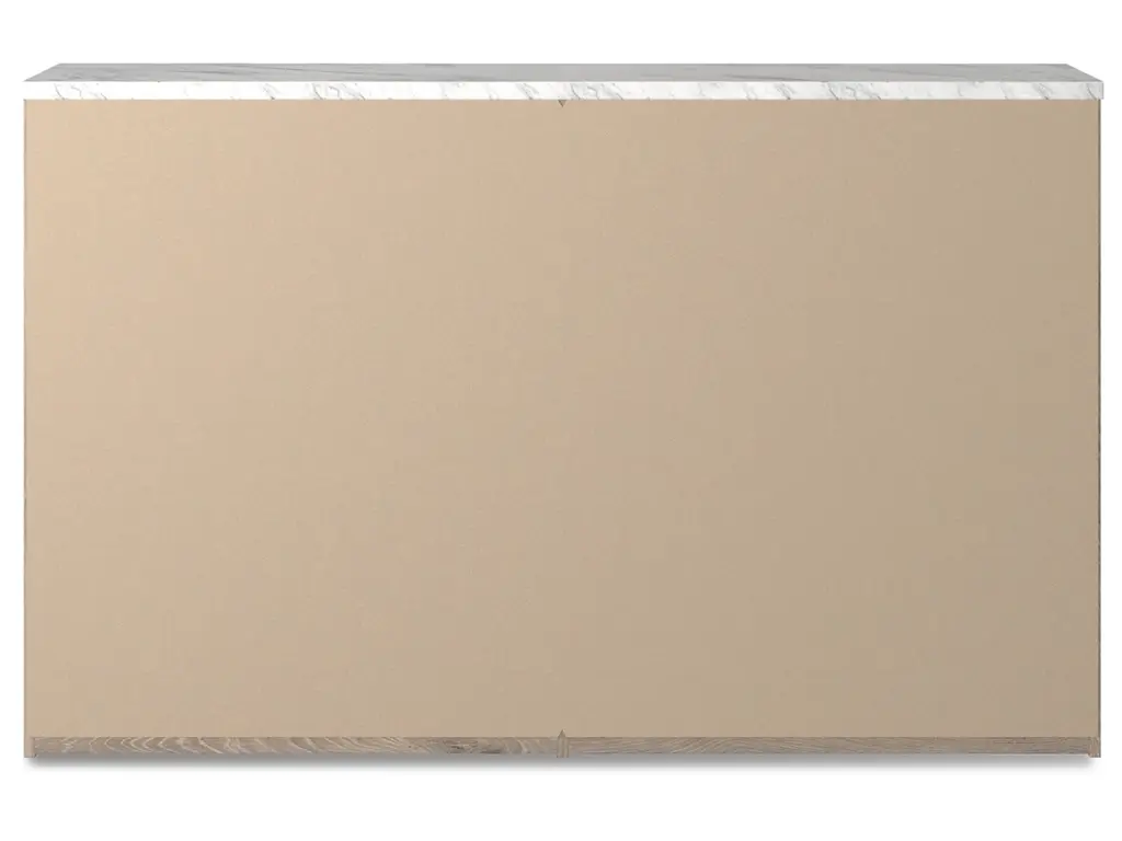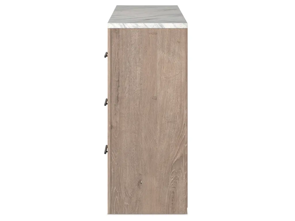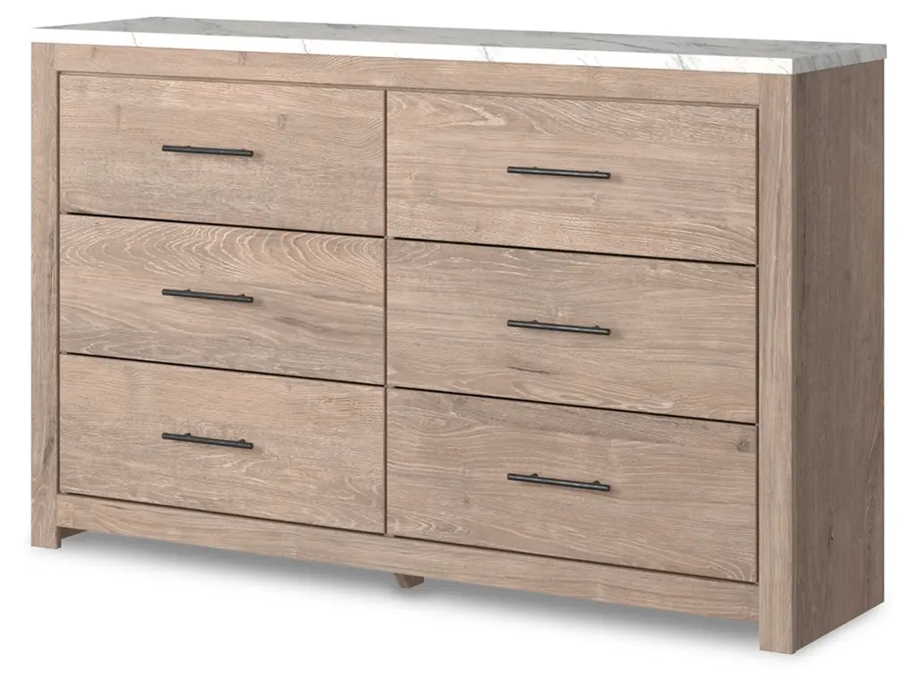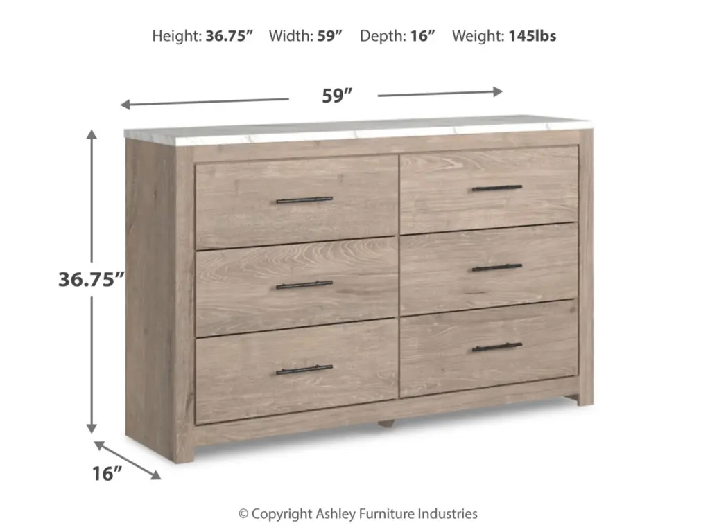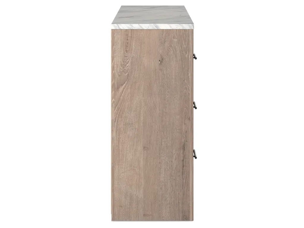Cool, clean and casually modern. The Senniberg dresser’s light natural finish and faux Calcutta marble top set the tone for your calming sanctuary. Large linear pulls add dimension and authenticity. Six smooth-gliding drawers neatly accommodate your wardrobe needs.