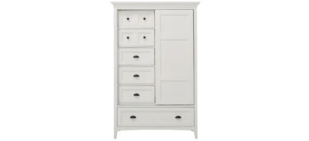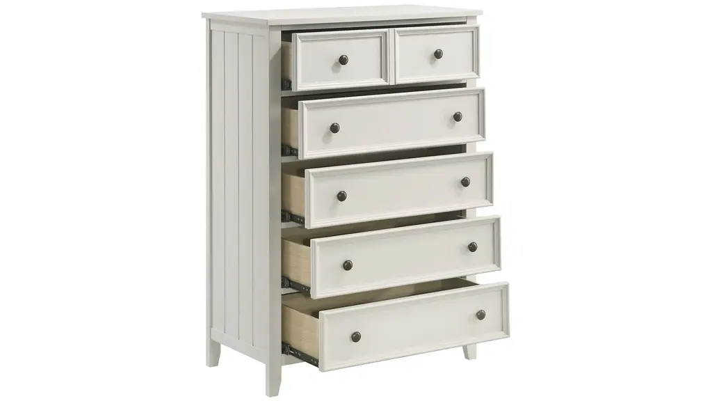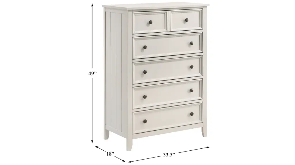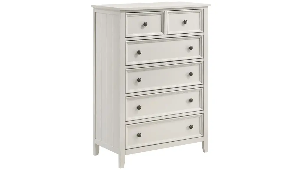 The Serena Chest is a subtle canvas for your bedroom's d_cor. Framed shiplap-inspired panels lend a classic decorative accent to the dresser while knob hardware fronts the drawer's piece. Hints of farmhouse living create the look of the Serena Collection.