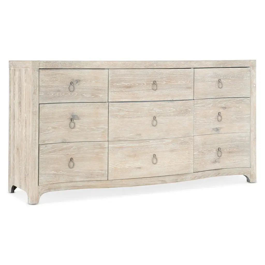 Bring the relaxed aura and natural palettes of the outside in with the Serenity Harbour Nine Drawer Dresser, crafted of oak veneers in a light and airy whitewashed and wire-brushed surf finish that reveals the wood grain. The nine roomy drawers have soft-close drawer guides, and the top left and top right drawers have a removable felt liner. The top middle drawer has a removable black felt liner and a sliding/removable black felt jewelry tray. The bottom drawers are cedar-lined.