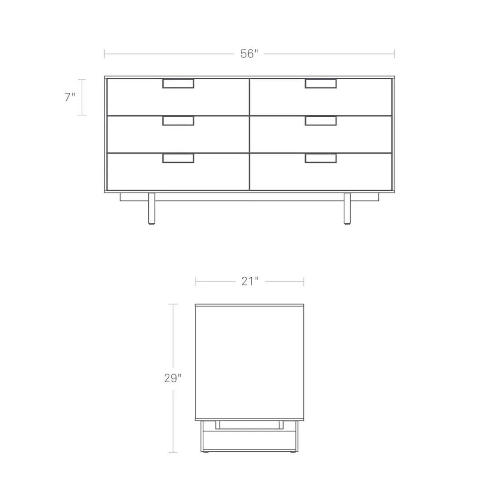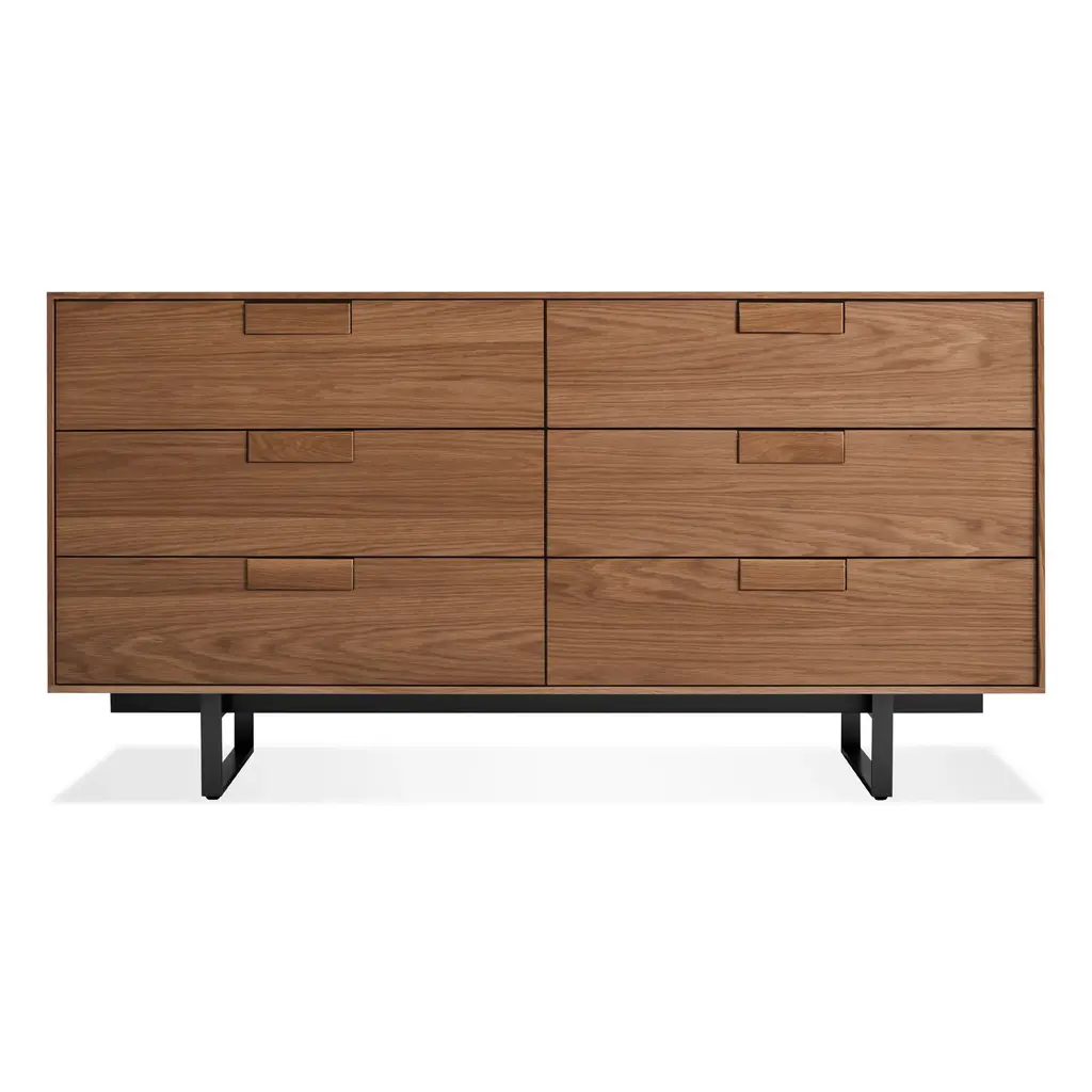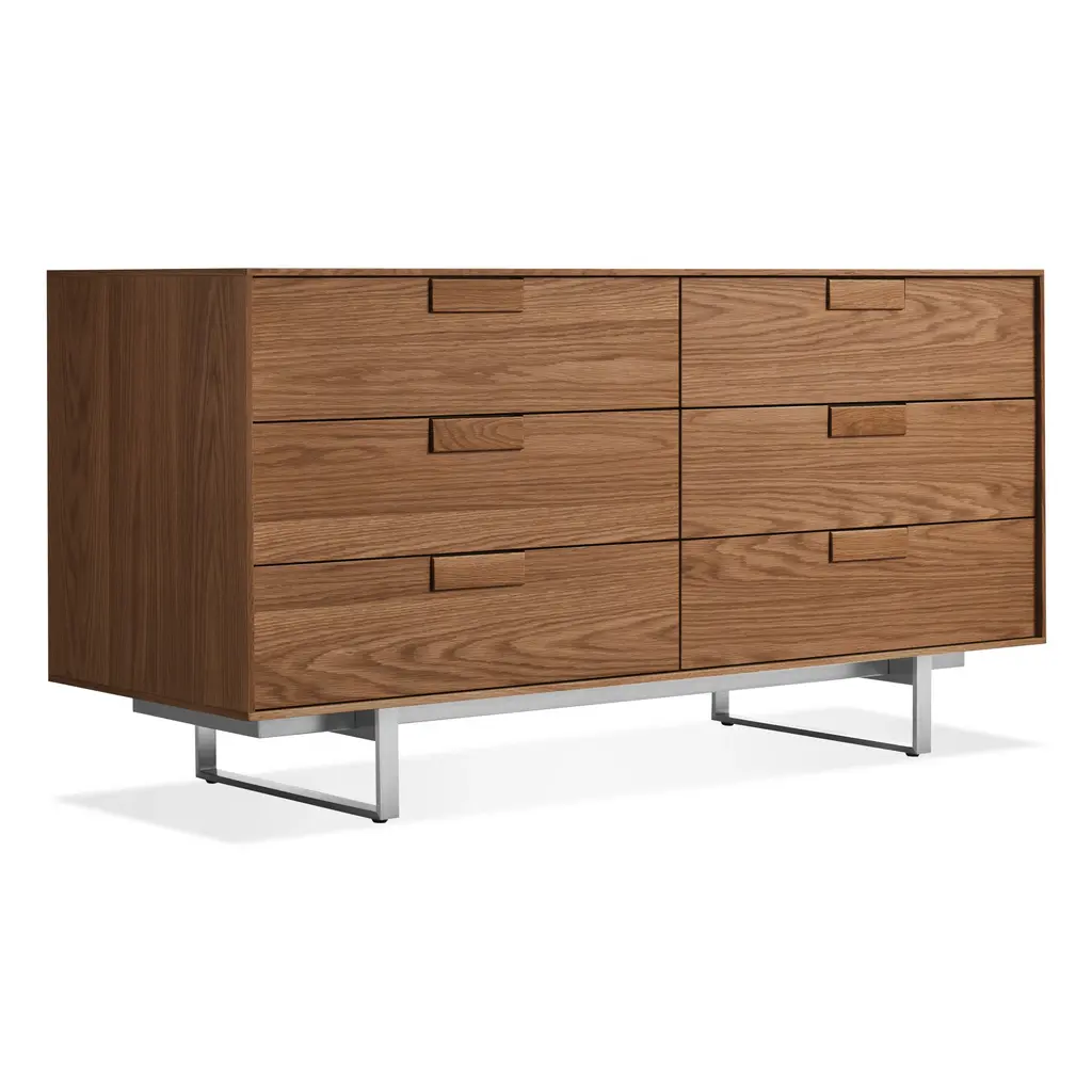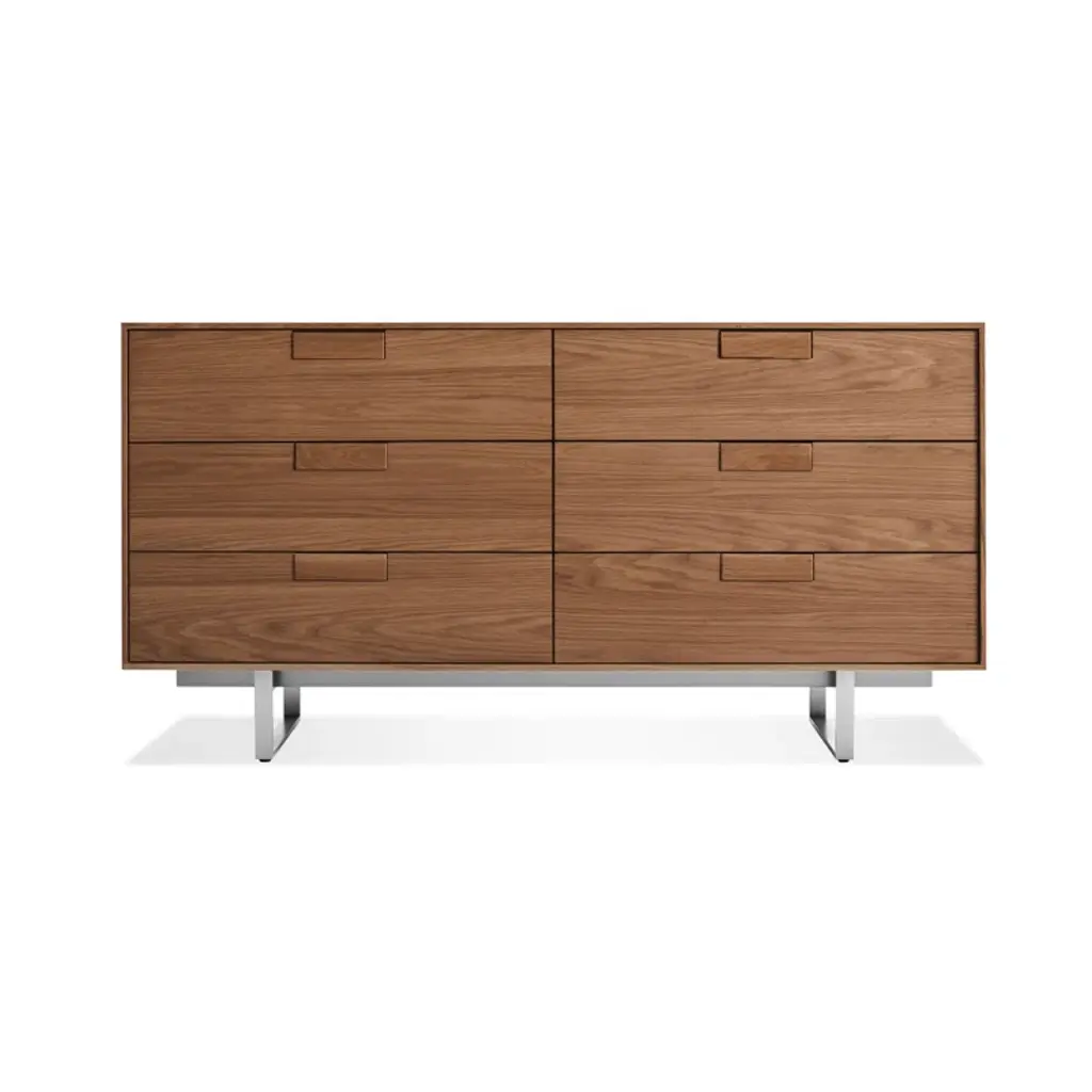 The Blu Dot Series 11 6 Drawer Dresser is all fine lines and thoughtful proportions, a modern dresser that suits the most sophisticated bedroom scheme. This Blu Dot dresser packs 6 large drawers in its horizontal profile, and features door pulls that facilitate a smooth opening and closing motion. Two wood finishes - Smoke and Walnut - and brushed steel legs ensure that this Blu Dot Series 11 Dresser seamlessly blends into a variety of interior design compositions. Features