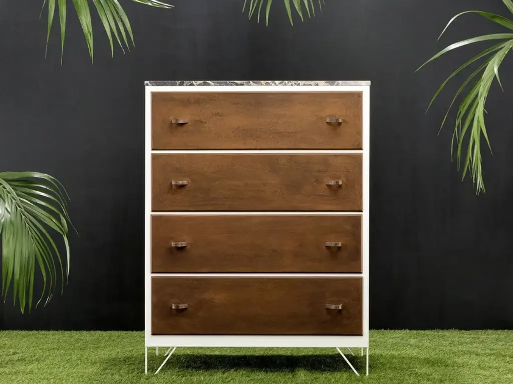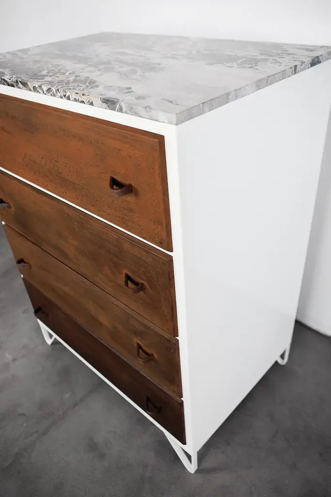 Piece of furniture inspired by the classical “grandmother’s chest of drawers “, from which it takes the marble top surface and its general vintage feeling. Chromatic combinations combined with steel finishes result in strong materials expression. A custom piece of furniture with a unique and timeless personality to convey a feeling of “memory” within a modern context.Materials: tubular profile, steel plate and marbleFinishes: steel, corten, RAL
