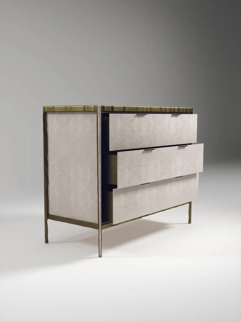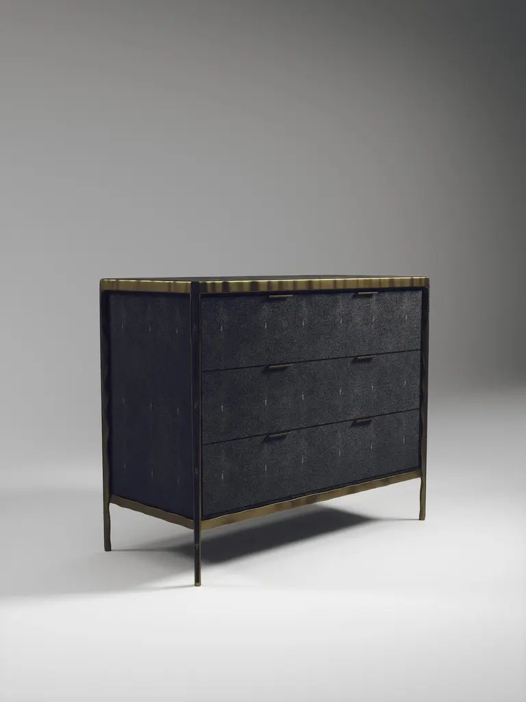 The Paris based label has distinguished themselves since their launch, with their iconic use of shagreen mixed with brass and other exotic materials. All furniture is handcrafted by skilled artisans, ultimately making each piece unique, designed in Paris and produced in the Philippines.The Melting Chest of Drawers by R&Y Augousti is an elegant piece for any space. The black shagreen inlaid piece is classic, but accentuated by their signature organic melting bronze-patina brass frame. This sideboard includes 3 drawers with 6 flat handles. This piece is part of the Melting Capsule, see images at end of slide of the collection. Available in other finishes, see images at end of slide. Custom sizing / finishing available in requestMeasures: 110 x 50 x 90 cm All R & Y Augousti pieces are handmade by artisans, ultimately making each piece unique. Custom color/sizing available on request. Wipe clean with soft dry cloth.Acclaimed design duo Ria & Yiouri Augousti have established themselves since the 1990s as pioneers of modern-vintage style through their luxurious Art Deco inspired collections.The Paris based label has distinguished themselves since their launch, with their iconic use of shagreen mixed with brass and other exotic materials. All furniture is handcrafted by skilled artisans, ultimately making each piece unique. All shagreen-covered items should be kept out of direct sunlight, color variants may occur on the stingray and other exotic finishes, but this showcases the Parisian label's commitment to creating authentic luxurious products using natural components.