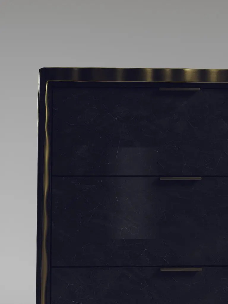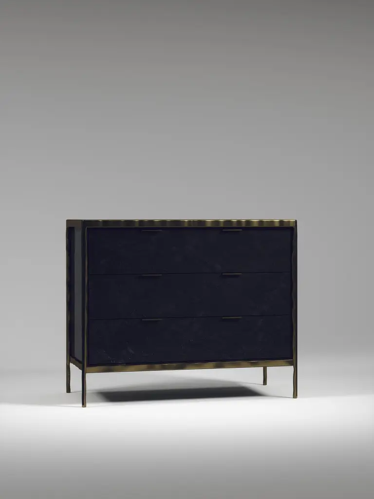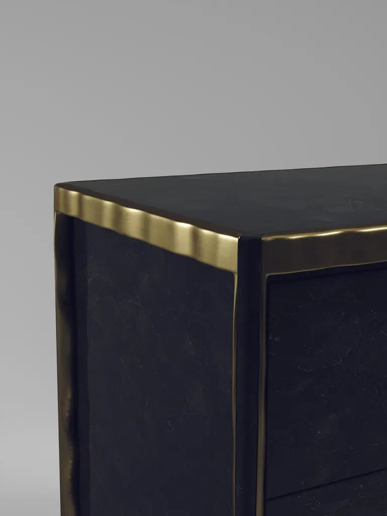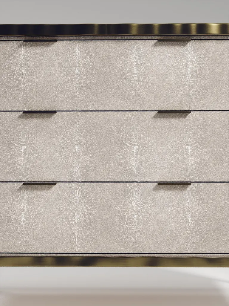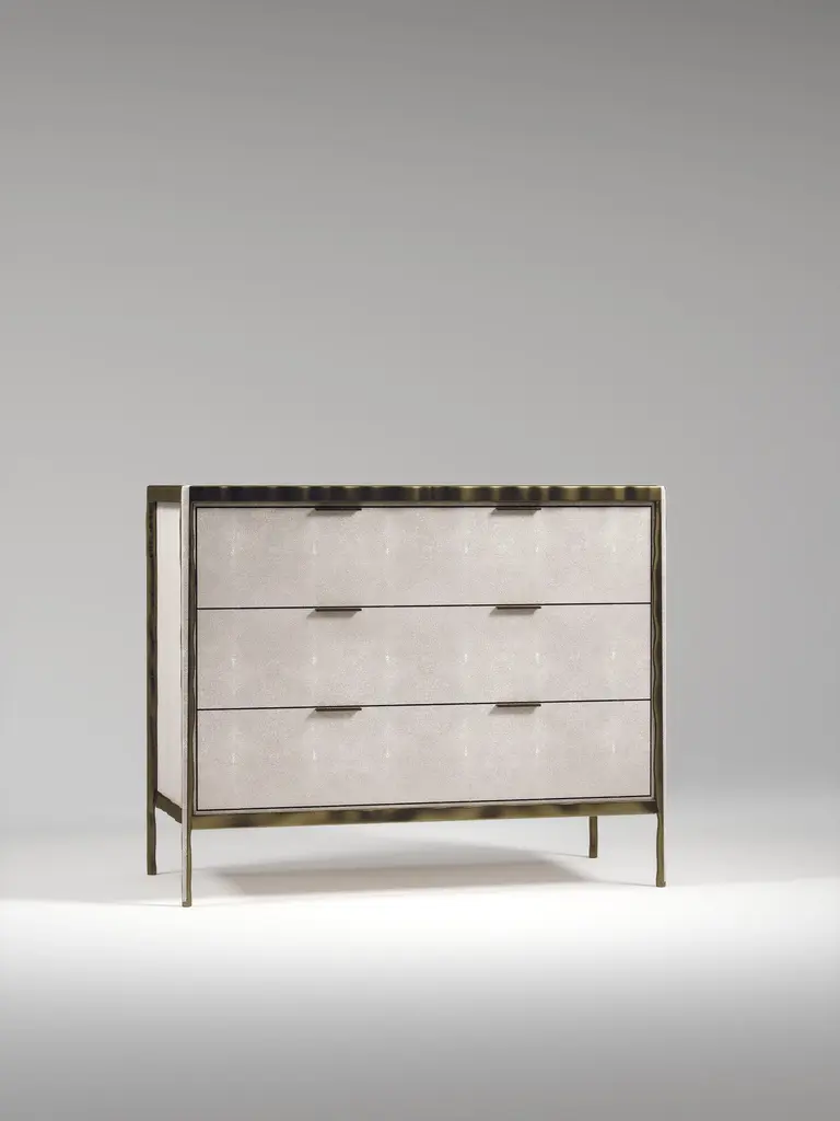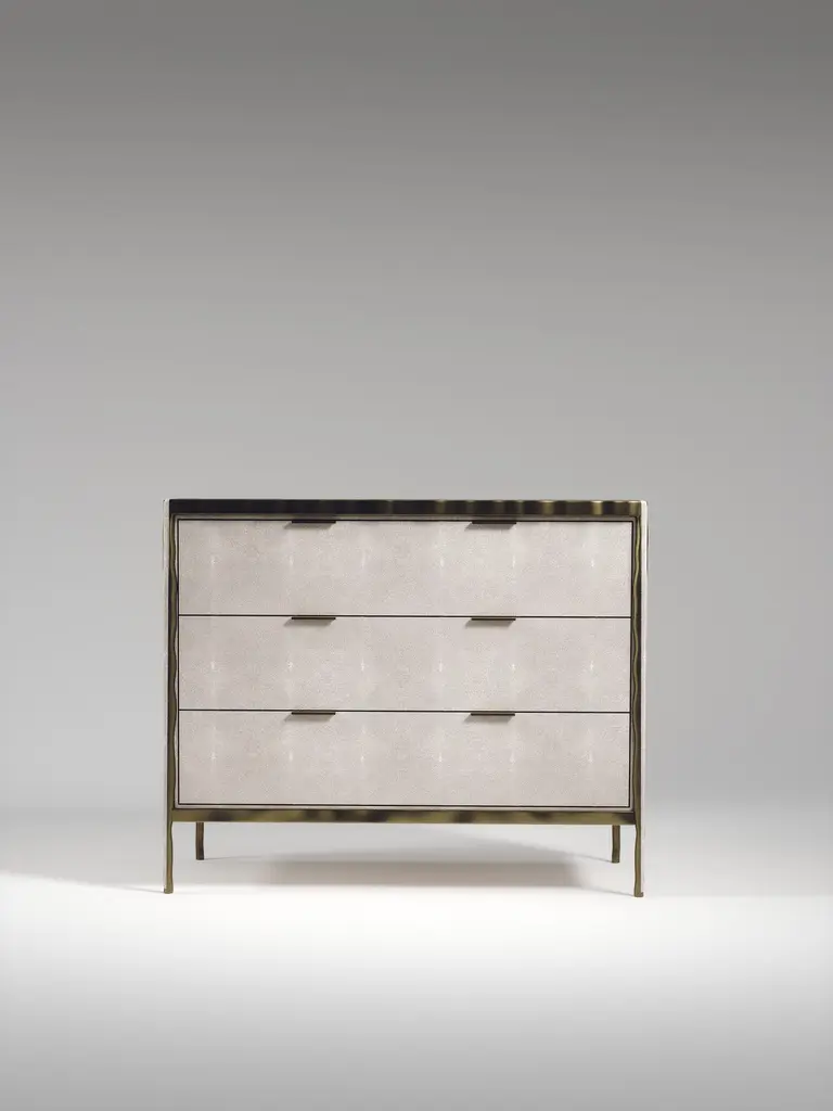 The Paris based label has distinguished themselves since their launch, with their iconic use of shagreen mixed with brass and other exotic materials. All furniture is handcrafted by skilled artisans, ultimately making each piece unique, designed in Paris and produced in the Philippines.The Melting Chest of Drawers by R&Y Augousti is an elegant piece for any space. The cream shagreen inlaid piece is classic, but accentuated by their signature organic melting bronze-patina brass frame. This sideboard includes 3 drawers with 6 flat handles. This piece is part of the Melting Capsule, see images at end of slide of the collection. Available in other finishes, see images at end of slide. Custom sizing / finishing available in requestMeasures: 110 x 50 x 90 cm All R & Y Augousti pieces are handmade by artisans, ultimately making each piece unique. Custom color/sizing available on request. Wipe clean with soft dry cloth.Acclaimed design duo Ria & Yiouri Augousti have established themselves since the 1990s as pioneers of modern-vintage style through their luxurious Art Deco inspired collections.The Paris based label has distinguished themselves since their launch, with their iconic use of shagreen mixed with brass and other exotic materials. All furniture is handcrafted by skilled artisans, ultimately making each piece unique. All shagreen-covered items should be kept out of direct sunlight, color variants may occur on the stingray and other exotic finishes, but this showcases the Parisian label's commitment to creating authentic luxurious products using natural components.