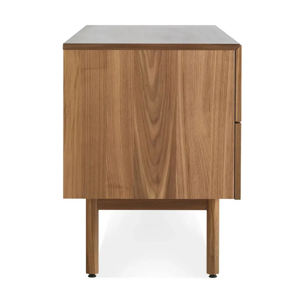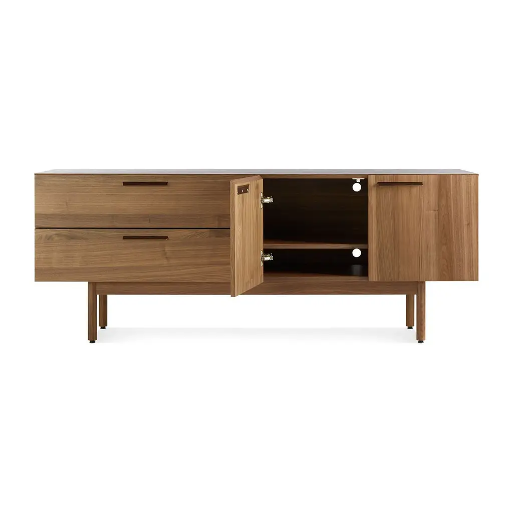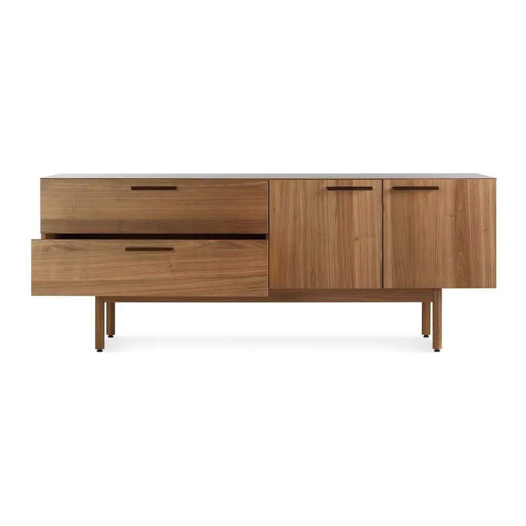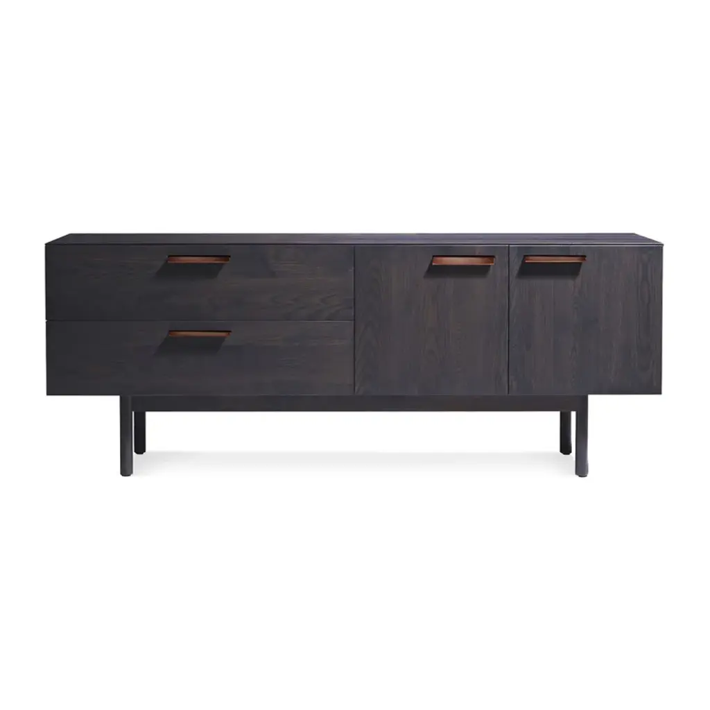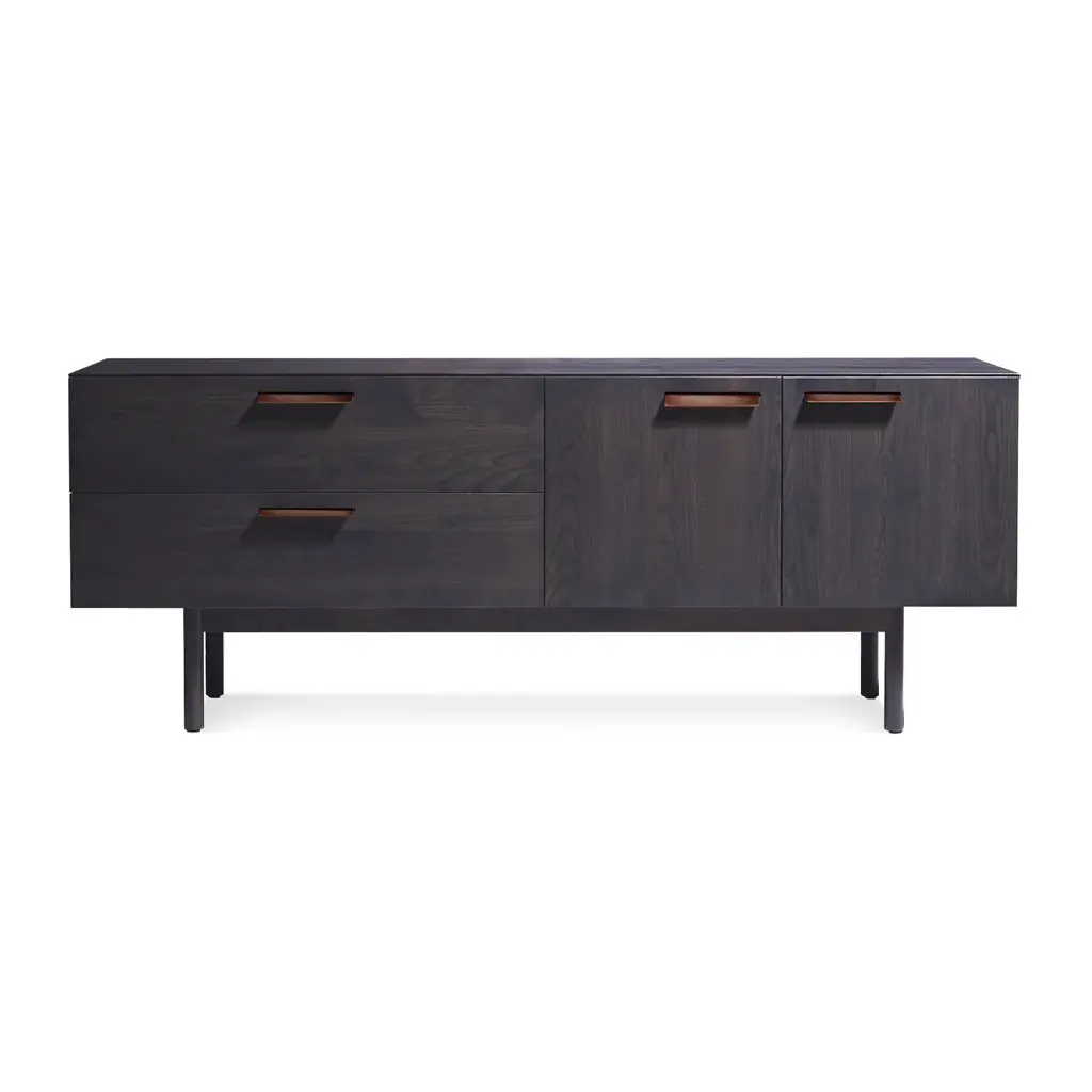 Beautility! Clean details, quality materials, and pure functionality merge in the Shale 2 Drawer/2 Door Dresser from Blu Dot. Featuring solid wood construction and elegant full grain leather pulls, this dresser adds storage panache and practicality to your bedroom, living room or dining room area. Featuring adjustable shelves behind the storage doors and wire management holes for electronics and media, this dresser is an incredibly versatile design that can go from clothing keeper to media management in minutes. Fill with your favorite decor, clothing, or dinnerware for a fabulous storage design ready to elevate your space in neutral style. Features