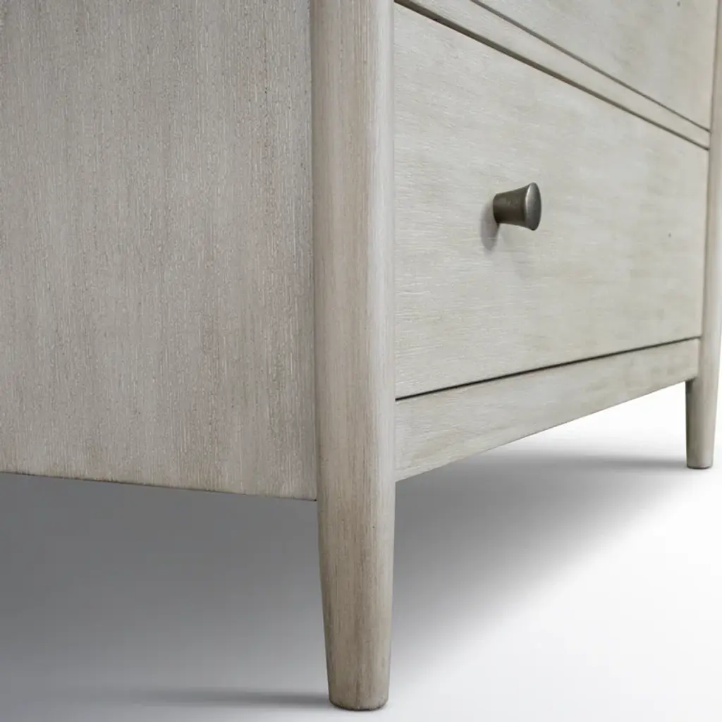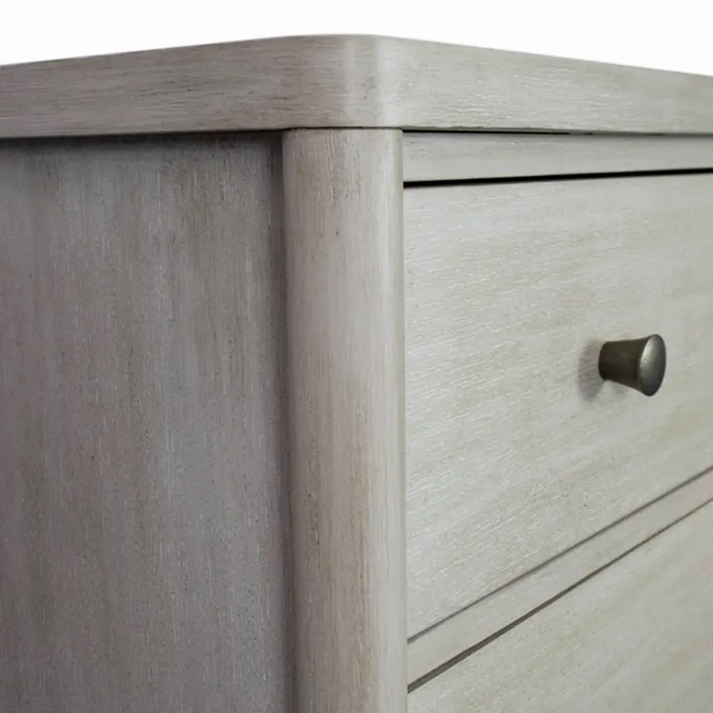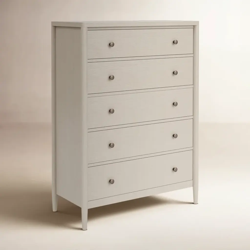 Casual and versatile in design, our 5-drawer dresser offers a lot of storage in a compact footprint. The wooden frame has an off-white painted finish, and the drawers are adorned with aged-bronze hardware for distinctive contrast. We love that the top drawer box is lined with felt – making it the perfect spot for your delicates. Bonus: A wall anchor is included and recommended for extra stability.