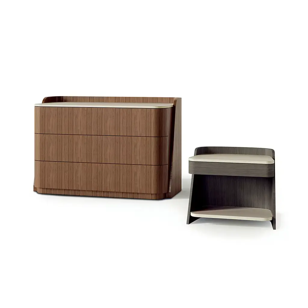 Chest of drawers from the Shape line covered in Canaletto Walnut. Equipped with three large push and pull drawers and slow motion system with a leather interior. Top covered in leather.