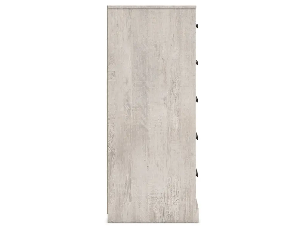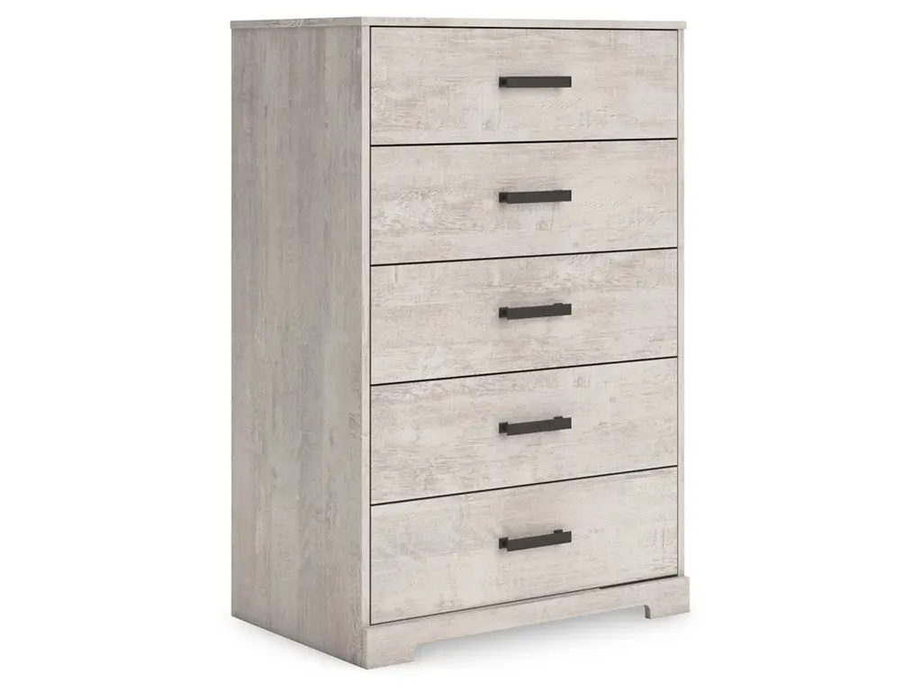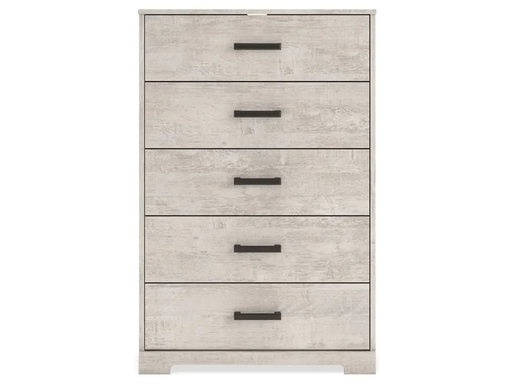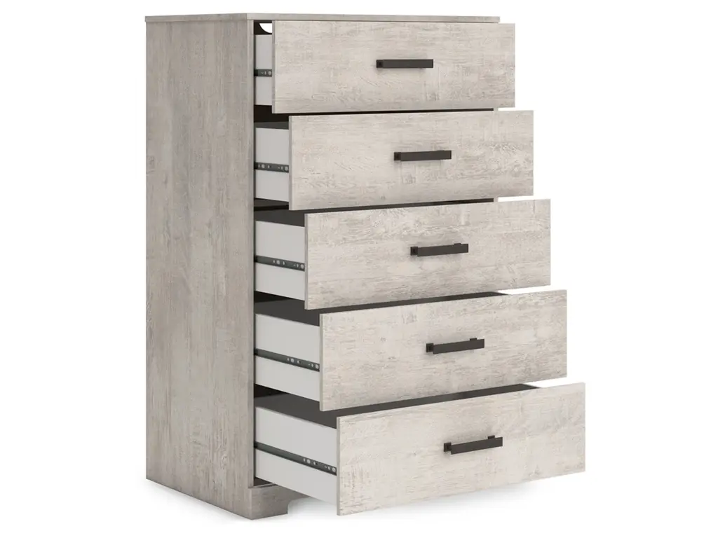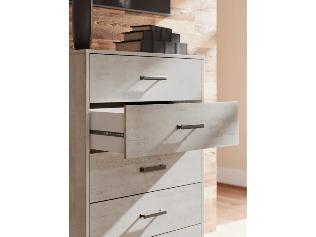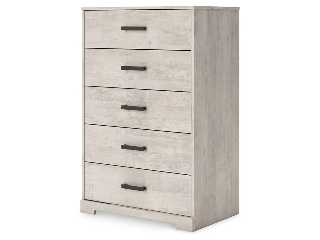 Give casual a new meaning with the chic look of the Shawburn chest of drawers. A light gray finish over replicated oak grain keeps it laid-back and inviting, while substantial pulls in a warm pewter tone add a modern farmhouse touch. Spacious drawers give you plenty of room to store your wardrobe. Talk about a delightfully relaxed vibe in your inner sanctum.