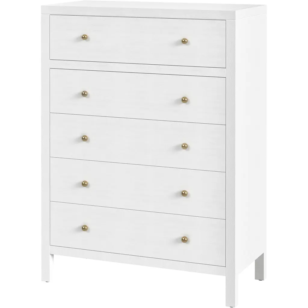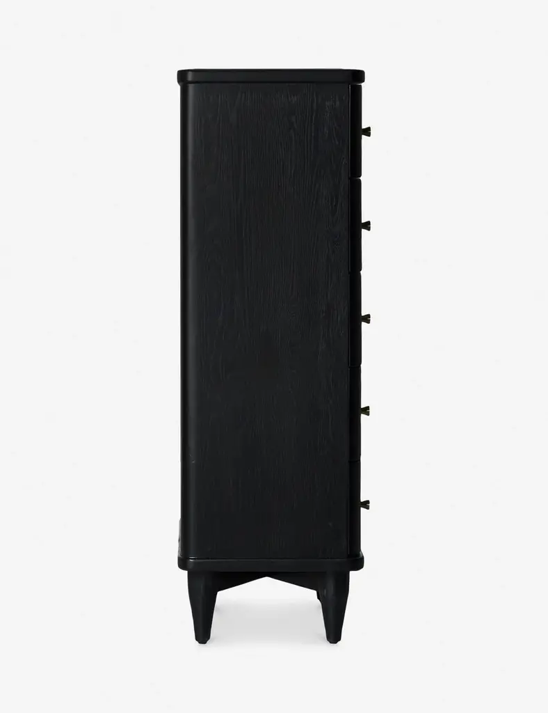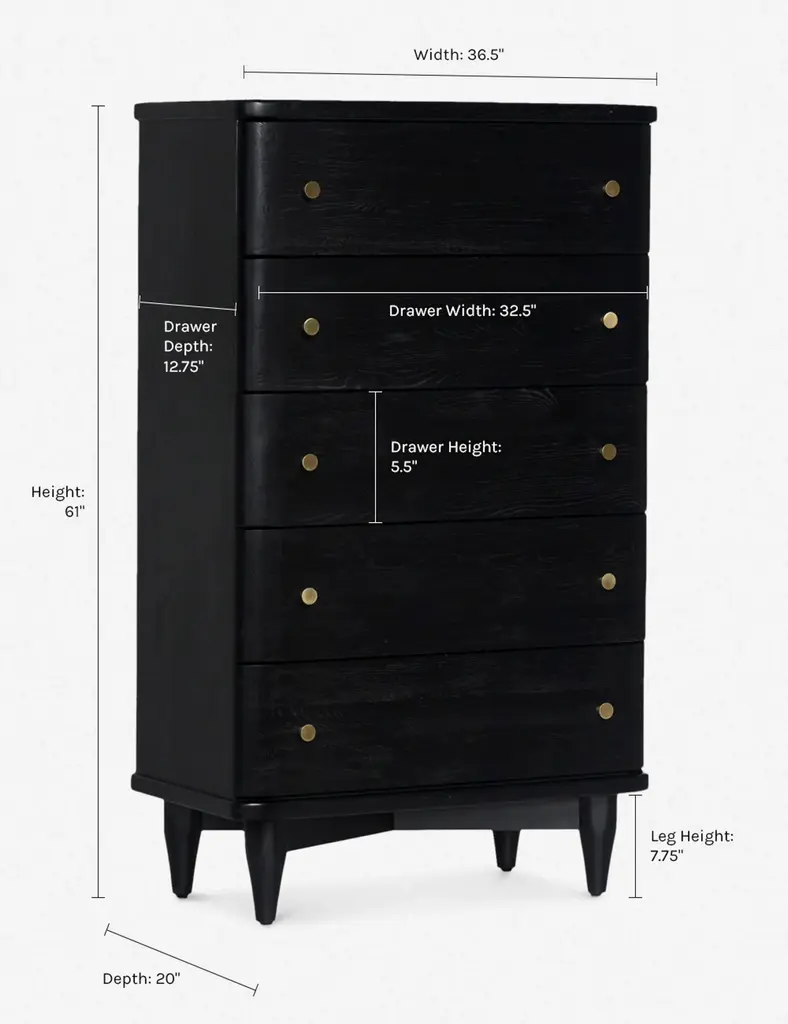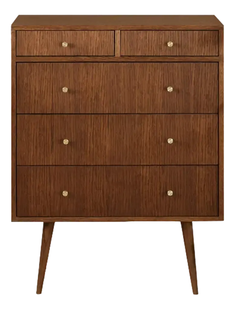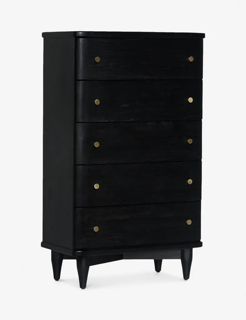The soft, sculpted lines of this FSC-certified oak dresser complement its natural wood grain texture. Set on tapered legs, this tall dresser features five spacious drawers in a compact footprintand its metal pulls offer a distinctive touch. Style it with a vase and fresh greenery.