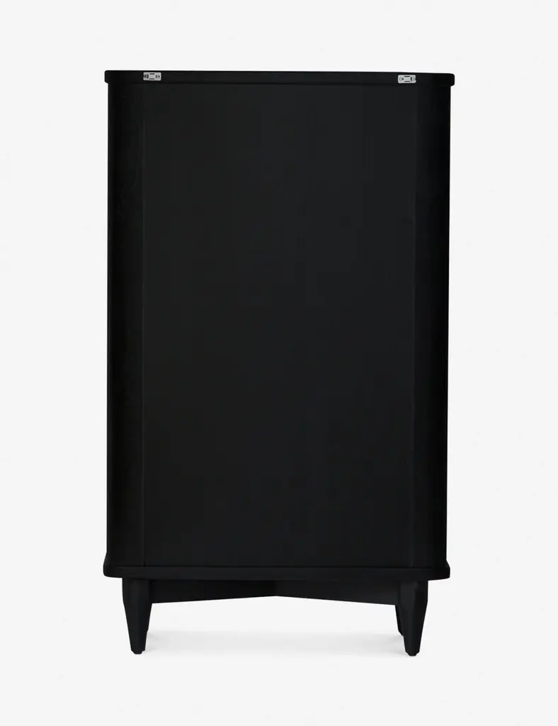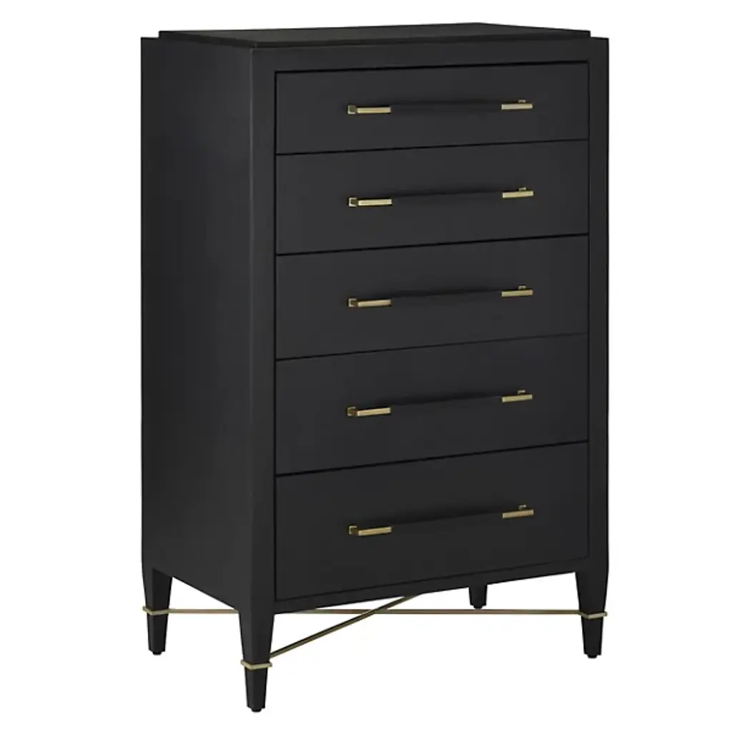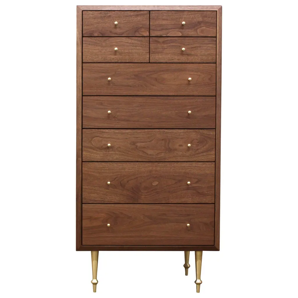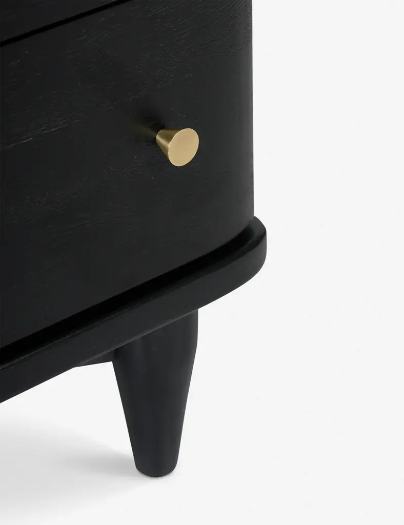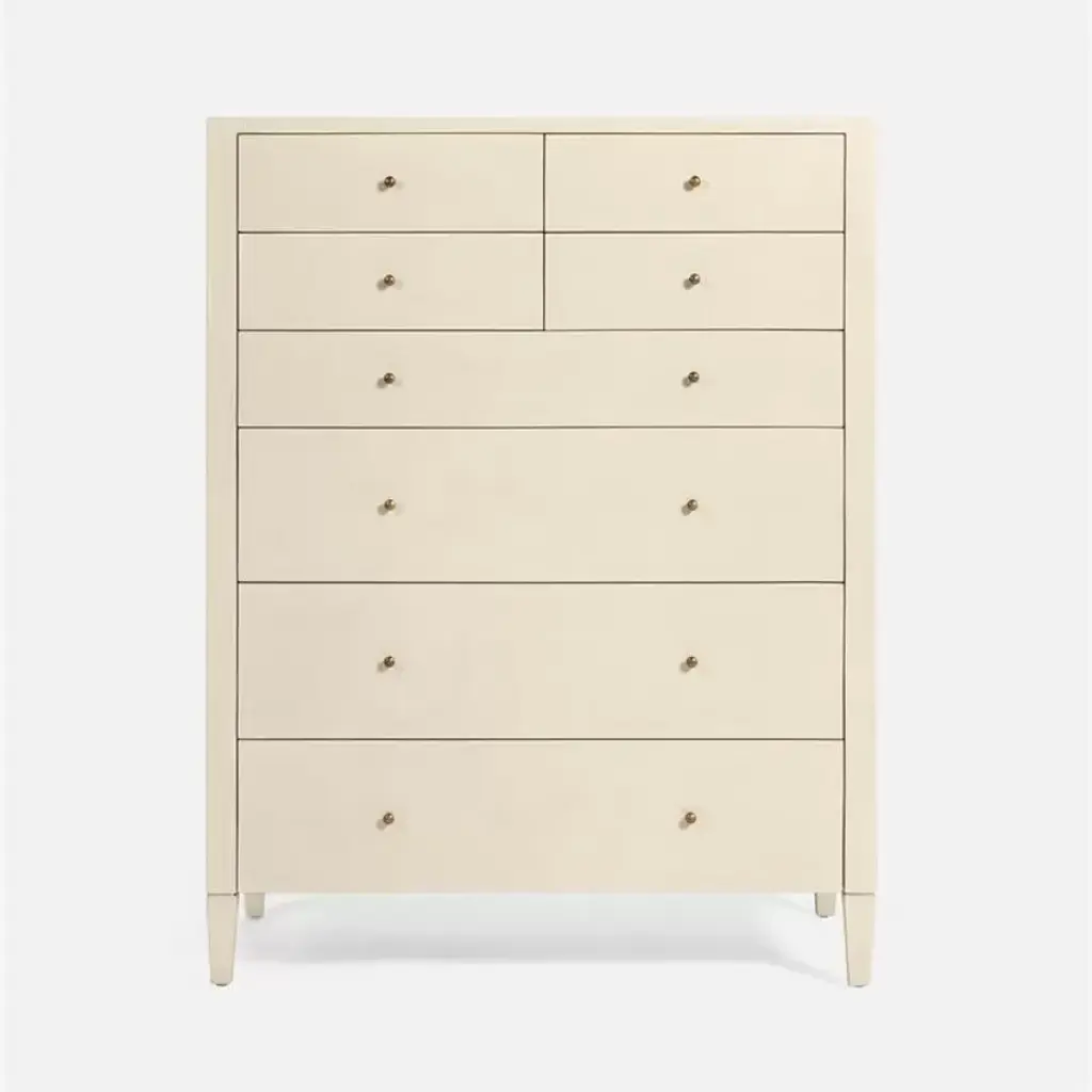 The soft, sculpted lines of this FSC-certified oak dresser complement its natural wood grain texture. Set on tapered legs, this tall dresser features five spacious drawers in a compact footprintand its metal pulls offer a distinctive touch. Style it with a vase and fresh greenery.