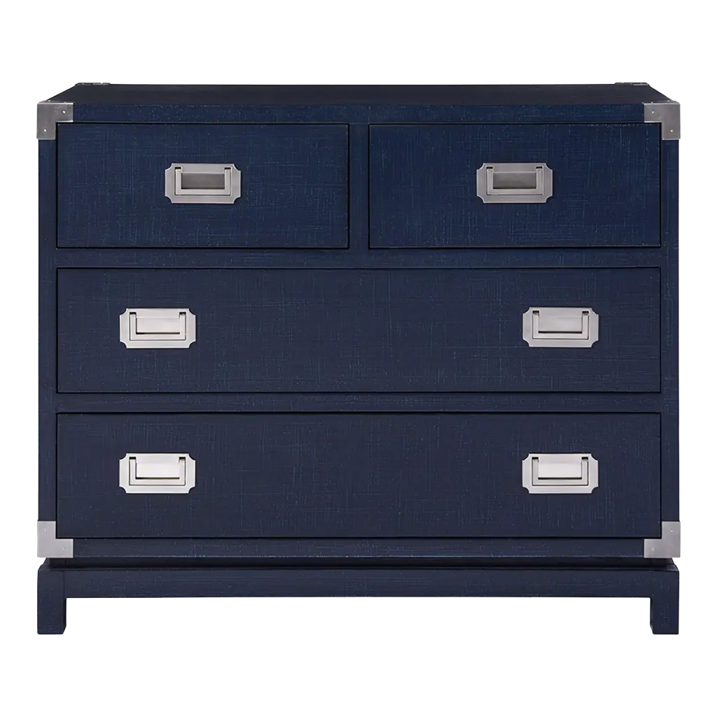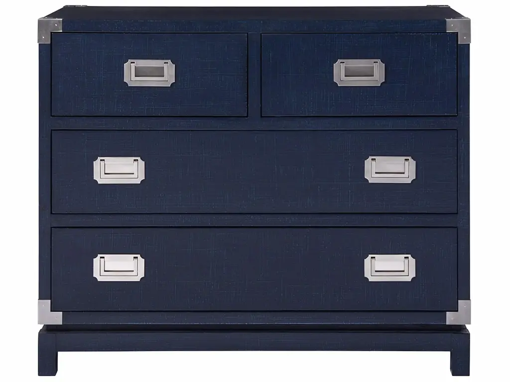 A stunning Marina finish and a vintage trunk-inspired frame define the Coastal Campaign Chest, a bold accent piece built with four drawers and chic inset hardware. - Four drawers - English dovetail on drawer front and back - Drawers are ash veneer sides and backs with plywood bottoms - Cedar bottom drawer