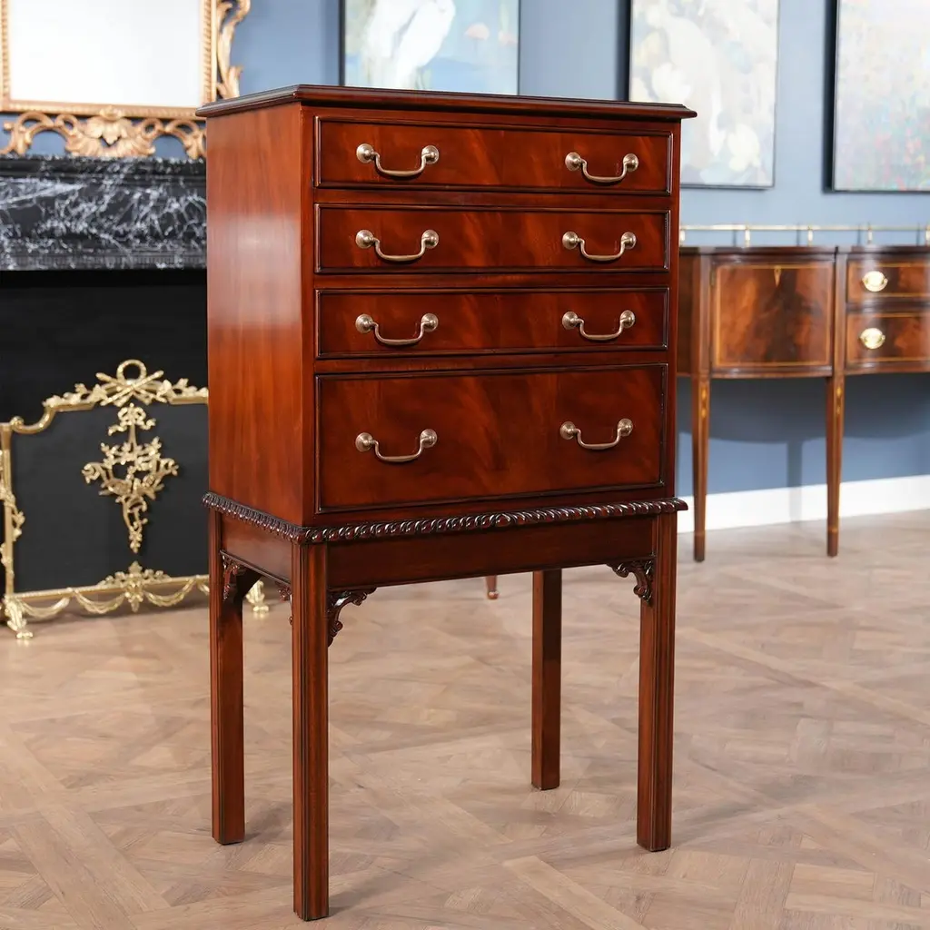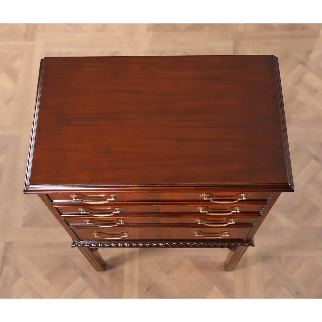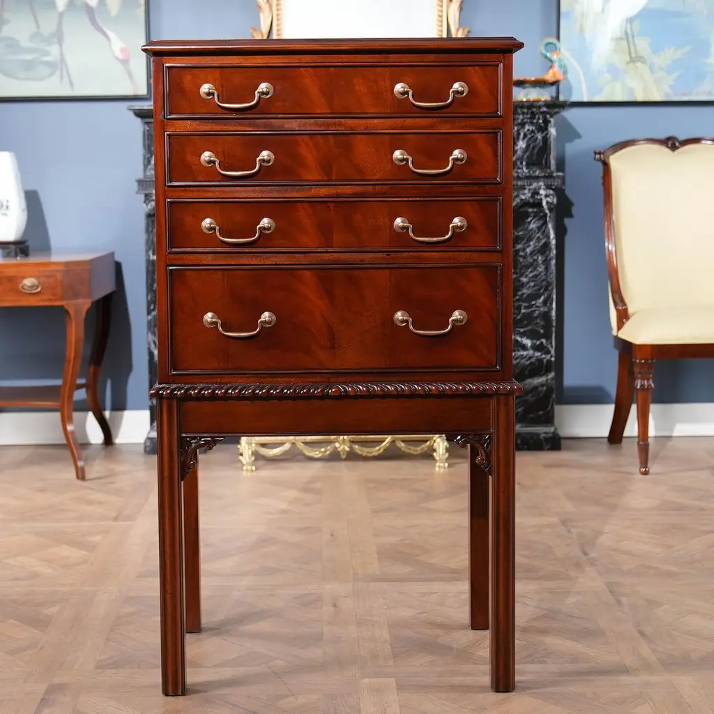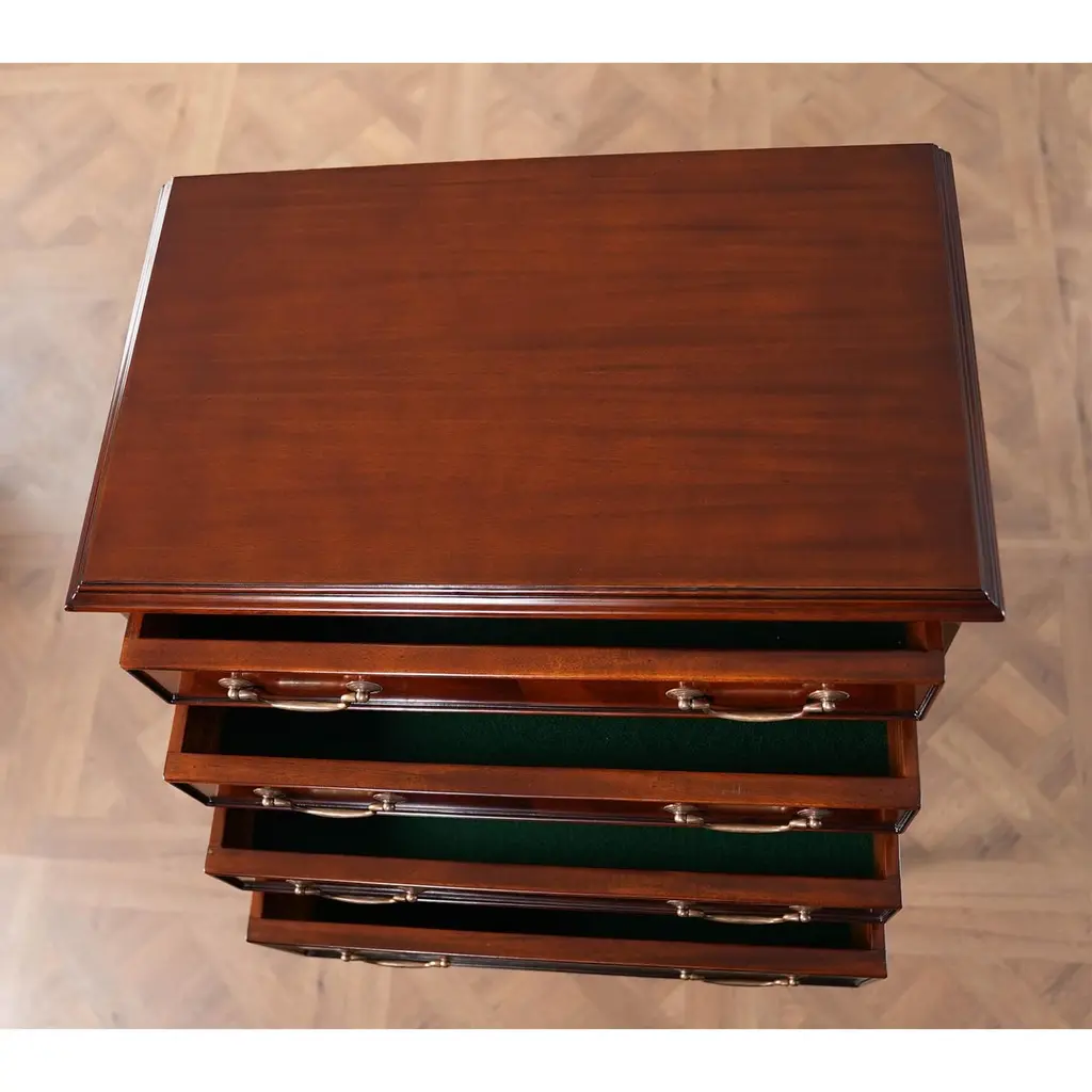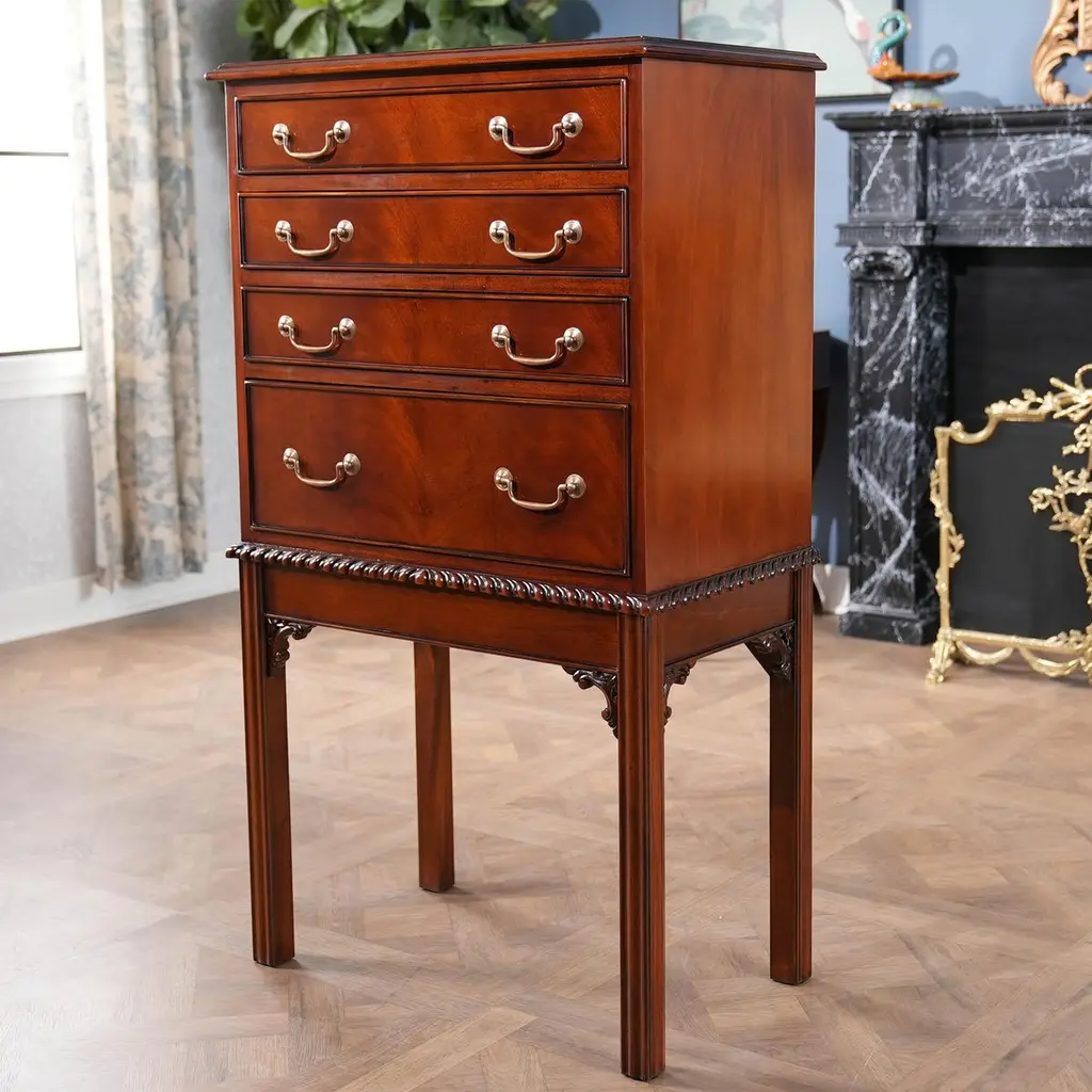 Ideal for smaller spaces the Niagara Furniture Silver Chest offers a lot of storage while using up a small amount of floor space. The four graduated drawers provide a lot of storage space while the tall legs keep the piece looking light and elevated. Produced from the finest quality solid mahogany and mahogany veneers the silver chest features dovetailed drawers designed to last a lifetime. Also useful in many other settings.The top 3 drawers inside measurements are: 22 3/4?w X 12?d X 3?hThe bottom drawer inside measurements are: 22 3/4?w X 12?d X 7?hMeasures 26.5?w x 16?d x 47.5?h metric: 69 x 41 x 122.