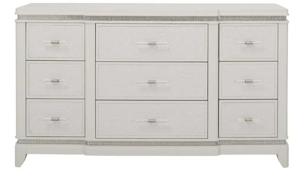 Designed with clean lines and beveled mirror paneling, our Simplicity Collection delivers shimmering style to the bedroom. Hand-applied silver-leaf trim and polished nickel hardware finish off the glamorous look.Exclusive to Z Gallerie.