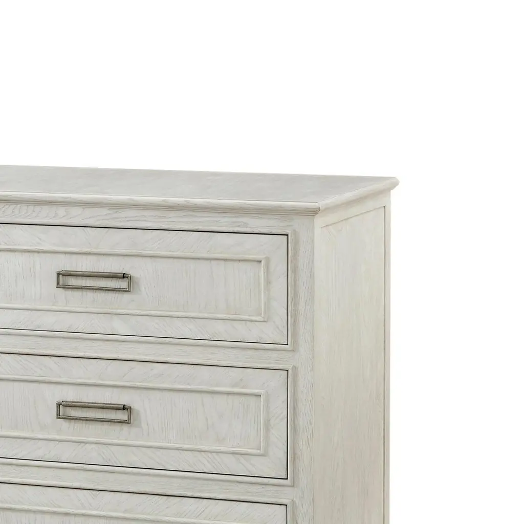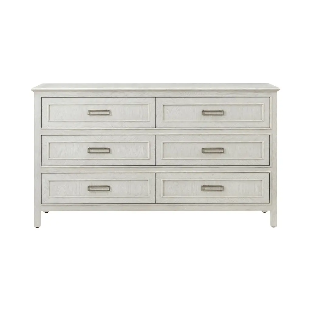 Constructed from oak and finished in a soft white dover finish, this piece highlights the natural beauty of the wood grain with subtle chevron parquetry. Six spacious drawers provide ample storage, each adorned with rectangular metal pulls in a brushed finish for a clean, contemporary touch.Elevated on square tapered legs and framed in minimalist molding, this dresser brings a serene and structured presence to bedrooms. Its neutral tone and timeless profile make it effortlessly versatile across interior styles from transitional to coastal to contemporary.Dimensions: 64" W x 20" D x 36" H