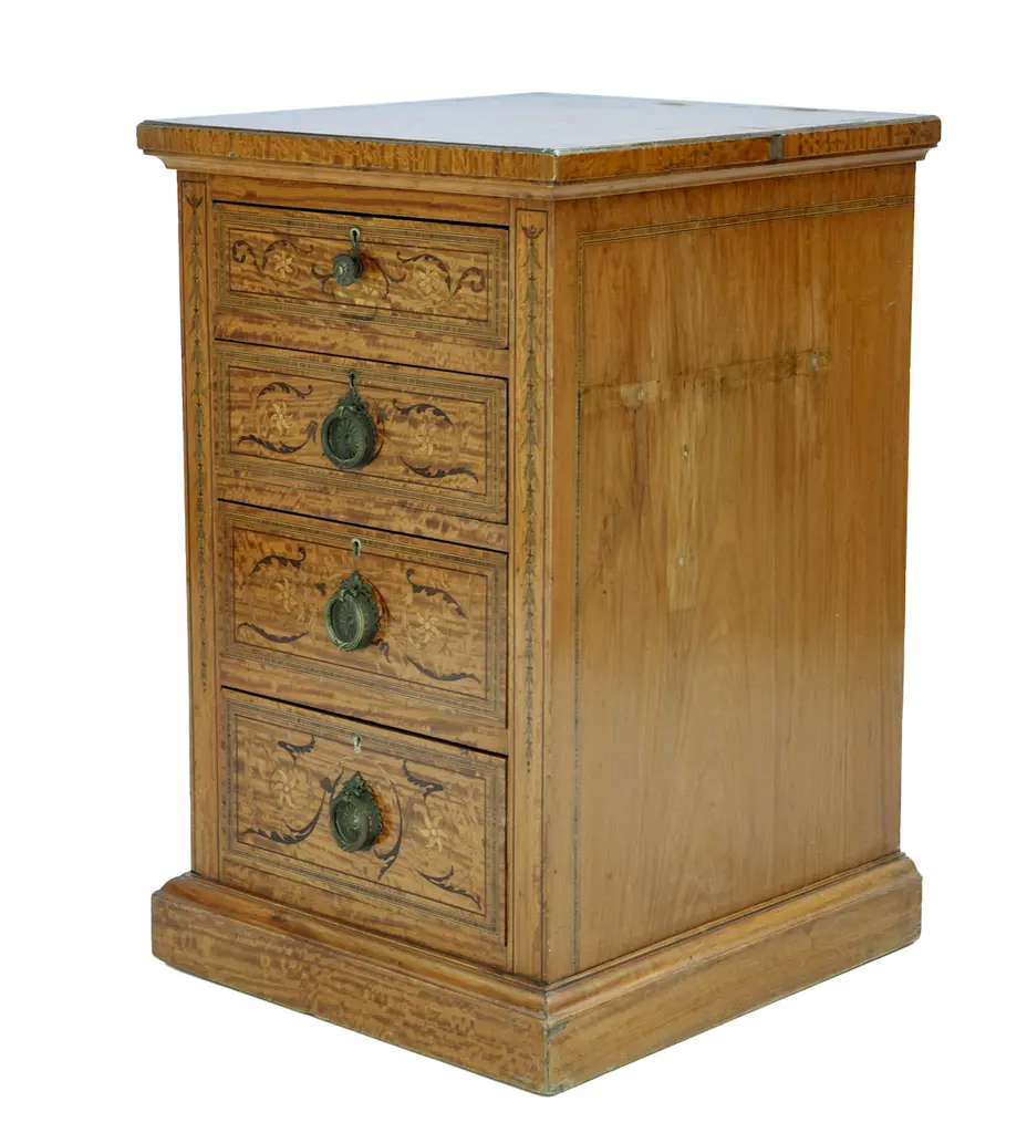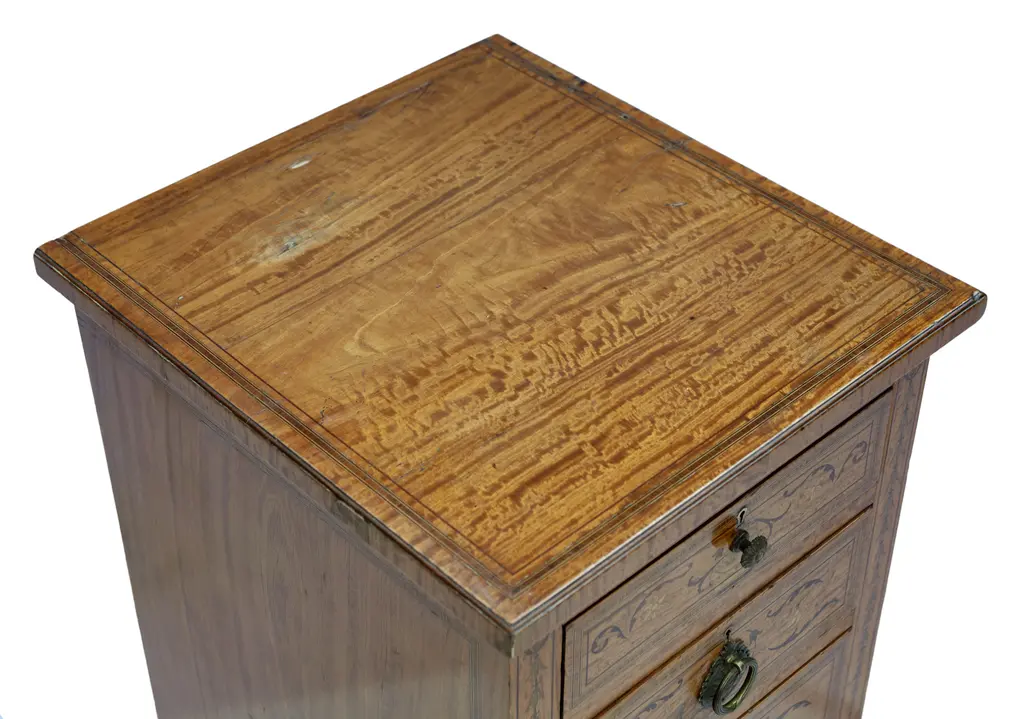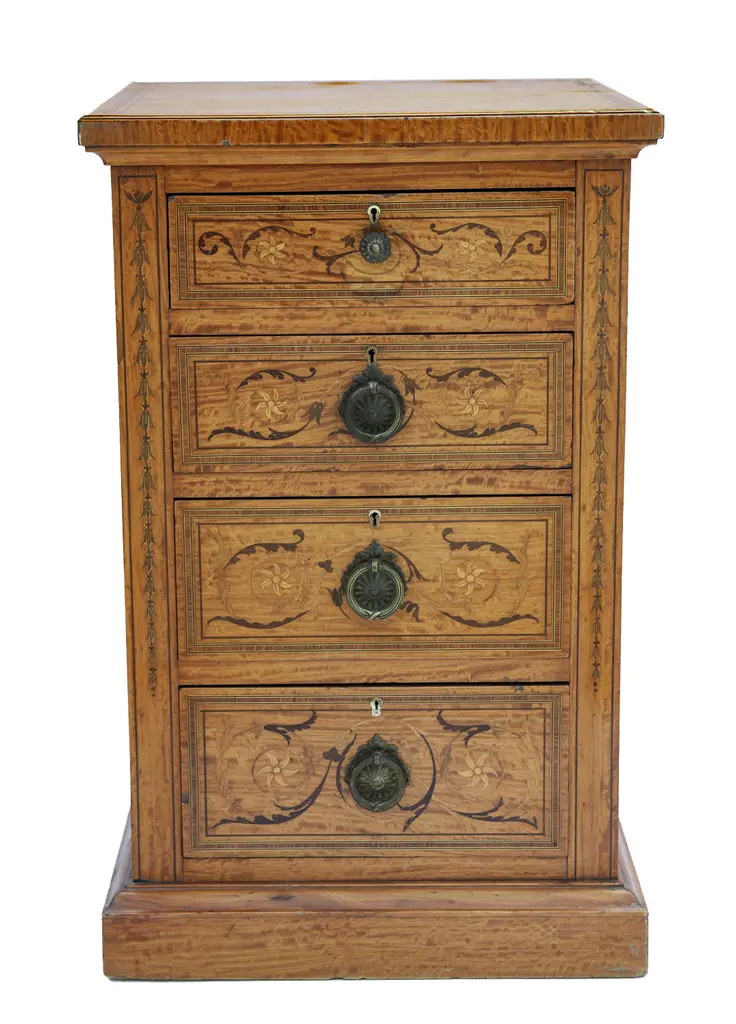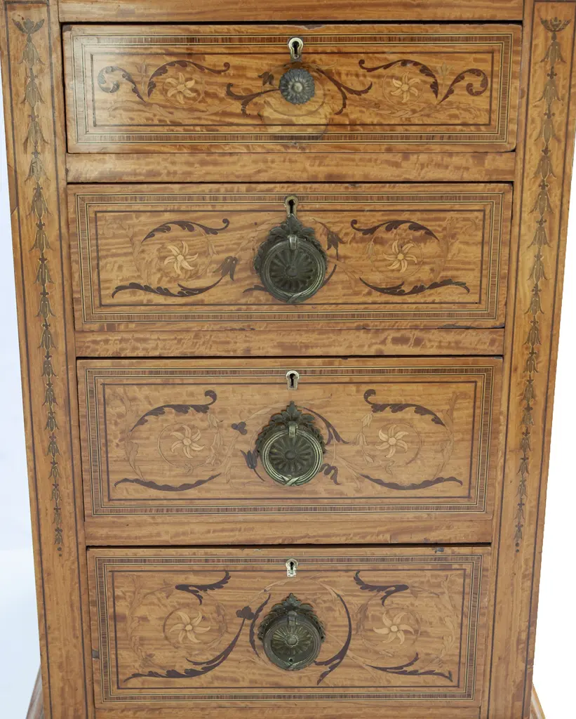 Rare pair of 18th Century Dutch Marquetry slender Edwardian chests/ornate original bronze hardware. Provided are decorative keys for the keyed drawers, however they do not lock or unlock the drawers. An incredible display of fine craftsmanship.