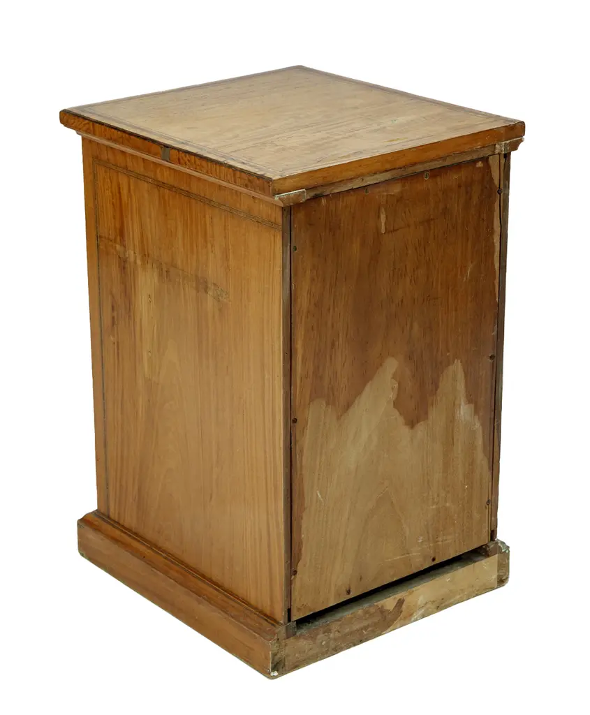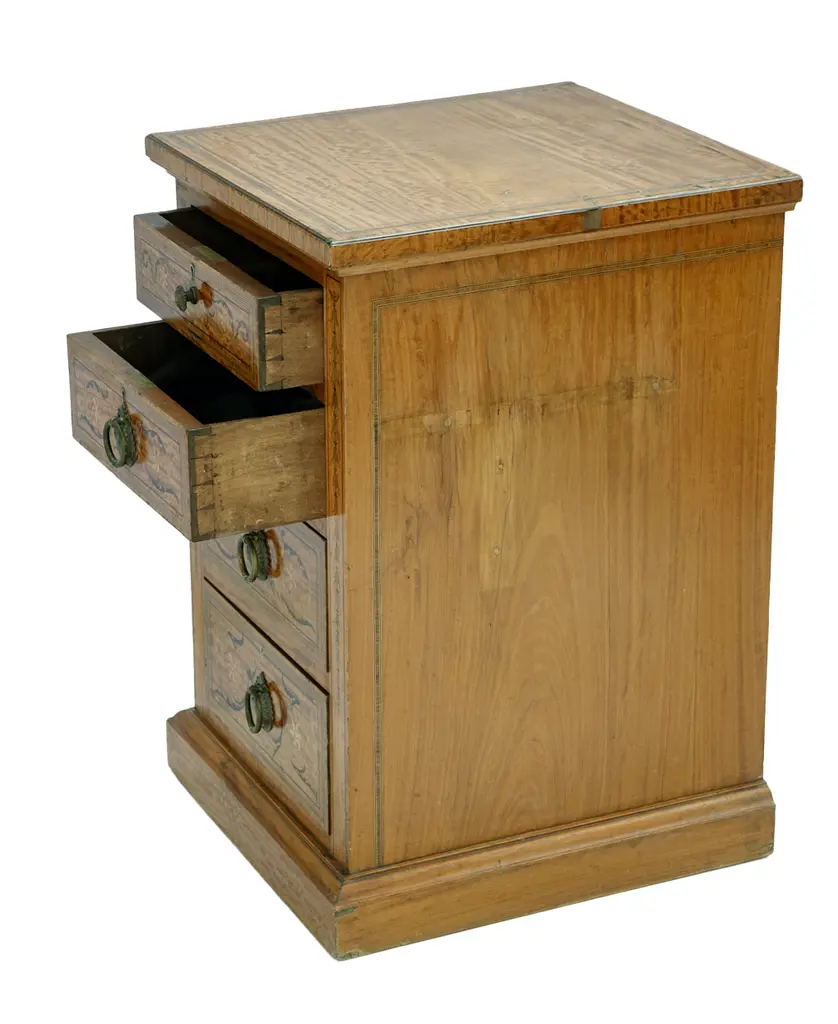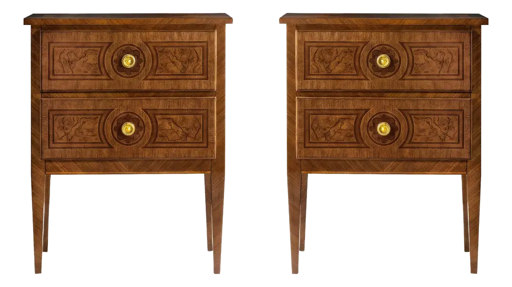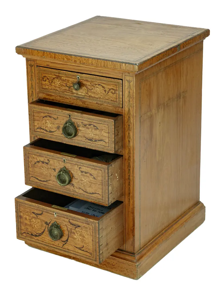 Rare pair of 18th Century Dutch Marquetry slender Edwardian chests/ornate original bronze hardware. Provided are decorative keys for the keyed drawers, however they do not lock or unlock the drawers. An incredible display of fine craftsmanship.