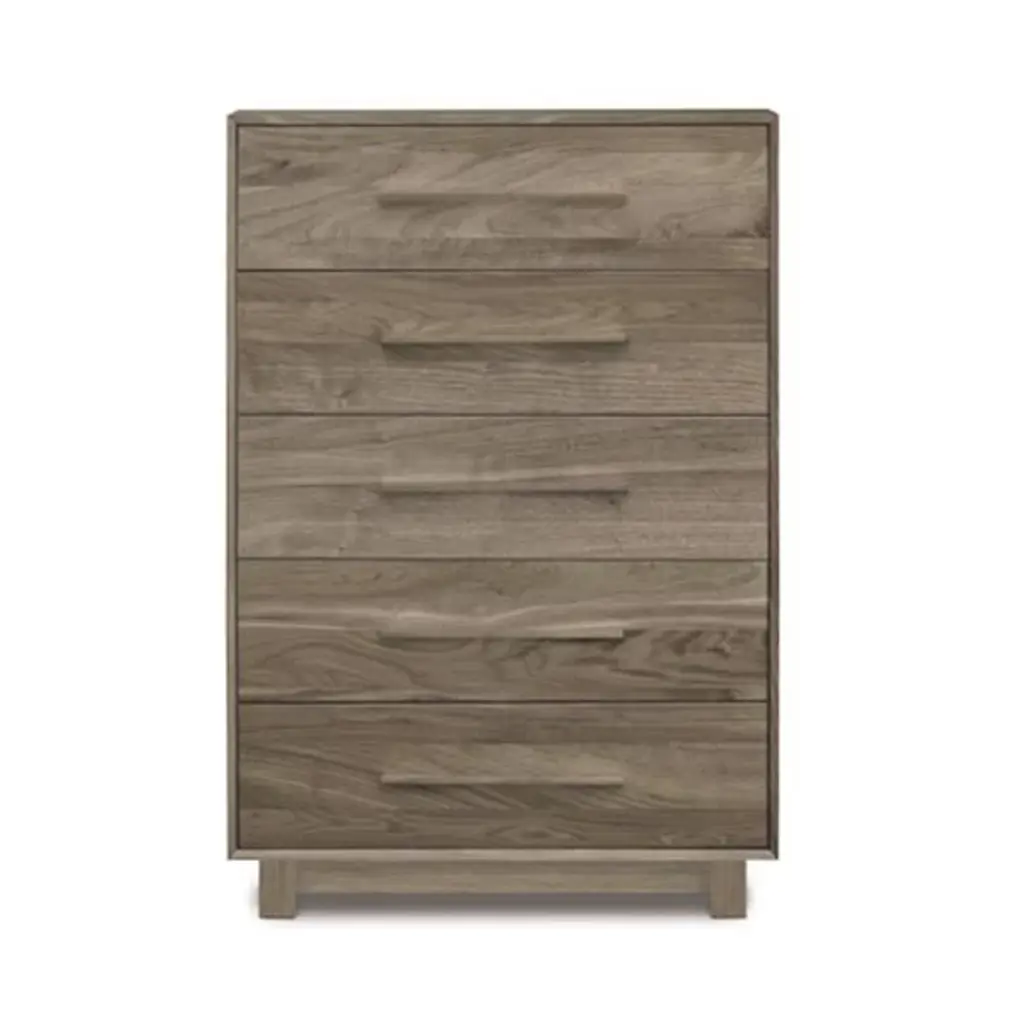 Tangible minimalism from every angle. Look to the Copeland Furniture Sloane 5 Drawer Dresser - Wide to complement your modern or traditional style bedroom. Precise right angles, crisp clean lines and boxy legs come together to give this compact dresser its smart urban flavor. Five drawers with self-closing glides provide ample storage for clothes, household items or linen. Made from solid American Hardwood with quality craftsmanship throughout, the dresser features dovetail constructed drawers, a century's old joinery technique that makes for extremely strong furniture that will last for many lifetimes. Combined with other companion pieces from the Sloan bedroom collection, this chest of drawers is an essential storage piece for a well-dressed master suite, guest bedroom, den or hallway.