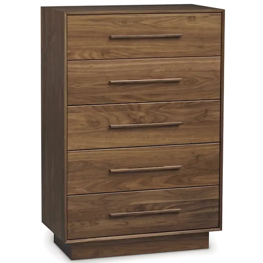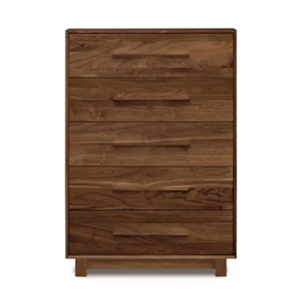 Tangible minimalism from every angle. Look to the Copeland Furniture Sloane 5 Drawer Dresser - Wide to complement your modern or traditional style bedroom. Precise right angles, crisp clean lines and boxy legs come together to give this compact dresser its smart urban flavor. Five drawers with self-closing glides provide ample storage for clothes, household items or linen. Made from solid American Hardwood with quality craftsmanship throughout, the dresser features dovetail constructed drawers, a century's old joinery technique that makes for extremely strong furniture that will last for many lifetimes. Combined with other companion pieces from the Sloan bedroom collection, this chest of drawers is an essential storage piece for a well-dressed master suite, guest bedroom, den or hallway.