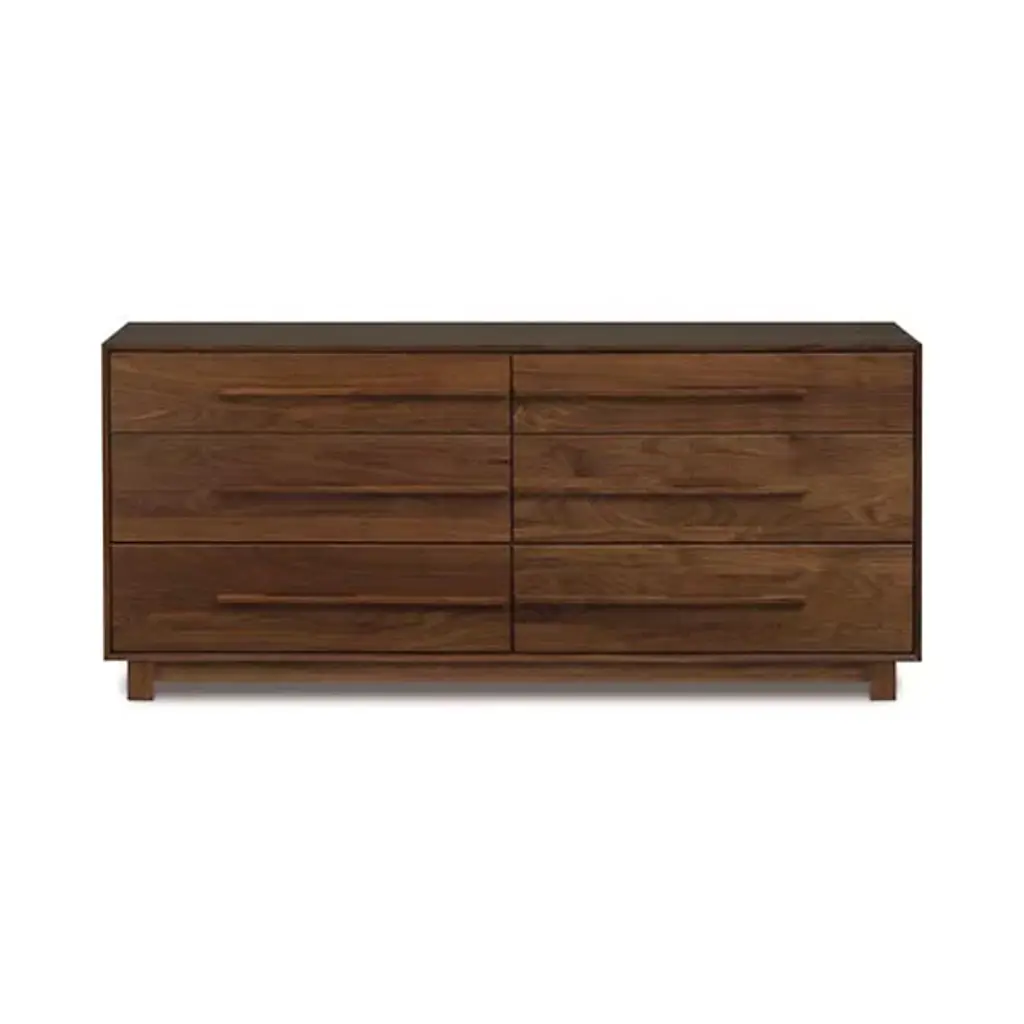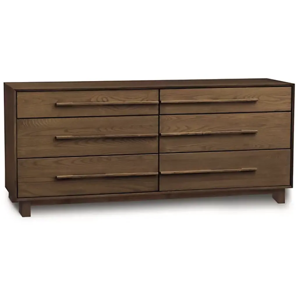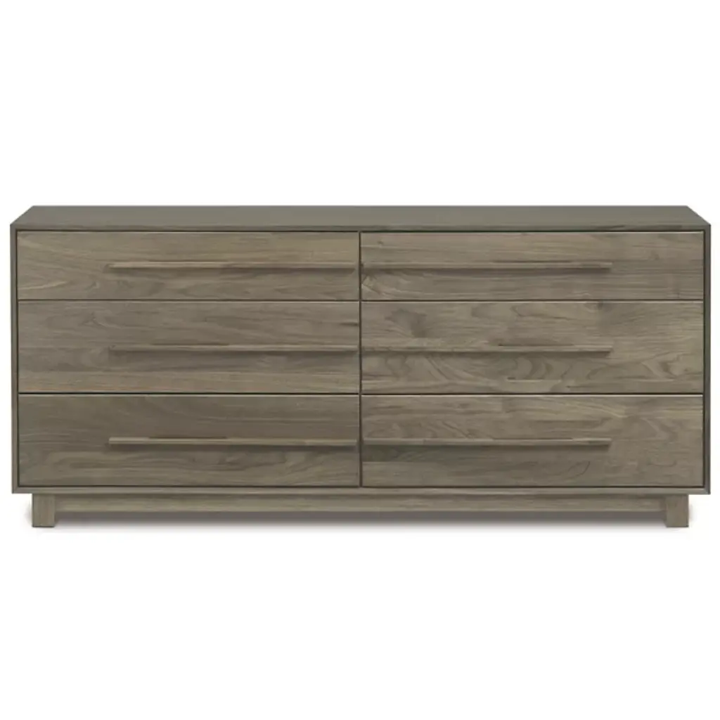 Classic proportions with serene simplicity. Here to help manage your wardrobe, the Sloane 6 Drawer Dresser by Copeland Furniture does it in relaxed minimalist style. Low and wide, the double dresser showcases beautiful natural wood grains with long sleek handles that almost meet, adding to the serene symmetry of this timeless design. Crafted from solid American Hardwoods, the dresser features a configuration of 2 small top drawers over 4 full size drawers, the perfect home for your favorite accessories, clothes or linens. Dovetail joinery and whisper soft self-closing drawer glides add to the heirloom quality of this wide dresser. Put it to use in a master bedroom, guest room or in a den, study or hallway.