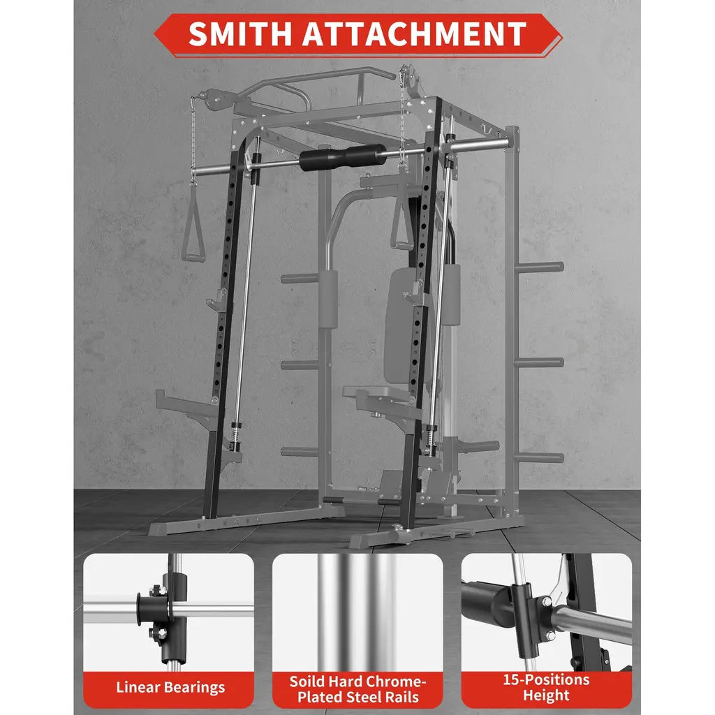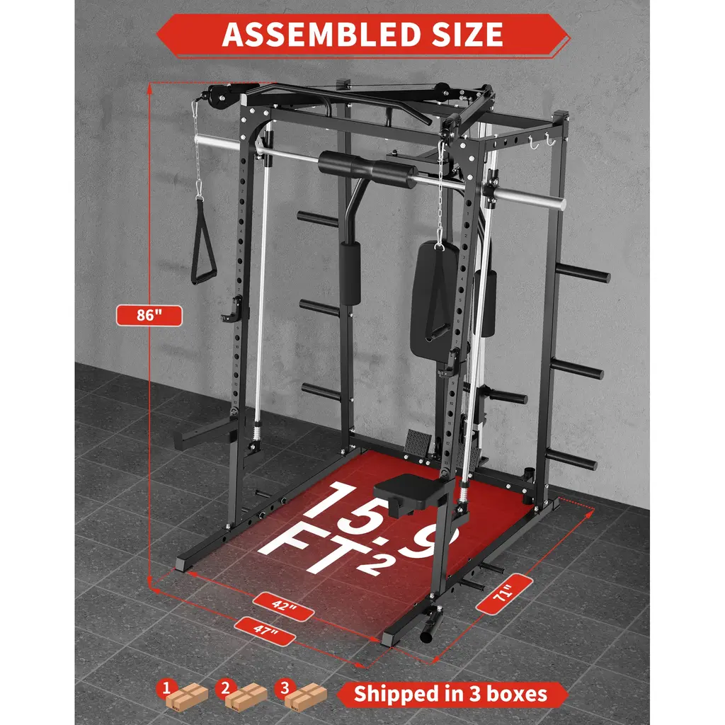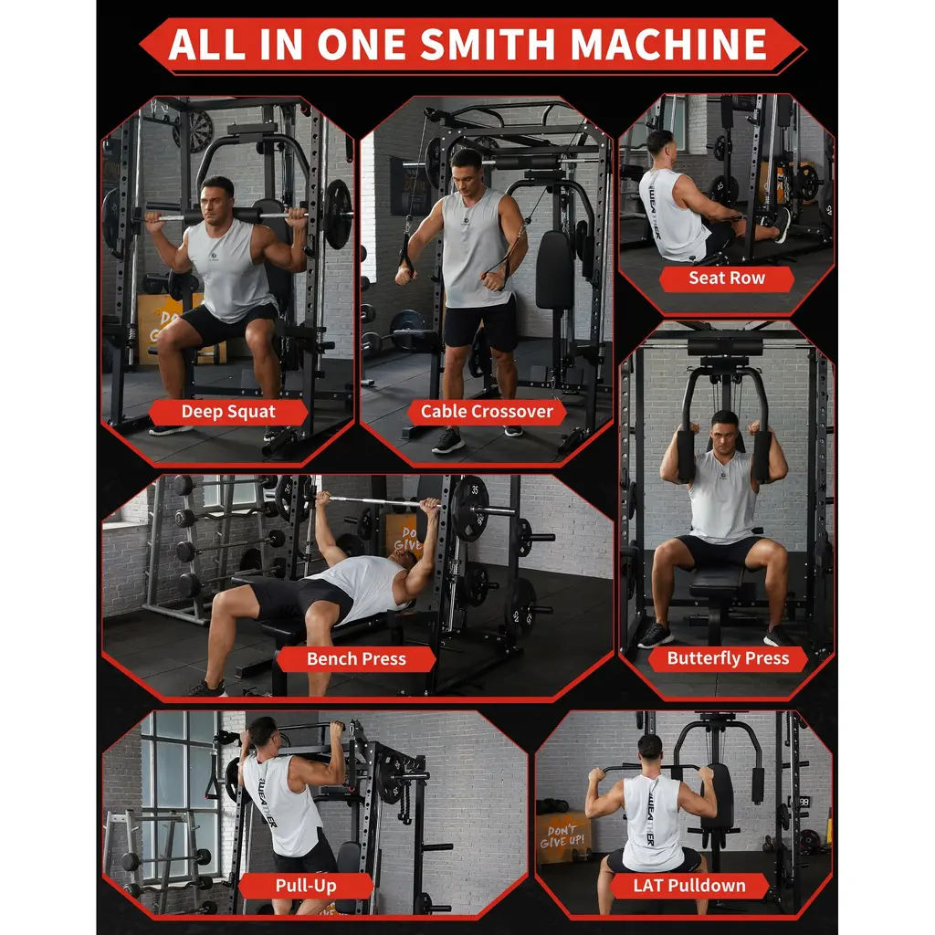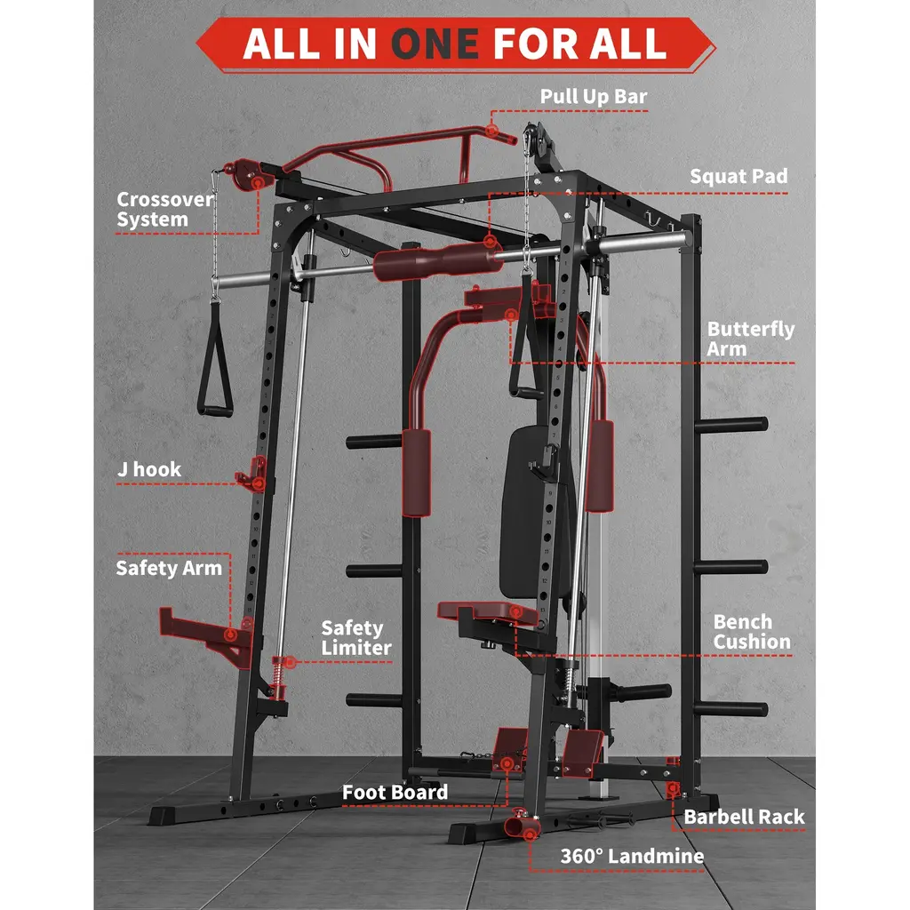 [ALL IN ONE]: This Smith Machine is designed to target different muscle groups, combines many functions such as Smith machine, squat rack, cable crossover machine, butterfly chest press, pull-up station, etc., You can perform exercises such as barbell bench press, butterfly chest fly, rowing, lat pulldown, squats, straight-leg deadlifts, bicep curls, tricep pushdowns, and hanging leg raises, ensuring a smooth workout experience for fitness enthusiasts of all levels.[High-Strength Durability]: Dual Smith bars made of solid steel with hard chrome plating ensure long-lasting wear resistance. The linear bearing sliding sleeves on the barbell provide smooth operation during exercises, preventing jamming and enhancing workout comfort.[Upgraded Cable System]: Use commercial-grade 7-strand cables, stronger than the 5-strand cables used in most products, and wrapped in PU on the outside, which has stronger wear resistance than ordinary PVC. Upgraded to PU pulleys, which have higher strength and toughness and will not break even under high-intensity impacts.[Enhanced Safety Features]: Adjustable safety limiters on the Smith bars with 15 positioning slots on the frame allow you to set the optimal safety position for different exercises and body types, ensuring comprehensive protection and peace of mind during every workout. The outer safety arm provides added protection for a broader range of training movements and can be transformed into a stool with the included seat cushion.[Durability and Strength]: Constructed from 2"x2" 1.6mm thick robust steel. This multifunctional home gym machine total weight capacity of 2000 lbs, and offers exceptional durability and stability, making it a reliable choice for both novice and experienced fitness enthusiasts.[NOTICE]: Our Smith machine home gym will be shipped in three packages (May not arrive at the same time) to reduce wear and tear due to collisions. If you encounter any problems during the installation process, please contact us and our professional service team will answer you promptly. Weight plates NOT included.