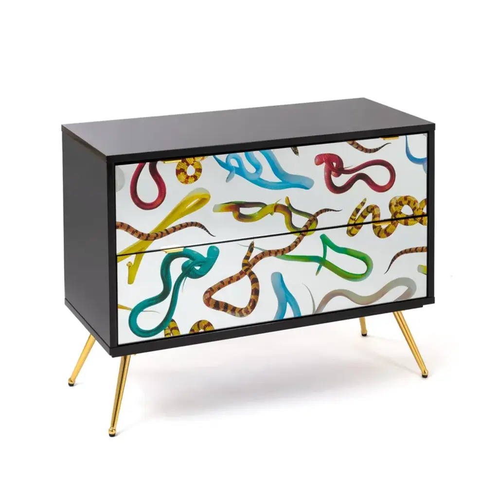Snakes is an elegant 2 drawers dresser with a mirror, made of MDF and glass, perfect for adding a touch of sophistication and functionality to your room.